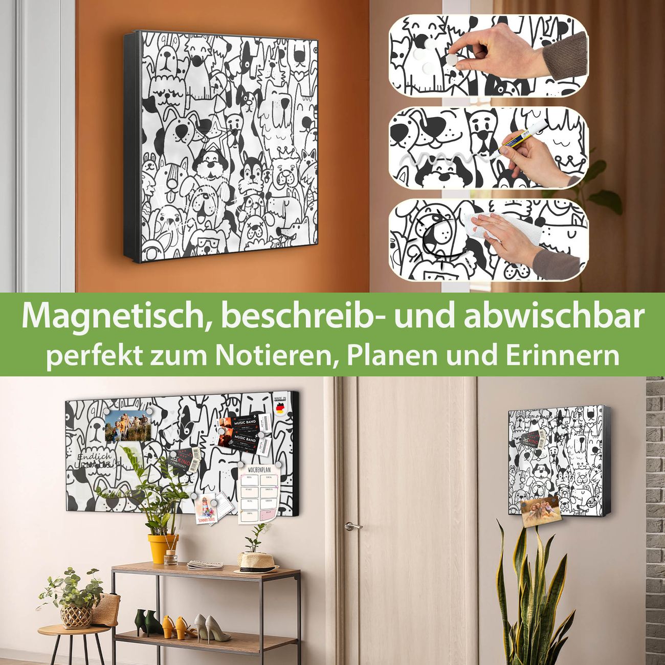 Bringe Ordnung und Eleganz in deinen Eingangsbereich mit dem banjado Schlüsselkasten Motiv Motiv Lustiges Hundemuster. Die moderne Schlüsselbox kombiniert funktionales Design mit hochwertiger Verarbeitung und wird so zu einem echten Hingucker in Flur, Büro oder Ferienwohnung. ✅ Stilvolle Schlüsselaufbewahrung mit Motiv Motiv Lustiges Hundemuster Der Design-Schlüsselkasten Motiv Motiv Lustiges Hundemuster bietet Platz für bis zu 32 Schlüssel, die auf 4 stabilen Reihen mit je 8 Haken übersichtlich verstaut werden. Mit seinen kompakten Maßen von 30 x 30 x 5 cm passt die Schlüsselbox perfekt auch in kleinere Räume. Der schwarz lackierte Stahlkorpus mit links angeschlagenem Türscharnier harmoniert mit gedruckten Folie auf der Front und fügt sich nahtlos in jedes Wohnambiente ein. Ob als Schlüsselorganizer für Zuhause oder als praktische Lösung für Büros, Praxen und Gewerbe, der banjado Schlüsselkasten sorgt für Ordnung und Übersicht. Dank der magnetischen, mit Kreidestiften beschreibbaren Folie auf der Front kannst du Notizen anheften oder Termine direkt auf der Oberfläche festhalten. Die Schlüsselbox Motiv Motiv Lustiges Hundemuster zur Wandmontage wird inklusive Befestigungsmaterial geliefert und ist schnell angebracht. So hast du deine Schlüssel jederzeit griffbereit und zugleich stilvoll verstaut. Mit diesem banjado Schlüsselkasten Motiv Motiv Lustiges Hundemuster kombinierst du praktische Aufbewahrung mit stilvollem Wohndesign. Ob privat oder geschäftlich, die Schlüsselbox sorgt für mehr Ordnung, Übersicht und ein wohnliches Ambiente.Vorteile im Überblick