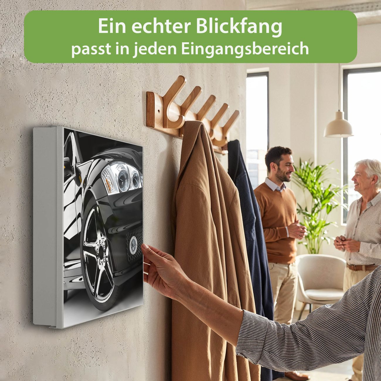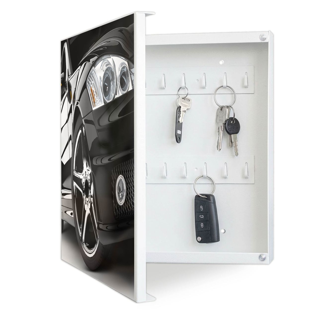 Bringe Ordnung und Eleganz in deinen Eingangsbereich mit dem banjado Schlüsselkasten Motiv Motiv Luxus Car. Die moderne Schlüsselbox kombiniert funktionales Design mit hochwertiger Verarbeitung und wird so zu einem echten Hingucker in Flur, Büro oder Ferienwohnung. ✅ Stilvolle Schlüsselaufbewahrung mit Motiv Motiv Luxus Car Der Design-Schlüsselkasten Motiv Motiv Luxus Car bietet Platz für bis zu 32 Schlüssel, die auf 4 stabilen Reihen mit je 8 Haken übersichtlich verstaut werden. Mit seinen kompakten Maßen von 30 x 30 x 5 cm passt die Schlüsselbox perfekt auch in kleinere Räume. Der weiß lackierte Stahlkorpus mit links angeschlagenem Türscharnier harmoniert mit gedruckten Folie auf der Front und fügt sich nahtlos in jedes Wohnambiente ein. Ob als Schlüsselorganizer für Zuhause oder als praktische Lösung für Büros, Praxen und Gewerbe, der banjado Schlüsselkasten sorgt für Ordnung und Übersicht. Dank der magnetischen, mit Kreidestiften beschreibbaren Folie auf der Front kannst du Notizen anheften oder Termine direkt auf der Oberfläche festhalten. Die Schlüsselbox Motiv Motiv Luxus Car zur Wandmontage wird inklusive Befestigungsmaterial geliefert und ist schnell angebracht. So hast du deine Schlüssel jederzeit griffbereit und zugleich stilvoll verstaut. Mit diesem banjado Schlüsselkasten Motiv Motiv Luxus Car kombinierst du praktische Aufbewahrung mit stilvollem Wohndesign. Ob privat oder geschäftlich, die Schlüsselbox sorgt für mehr Ordnung, Übersicht und ein wohnliches Ambiente.Vorteile im Überblick