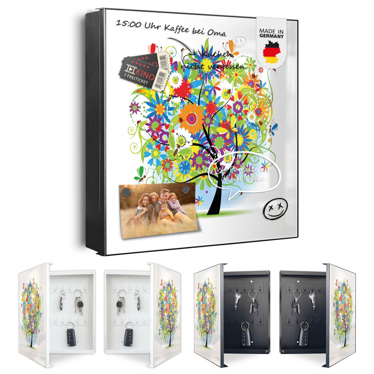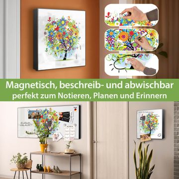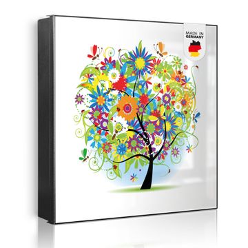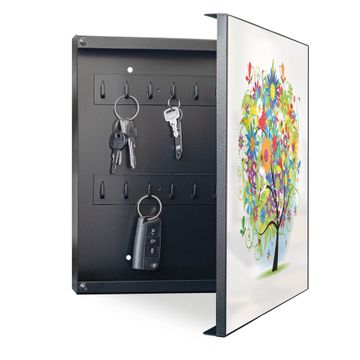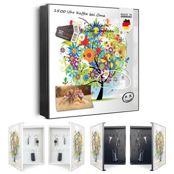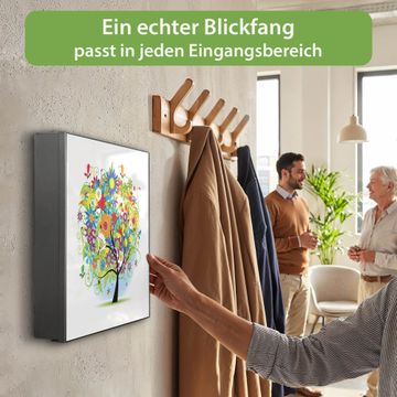 Bringe Ordnung und Eleganz in deinen Eingangsbereich mit dem banjado Schlüsselkasten Motiv Motiv Märchenzauberbaum. Die moderne Schlüsselbox kombiniert funktionales Design mit hochwertiger Verarbeitung und wird so zu einem echten Hingucker in Flur, Büro oder Ferienwohnung. ✅ Stilvolle Schlüsselaufbewahrung mit Motiv Motiv Märchenzauberbaum Der Design-Schlüsselkasten Motiv Motiv Märchenzauberbaum bietet Platz für bis zu 32 Schlüssel, die auf 4 stabilen Reihen mit je 8 Haken übersichtlich verstaut werden. Mit seinen kompakten Maßen von 30 x 30 x 5 cm passt die Schlüsselbox perfekt auch in kleinere Räume. Der schwarz lackierte Stahlkorpus mit rechts angeschlagenem Türscharnier harmoniert mit gedruckten Folie auf der Front und fügt sich nahtlos in jedes Wohnambiente ein. Ob als Schlüsselorganizer für Zuhause oder als praktische Lösung für Büros, Praxen und Gewerbe, der banjado Schlüsselkasten sorgt für Ordnung und Übersicht. Dank der magnetischen, mit Kreidestiften beschreibbaren Folie auf der Front kannst du Notizen anheften oder Termine direkt auf der Oberfläche festhalten. Die Schlüsselbox Motiv Motiv Märchenzauberbaum zur Wandmontage wird inklusive Befestigungsmaterial geliefert und ist schnell angebracht. So hast du deine Schlüssel jederzeit griffbereit und zugleich stilvoll verstaut. Mit diesem banjado Schlüsselkasten Motiv Motiv Märchenzauberbaum kombinierst du praktische Aufbewahrung mit stilvollem Wohndesign. Ob privat oder geschäftlich, die Schlüsselbox sorgt für mehr Ordnung, Übersicht und ein wohnliches Ambiente.Vorteile im Überblick