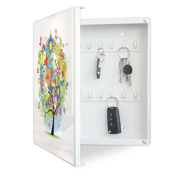 Bringe Ordnung und Eleganz in deinen Eingangsbereich mit dem banjado Schlüsselkasten Motiv Motiv Märchenzauberbaum. Die moderne Schlüsselbox kombiniert funktionales Design mit hochwertiger Verarbeitung und wird so zu einem echten Hingucker in Flur, Büro oder Ferienwohnung. ✅ Stilvolle Schlüsselaufbewahrung mit Motiv Motiv Märchenzauberbaum Der Design-Schlüsselkasten Motiv Motiv Märchenzauberbaum bietet Platz für bis zu 32 Schlüssel, die auf 4 stabilen Reihen mit je 8 Haken übersichtlich verstaut werden. Mit seinen kompakten Maßen von 30 x 30 x 5 cm passt die Schlüsselbox perfekt auch in kleinere Räume. Der weiß lackierte Stahlkorpus mit links angeschlagenem Türscharnier harmoniert mit gedruckten Folie auf der Front und fügt sich nahtlos in jedes Wohnambiente ein. Ob als Schlüsselorganizer für Zuhause oder als praktische Lösung für Büros, Praxen und Gewerbe, der banjado Schlüsselkasten sorgt für Ordnung und Übersicht. Dank der magnetischen, mit Kreidestiften beschreibbaren Folie auf der Front kannst du Notizen anheften oder Termine direkt auf der Oberfläche festhalten. Die Schlüsselbox Motiv Motiv Märchenzauberbaum zur Wandmontage wird inklusive Befestigungsmaterial geliefert und ist schnell angebracht. So hast du deine Schlüssel jederzeit griffbereit und zugleich stilvoll verstaut. Mit diesem banjado Schlüsselkasten Motiv Motiv Märchenzauberbaum kombinierst du praktische Aufbewahrung mit stilvollem Wohndesign. Ob privat oder geschäftlich, die Schlüsselbox sorgt für mehr Ordnung, Übersicht und ein wohnliches Ambiente.Vorteile im Überblick