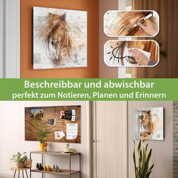 Bringe Ordnung und Eleganz in deinen Eingangsbereich mit dem banjado Schlüsselkasten Motiv Motiv Magic Horse. Die moderne Schlüsselbox kombiniert funktionales Design mit hochwertiger Verarbeitung und wird so zu einem echten Hingucker in Flur, Büro oder Ferienwohnung. ✅ Stilvolle Schlüsselaufbewahrung mit Glasfront im Motiv Motiv Magic Horse Der Design-Schlüsselkasten Motiv Motiv Magic Horse bietet Platz für bis zu 50 Schlüssel, die auf 5 stabilen Reihen mit je 10 Haken übersichtlich verstaut werden. Mit seinen kompakten Maßen von 30 x 30 x 5 cm passt die Schlüsselbox perfekt auch in kleinere Räume. Der schwarz lackierte Stahlkorpus mit rechts angeschlagenem Türscharnier harmoniert mit der Glasfront und fügt sich nahtlos in jedes Wohnambiente ein. Ob als Schlüsselorganizer für Zuhause oder als praktische Lösung für Büros, Praxen und Gewerbe, der banjado Schlüsselkasten sorgt für Ordnung und Übersicht. Dank der magnetischen, mit Kreidestiften beschreibbaren Glasfront kannst du Notizen anheften oder Termine direkt auf der Oberfläche festhalten. Die Schlüsselbox Motiv Motiv Magic Horse zur Wandmontage wird inklusive Befestigungsmaterial geliefert und ist schnell angebracht. So hast du deine Schlüssel jederzeit griffbereit und zugleich stilvoll verstaut. Mit diesem banjado Schlüsselkasten Motiv Motiv Magic Horse kombinierst du praktische Aufbewahrung mit stilvollem Wohndesign. Ob privat oder geschäftlich, die Schlüsselbox sorgt für mehr Ordnung, Übersicht und ein wohnliches Ambiente.Vorteile im Überblick