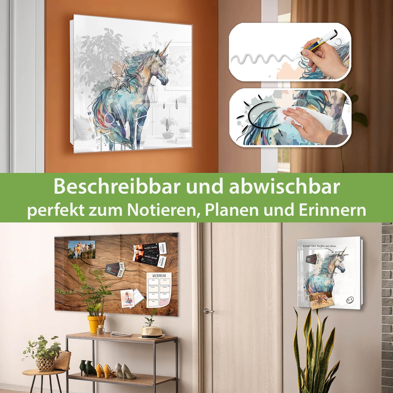 Bringe Ordnung und Eleganz in deinen Eingangsbereich mit dem banjado Schlüsselkasten Motiv Motiv Magisches Einhorn. Die moderne Schlüsselbox kombiniert funktionales Design mit hochwertiger Verarbeitung und wird so zu einem echten Hingucker in Flur, Büro oder Ferienwohnung. ✅ Stilvolle Schlüsselaufbewahrung mit Glasfront im Motiv Motiv Magisches Einhorn Der Design-Schlüsselkasten Motiv Motiv Magisches Einhorn bietet Platz für bis zu 50 Schlüssel, die auf 5 stabilen Reihen mit je 10 Haken übersichtlich verstaut werden. Mit seinen kompakten Maßen von 30 x 30 x 5 cm passt die Schlüsselbox perfekt auch in kleinere Räume. Der weiß lackierte Stahlkorpus mit rechts angeschlagenem Türscharnier harmoniert mit der Glasfront und fügt sich nahtlos in jedes Wohnambiente ein. Ob als Schlüsselorganizer für Zuhause oder als praktische Lösung für Büros, Praxen und Gewerbe, der banjado Schlüsselkasten sorgt für Ordnung und Übersicht. Dank der magnetischen, mit Kreidestiften beschreibbaren Glasfront kannst du Notizen anheften oder Termine direkt auf der Oberfläche festhalten. Die Schlüsselbox Motiv Motiv Magisches Einhorn zur Wandmontage wird inklusive Befestigungsmaterial geliefert und ist schnell angebracht. So hast du deine Schlüssel jederzeit griffbereit und zugleich stilvoll verstaut. Mit diesem banjado Schlüsselkasten Motiv Motiv Magisches Einhorn kombinierst du praktische Aufbewahrung mit stilvollem Wohndesign. Ob privat oder geschäftlich, die Schlüsselbox sorgt für mehr Ordnung, Übersicht und ein wohnliches Ambiente.Vorteile im Überblick