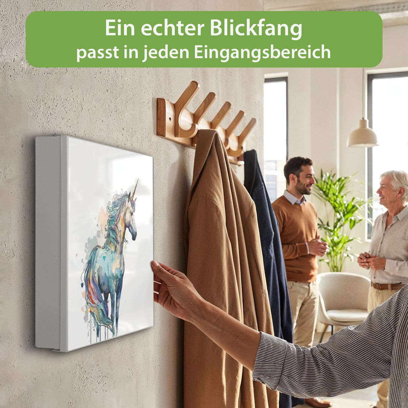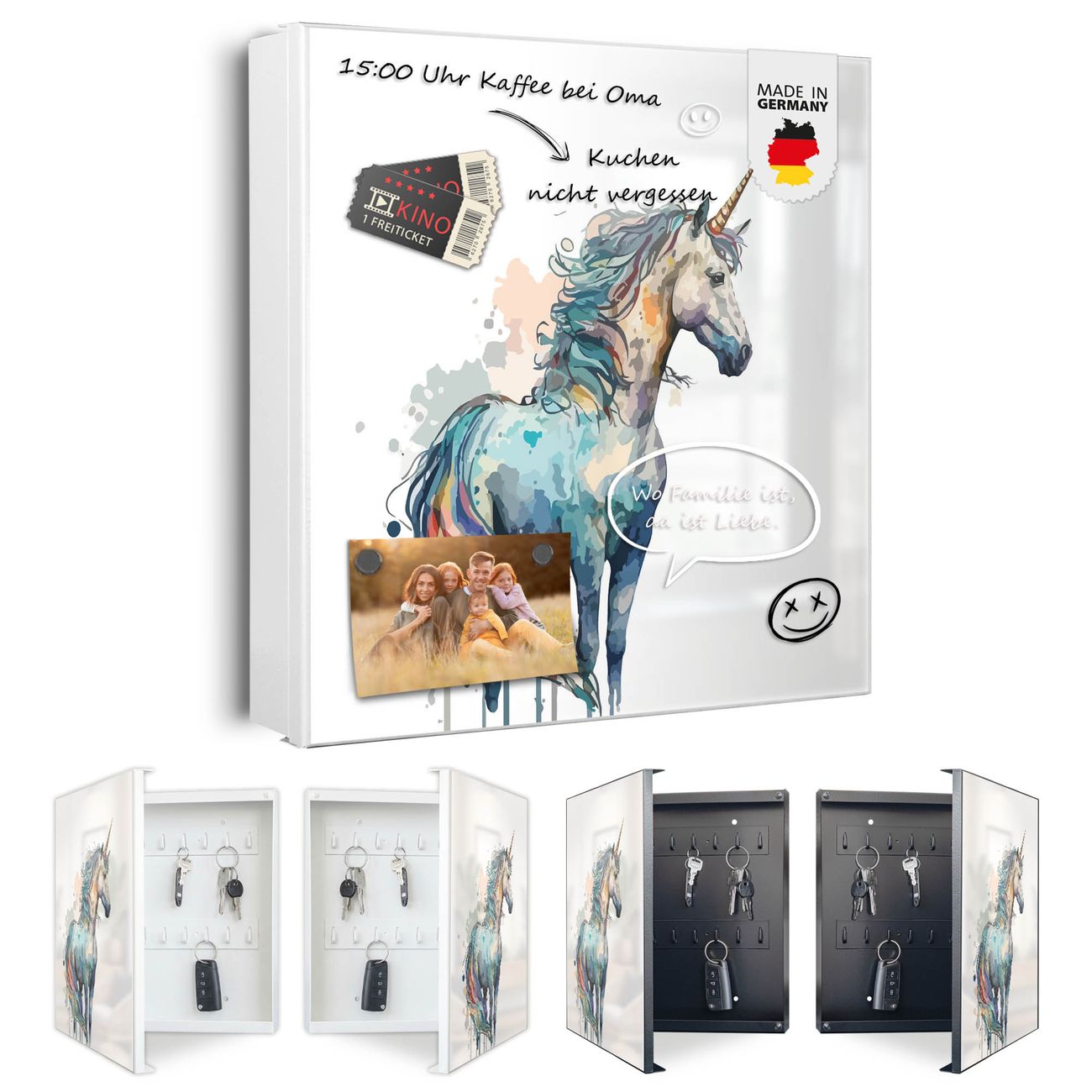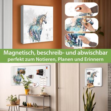 Bringe Ordnung und Eleganz in deinen Eingangsbereich mit dem banjado Schlüsselkasten Motiv Motiv Magisches Einhorn. Die moderne Schlüsselbox kombiniert funktionales Design mit hochwertiger Verarbeitung und wird so zu einem echten Hingucker in Flur, Büro oder Ferienwohnung. ✅ Stilvolle Schlüsselaufbewahrung mit Motiv Motiv Magisches Einhorn Der Design-Schlüsselkasten Motiv Motiv Magisches Einhorn bietet Platz für bis zu 32 Schlüssel, die auf 4 stabilen Reihen mit je 8 Haken übersichtlich verstaut werden. Mit seinen kompakten Maßen von 30 x 30 x 5 cm passt die Schlüsselbox perfekt auch in kleinere Räume. Der weiß lackierte Stahlkorpus mit rechts angeschlagenem Türscharnier harmoniert mit gedruckten Folie auf der Front und fügt sich nahtlos in jedes Wohnambiente ein. Ob als Schlüsselorganizer für Zuhause oder als praktische Lösung für Büros, Praxen und Gewerbe, der banjado Schlüsselkasten sorgt für Ordnung und Übersicht. Dank der magnetischen, mit Kreidestiften beschreibbaren Folie auf der Front kannst du Notizen anheften oder Termine direkt auf der Oberfläche festhalten. Die Schlüsselbox Motiv Motiv Magisches Einhorn zur Wandmontage wird inklusive Befestigungsmaterial geliefert und ist schnell angebracht. So hast du deine Schlüssel jederzeit griffbereit und zugleich stilvoll verstaut. Mit diesem banjado Schlüsselkasten Motiv Motiv Magisches Einhorn kombinierst du praktische Aufbewahrung mit stilvollem Wohndesign. Ob privat oder geschäftlich, die Schlüsselbox sorgt für mehr Ordnung, Übersicht und ein wohnliches Ambiente.Vorteile im Überblick