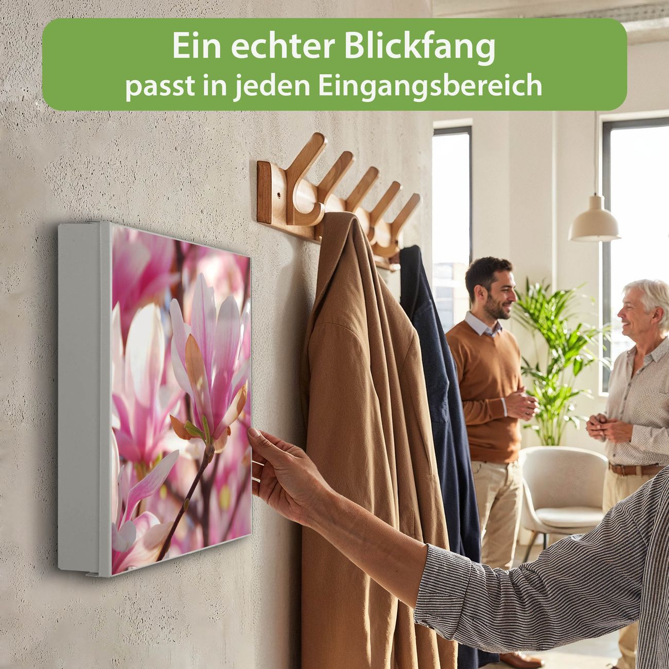 Bringe Ordnung und Eleganz in deinen Eingangsbereich mit dem banjado Schlüsselkasten Motiv Motiv Magnolia. Die moderne Schlüsselbox kombiniert funktionales Design mit hochwertiger Verarbeitung und wird so zu einem echten Hingucker in Flur, Büro oder Ferienwohnung. ✅ Stilvolle Schlüsselaufbewahrung mit Motiv Motiv Magnolia Der Design-Schlüsselkasten Motiv Motiv Magnolia bietet Platz für bis zu 32 Schlüssel, die auf 4 stabilen Reihen mit je 8 Haken übersichtlich verstaut werden. Mit seinen kompakten Maßen von 30 x 30 x 5 cm passt die Schlüsselbox perfekt auch in kleinere Räume. Der weiß lackierte Stahlkorpus mit rechts angeschlagenem Türscharnier harmoniert mit gedruckten Folie auf der Front und fügt sich nahtlos in jedes Wohnambiente ein. Ob als Schlüsselorganizer für Zuhause oder als praktische Lösung für Büros, Praxen und Gewerbe, der banjado Schlüsselkasten sorgt für Ordnung und Übersicht. Dank der magnetischen, mit Kreidestiften beschreibbaren Folie auf der Front kannst du Notizen anheften oder Termine direkt auf der Oberfläche festhalten. Die Schlüsselbox Motiv Motiv Magnolia zur Wandmontage wird inklusive Befestigungsmaterial geliefert und ist schnell angebracht. So hast du deine Schlüssel jederzeit griffbereit und zugleich stilvoll verstaut. Mit diesem banjado Schlüsselkasten Motiv Motiv Magnolia kombinierst du praktische Aufbewahrung mit stilvollem Wohndesign. Ob privat oder geschäftlich, die Schlüsselbox sorgt für mehr Ordnung, Übersicht und ein wohnliches Ambiente.Vorteile im Überblick