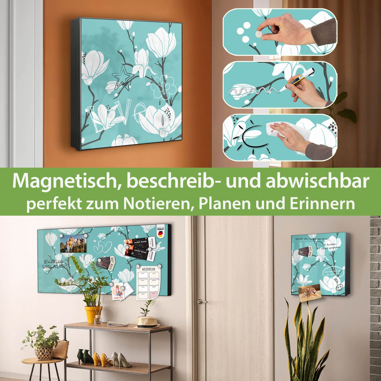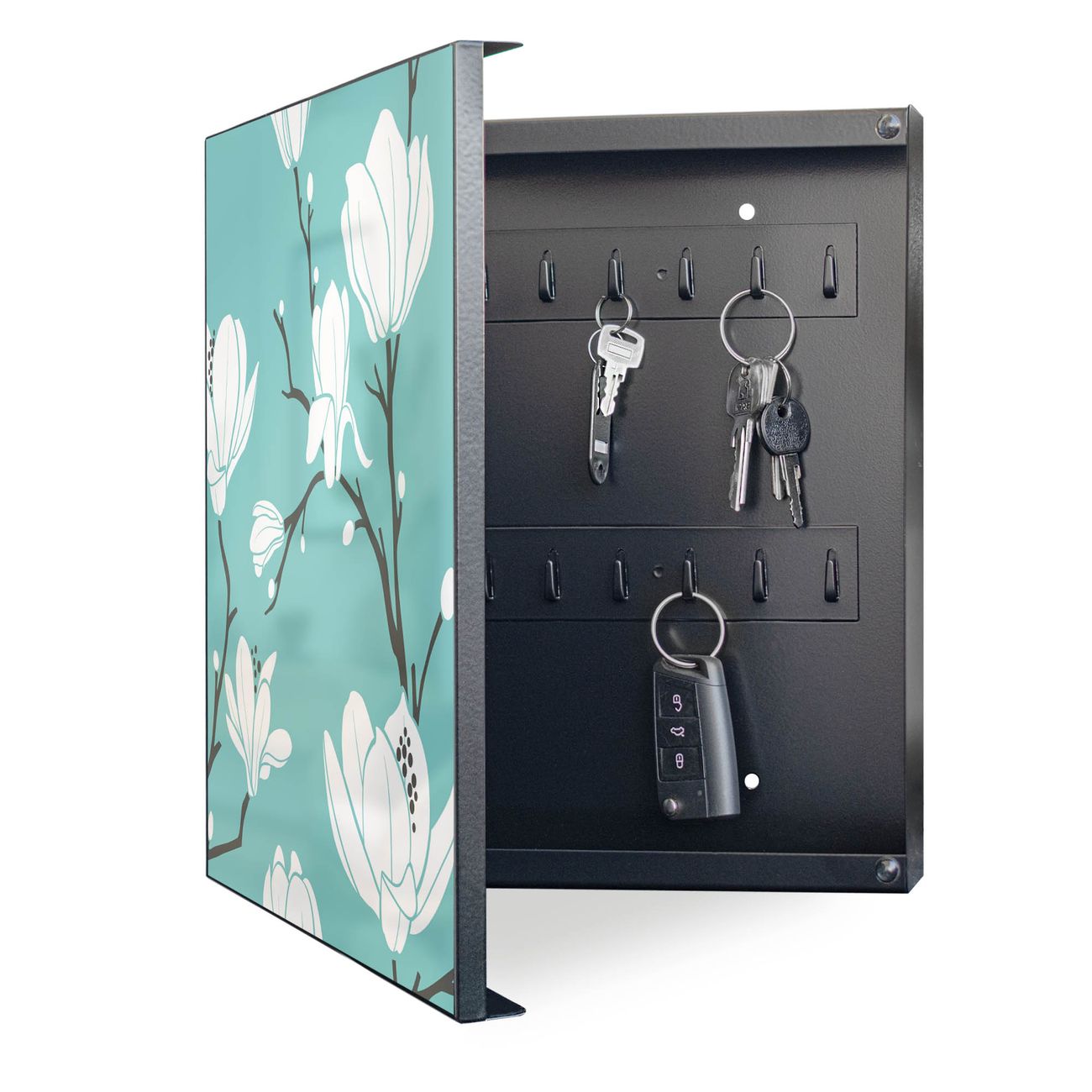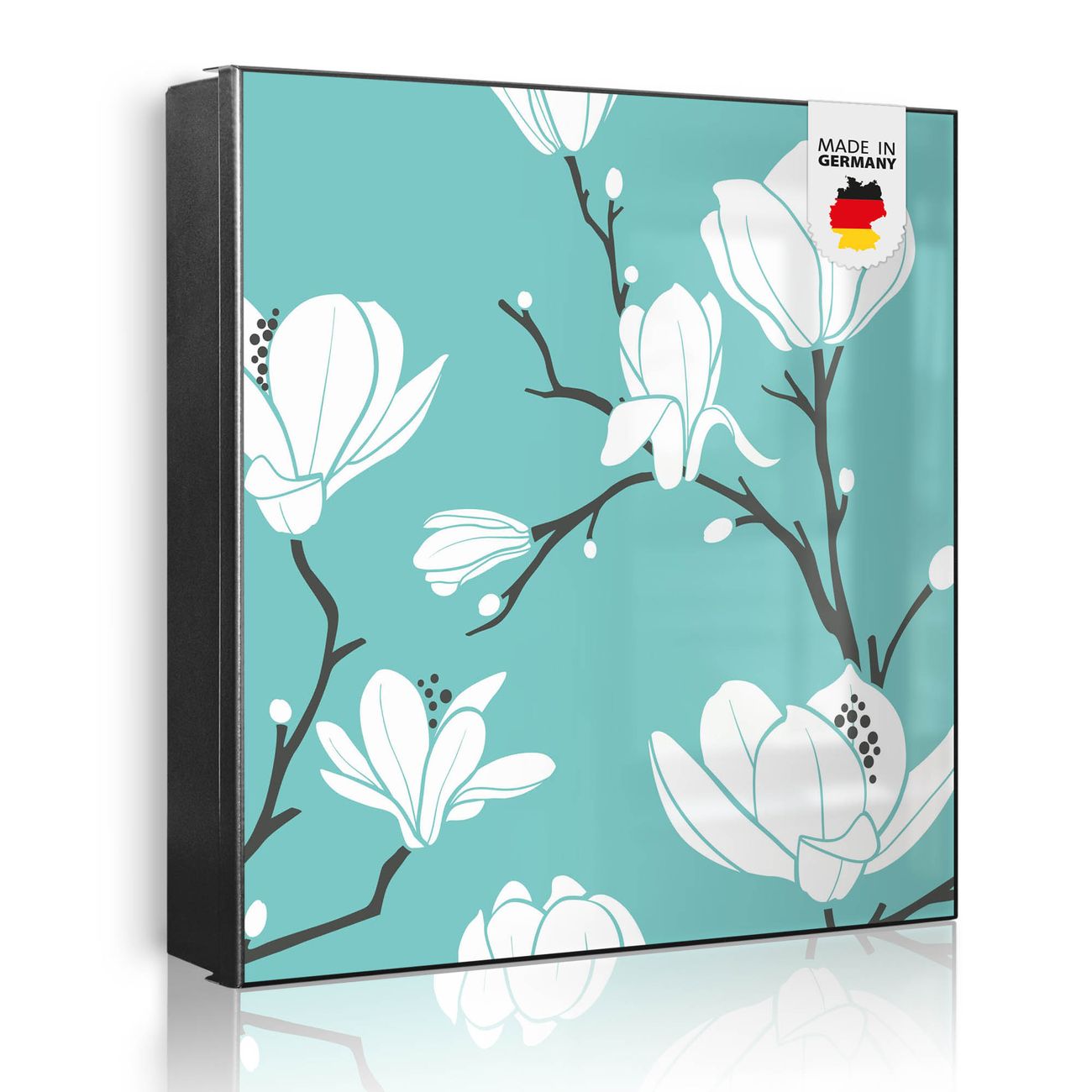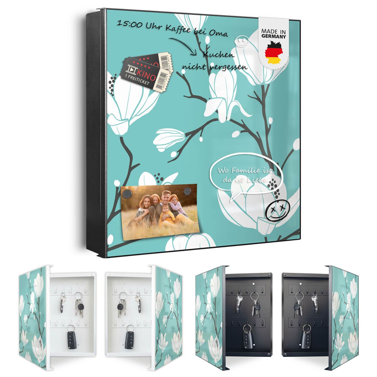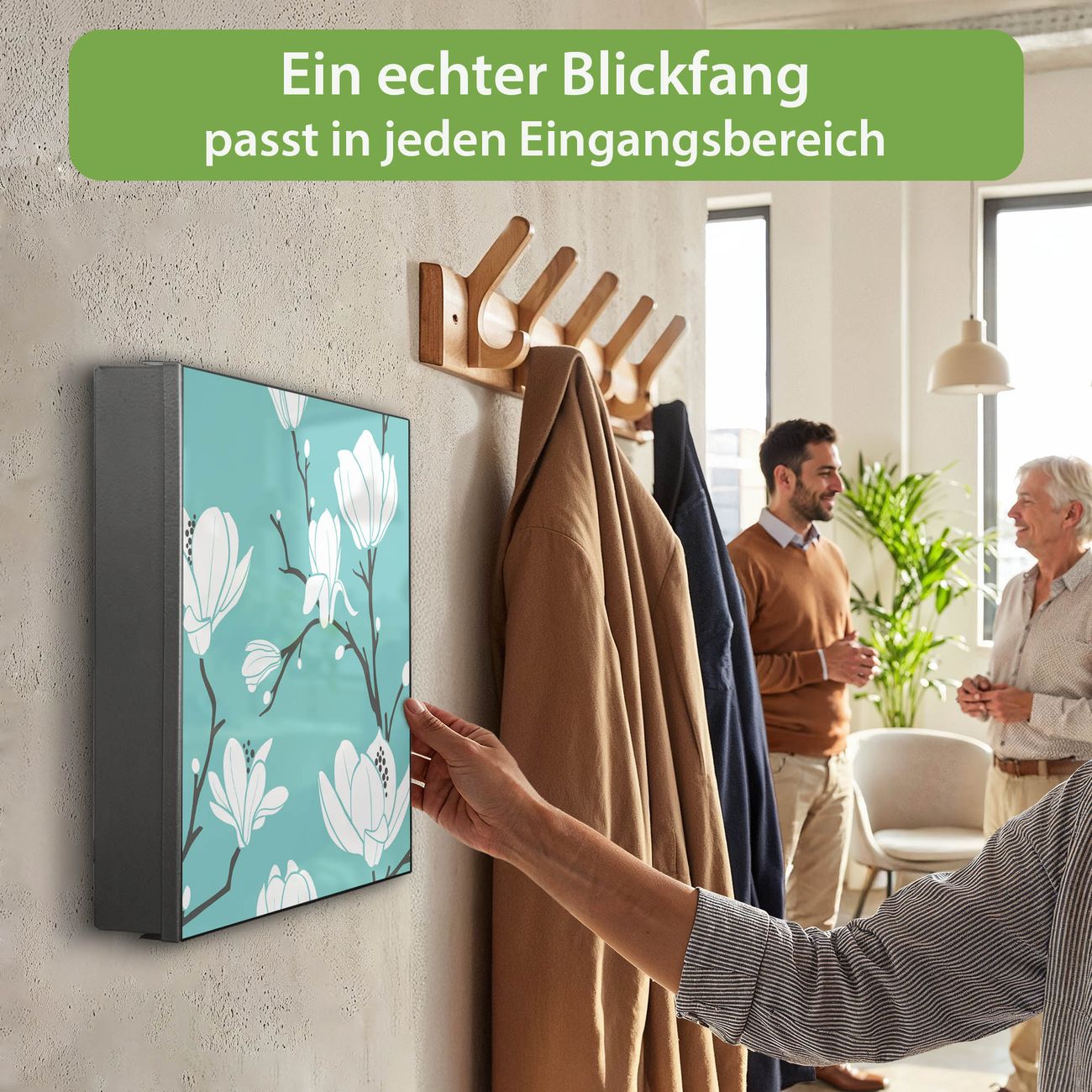 Bringe Ordnung und Eleganz in deinen Eingangsbereich mit dem banjado Schlüsselkasten Motiv Motiv Magnolien. Die moderne Schlüsselbox kombiniert funktionales Design mit hochwertiger Verarbeitung und wird so zu einem echten Hingucker in Flur, Büro oder Ferienwohnung. ✅ Stilvolle Schlüsselaufbewahrung mit Motiv Motiv Magnolien Der Design-Schlüsselkasten Motiv Motiv Magnolien bietet Platz für bis zu 32 Schlüssel, die auf 4 stabilen Reihen mit je 8 Haken übersichtlich verstaut werden. Mit seinen kompakten Maßen von 30 x 30 x 5 cm passt die Schlüsselbox perfekt auch in kleinere Räume. Der schwarz lackierte Stahlkorpus mit links angeschlagenem Türscharnier harmoniert mit gedruckten Folie auf der Front und fügt sich nahtlos in jedes Wohnambiente ein. Ob als Schlüsselorganizer für Zuhause oder als praktische Lösung für Büros, Praxen und Gewerbe, der banjado Schlüsselkasten sorgt für Ordnung und Übersicht. Dank der magnetischen, mit Kreidestiften beschreibbaren Folie auf der Front kannst du Notizen anheften oder Termine direkt auf der Oberfläche festhalten. Die Schlüsselbox Motiv Motiv Magnolien zur Wandmontage wird inklusive Befestigungsmaterial geliefert und ist schnell angebracht. So hast du deine Schlüssel jederzeit griffbereit und zugleich stilvoll verstaut. Mit diesem banjado Schlüsselkasten Motiv Motiv Magnolien kombinierst du praktische Aufbewahrung mit stilvollem Wohndesign. Ob privat oder geschäftlich, die Schlüsselbox sorgt für mehr Ordnung, Übersicht und ein wohnliches Ambiente.Vorteile im Überblick
