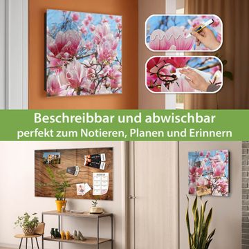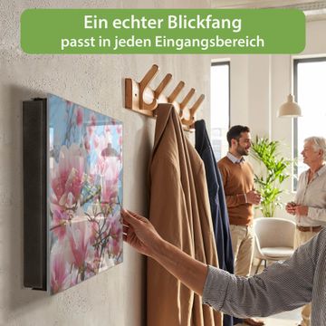 Bringe Ordnung und Eleganz in deinen Eingangsbereich mit dem banjado Schlüsselkasten Motiv Motiv Magnolienbaum. Die moderne Schlüsselbox kombiniert funktionales Design mit hochwertiger Verarbeitung und wird so zu einem echten Hingucker in Flur, Büro oder Ferienwohnung. ✅ Stilvolle Schlüsselaufbewahrung mit Glasfront im Motiv Motiv Magnolienbaum Der Design-Schlüsselkasten Motiv Motiv Magnolienbaum bietet Platz für bis zu 50 Schlüssel, die auf 5 stabilen Reihen mit je 10 Haken übersichtlich verstaut werden. Mit seinen kompakten Maßen von 30 x 30 x 5 cm passt die Schlüsselbox perfekt auch in kleinere Räume. Der schwarz lackierte Stahlkorpus mit rechts angeschlagenem Türscharnier harmoniert mit der Glasfront und fügt sich nahtlos in jedes Wohnambiente ein. Ob als Schlüsselorganizer für Zuhause oder als praktische Lösung für Büros, Praxen und Gewerbe, der banjado Schlüsselkasten sorgt für Ordnung und Übersicht. Dank der magnetischen, mit Kreidestiften beschreibbaren Glasfront kannst du Notizen anheften oder Termine direkt auf der Oberfläche festhalten. Die Schlüsselbox Motiv Motiv Magnolienbaum zur Wandmontage wird inklusive Befestigungsmaterial geliefert und ist schnell angebracht. So hast du deine Schlüssel jederzeit griffbereit und zugleich stilvoll verstaut. Mit diesem banjado Schlüsselkasten Motiv Motiv Magnolienbaum kombinierst du praktische Aufbewahrung mit stilvollem Wohndesign. Ob privat oder geschäftlich, die Schlüsselbox sorgt für mehr Ordnung, Übersicht und ein wohnliches Ambiente.Vorteile im Überblick