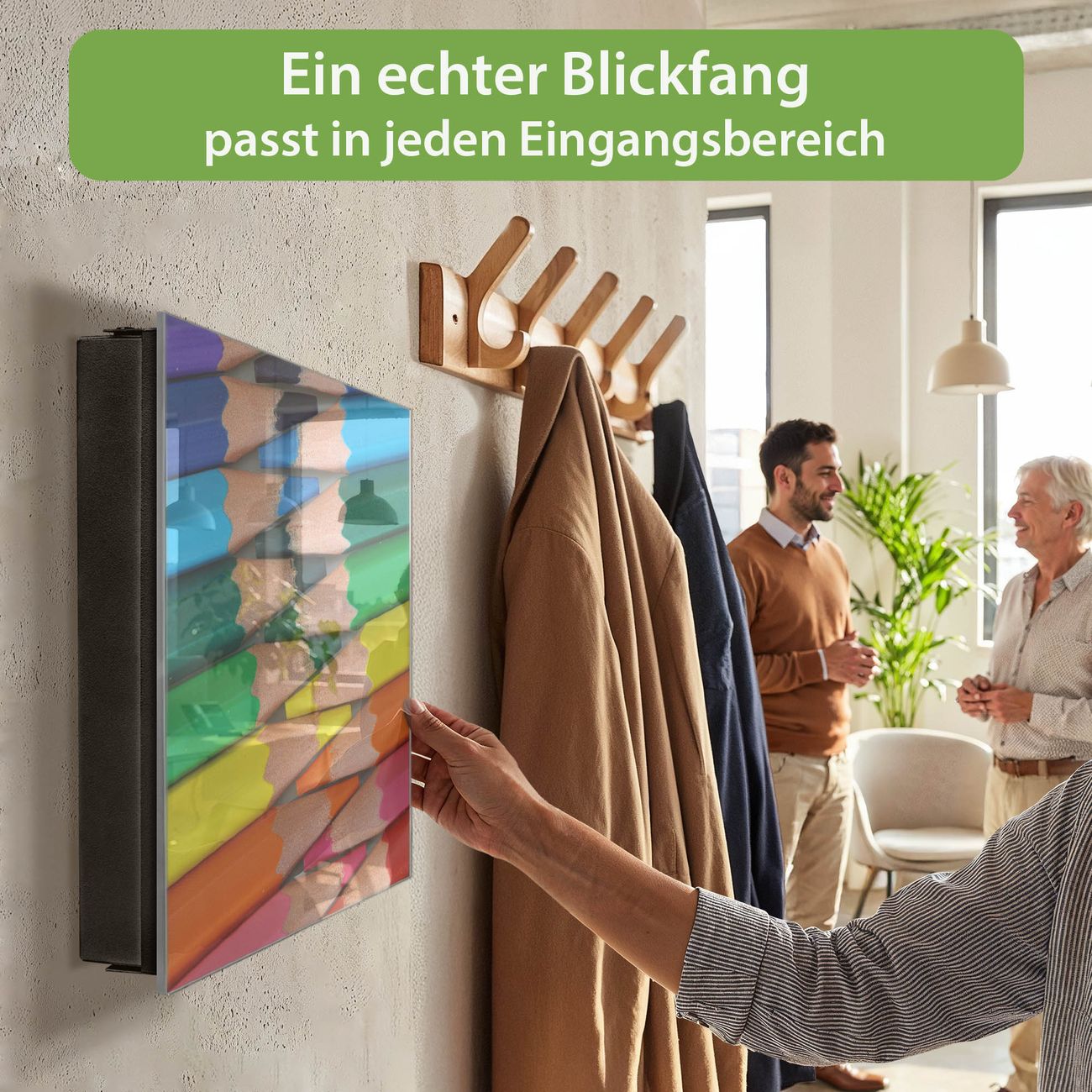 Bringe Ordnung und Eleganz in deinen Eingangsbereich mit dem banjado Schlüsselkasten Motiv Motiv Malstifte. Die moderne Schlüsselbox kombiniert funktionales Design mit hochwertiger Verarbeitung und wird so zu einem echten Hingucker in Flur, Büro oder Ferienwohnung. ✅ Stilvolle Schlüsselaufbewahrung mit Glasfront im Motiv Motiv Malstifte Der Design-Schlüsselkasten Motiv Motiv Malstifte bietet Platz für bis zu 50 Schlüssel, die auf 5 stabilen Reihen mit je 10 Haken übersichtlich verstaut werden. Mit seinen kompakten Maßen von 30 x 30 x 5 cm passt die Schlüsselbox perfekt auch in kleinere Räume. Der schwarz lackierte Stahlkorpus mit rechts angeschlagenem Türscharnier harmoniert mit der Glasfront und fügt sich nahtlos in jedes Wohnambiente ein. Ob als Schlüsselorganizer für Zuhause oder als praktische Lösung für Büros, Praxen und Gewerbe, der banjado Schlüsselkasten sorgt für Ordnung und Übersicht. Dank der magnetischen, mit Kreidestiften beschreibbaren Glasfront kannst du Notizen anheften oder Termine direkt auf der Oberfläche festhalten. Die Schlüsselbox Motiv Motiv Malstifte zur Wandmontage wird inklusive Befestigungsmaterial geliefert und ist schnell angebracht. So hast du deine Schlüssel jederzeit griffbereit und zugleich stilvoll verstaut. Mit diesem banjado Schlüsselkasten Motiv Motiv Malstifte kombinierst du praktische Aufbewahrung mit stilvollem Wohndesign. Ob privat oder geschäftlich, die Schlüsselbox sorgt für mehr Ordnung, Übersicht und ein wohnliches Ambiente.Vorteile im Überblick