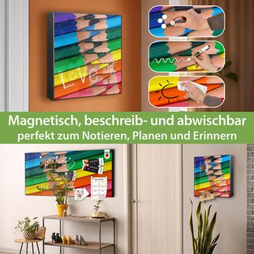 Bringe Ordnung und Eleganz in deinen Eingangsbereich mit dem banjado Schlüsselkasten Motiv Motiv Malstifte. Die moderne Schlüsselbox kombiniert funktionales Design mit hochwertiger Verarbeitung und wird so zu einem echten Hingucker in Flur, Büro oder Ferienwohnung. ✅ Stilvolle Schlüsselaufbewahrung mit Motiv Motiv Malstifte Der Design-Schlüsselkasten Motiv Motiv Malstifte bietet Platz für bis zu 32 Schlüssel, die auf 4 stabilen Reihen mit je 8 Haken übersichtlich verstaut werden. Mit seinen kompakten Maßen von 30 x 30 x 5 cm passt die Schlüsselbox perfekt auch in kleinere Räume. Der schwarz lackierte Stahlkorpus mit links angeschlagenem Türscharnier harmoniert mit gedruckten Folie auf der Front und fügt sich nahtlos in jedes Wohnambiente ein. Ob als Schlüsselorganizer für Zuhause oder als praktische Lösung für Büros, Praxen und Gewerbe, der banjado Schlüsselkasten sorgt für Ordnung und Übersicht. Dank der magnetischen, mit Kreidestiften beschreibbaren Folie auf der Front kannst du Notizen anheften oder Termine direkt auf der Oberfläche festhalten. Die Schlüsselbox Motiv Motiv Malstifte zur Wandmontage wird inklusive Befestigungsmaterial geliefert und ist schnell angebracht. So hast du deine Schlüssel jederzeit griffbereit und zugleich stilvoll verstaut. Mit diesem banjado Schlüsselkasten Motiv Motiv Malstifte kombinierst du praktische Aufbewahrung mit stilvollem Wohndesign. Ob privat oder geschäftlich, die Schlüsselbox sorgt für mehr Ordnung, Übersicht und ein wohnliches Ambiente.Vorteile im Überblick