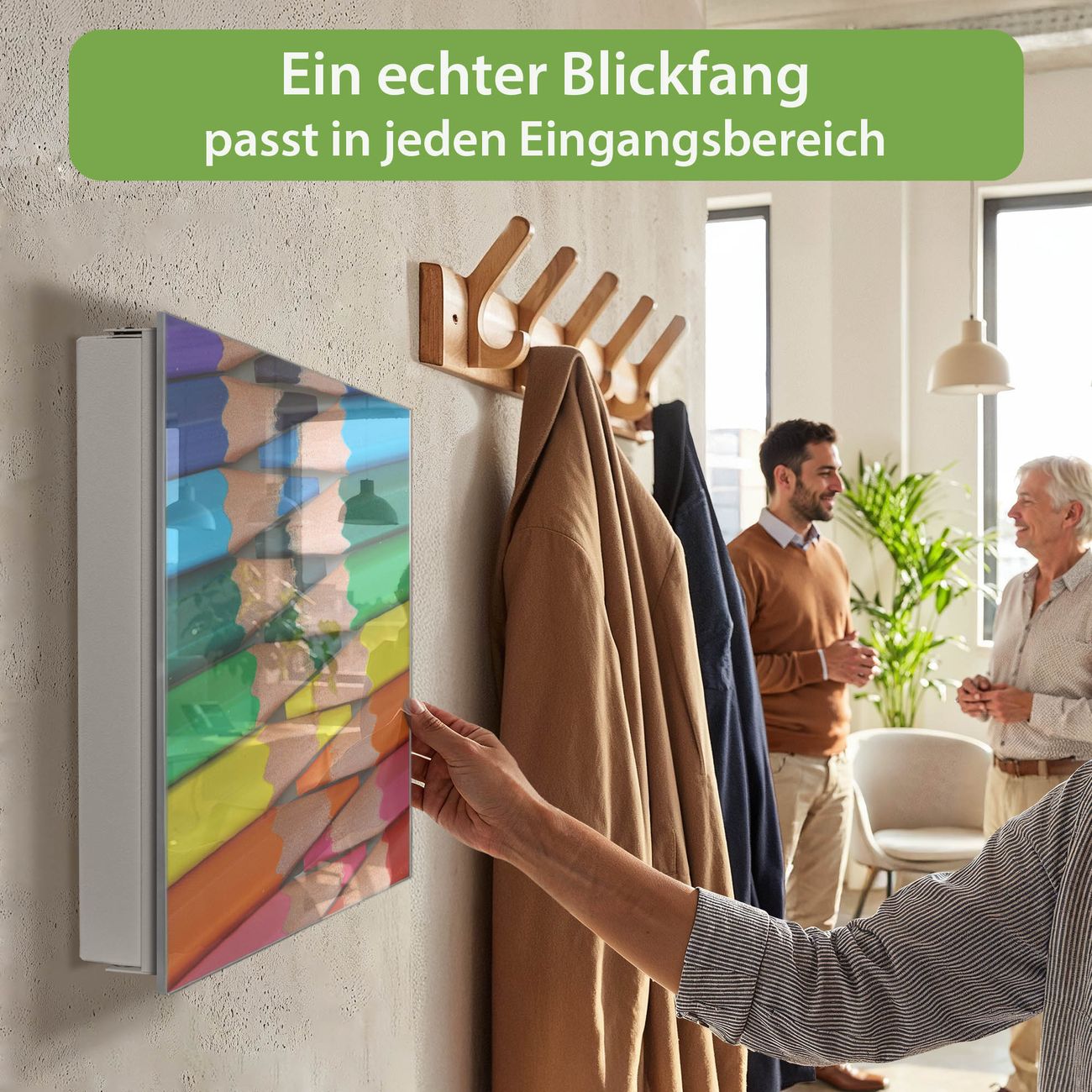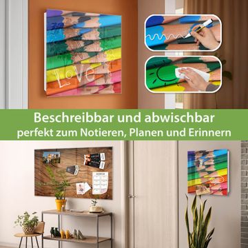 Bringe Ordnung und Eleganz in deinen Eingangsbereich mit dem banjado Schlüsselkasten Motiv Motiv Malstifte. Die moderne Schlüsselbox kombiniert funktionales Design mit hochwertiger Verarbeitung und wird so zu einem echten Hingucker in Flur, Büro oder Ferienwohnung. ✅ Stilvolle Schlüsselaufbewahrung mit Glasfront im Motiv Motiv Malstifte Der Design-Schlüsselkasten Motiv Motiv Malstifte bietet Platz für bis zu 50 Schlüssel, die auf 5 stabilen Reihen mit je 10 Haken übersichtlich verstaut werden. Mit seinen kompakten Maßen von 30 x 30 x 5 cm passt die Schlüsselbox perfekt auch in kleinere Räume. Der weiß lackierte Stahlkorpus mit rechts angeschlagenem Türscharnier harmoniert mit der Glasfront und fügt sich nahtlos in jedes Wohnambiente ein. Ob als Schlüsselorganizer für Zuhause oder als praktische Lösung für Büros, Praxen und Gewerbe, der banjado Schlüsselkasten sorgt für Ordnung und Übersicht. Dank der magnetischen, mit Kreidestiften beschreibbaren Glasfront kannst du Notizen anheften oder Termine direkt auf der Oberfläche festhalten. Die Schlüsselbox Motiv Motiv Malstifte zur Wandmontage wird inklusive Befestigungsmaterial geliefert und ist schnell angebracht. So hast du deine Schlüssel jederzeit griffbereit und zugleich stilvoll verstaut. Mit diesem banjado Schlüsselkasten Motiv Motiv Malstifte kombinierst du praktische Aufbewahrung mit stilvollem Wohndesign. Ob privat oder geschäftlich, die Schlüsselbox sorgt für mehr Ordnung, Übersicht und ein wohnliches Ambiente.Vorteile im Überblick