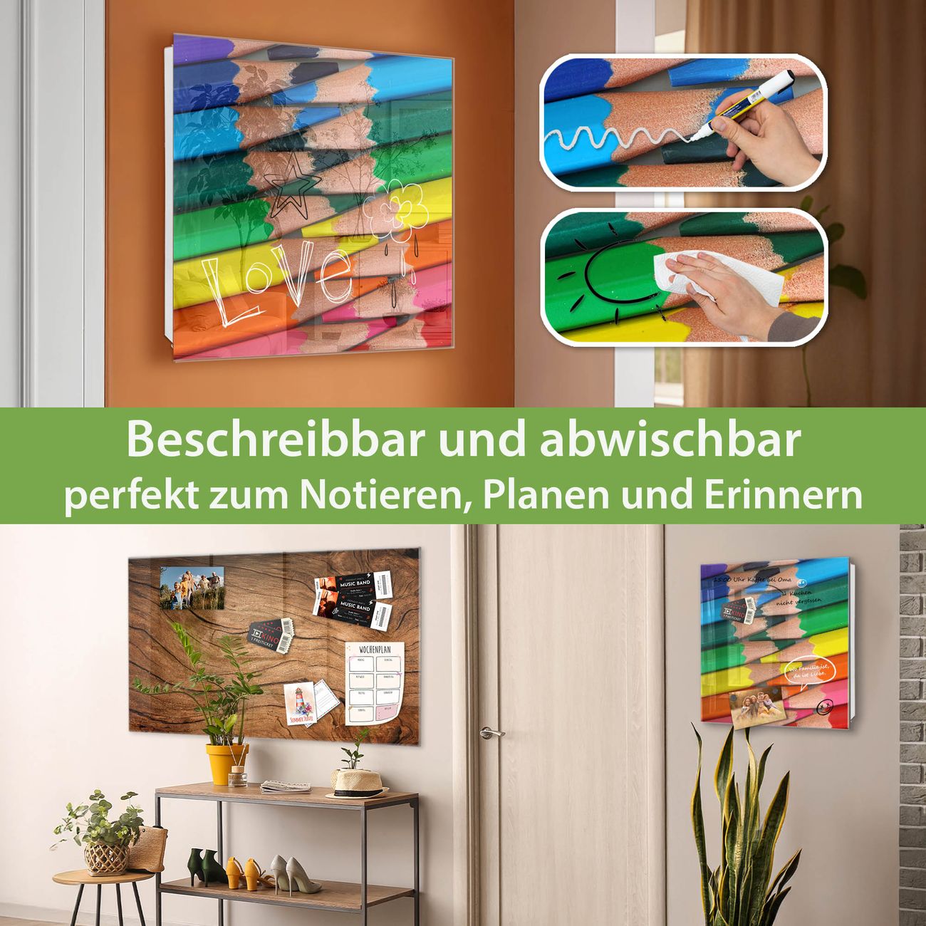 ✅ Magnetisch und mit Kreidestift beschreibbar, gehärtetes Glas, rechts angeschlagene TürOrdnung und Design in einem