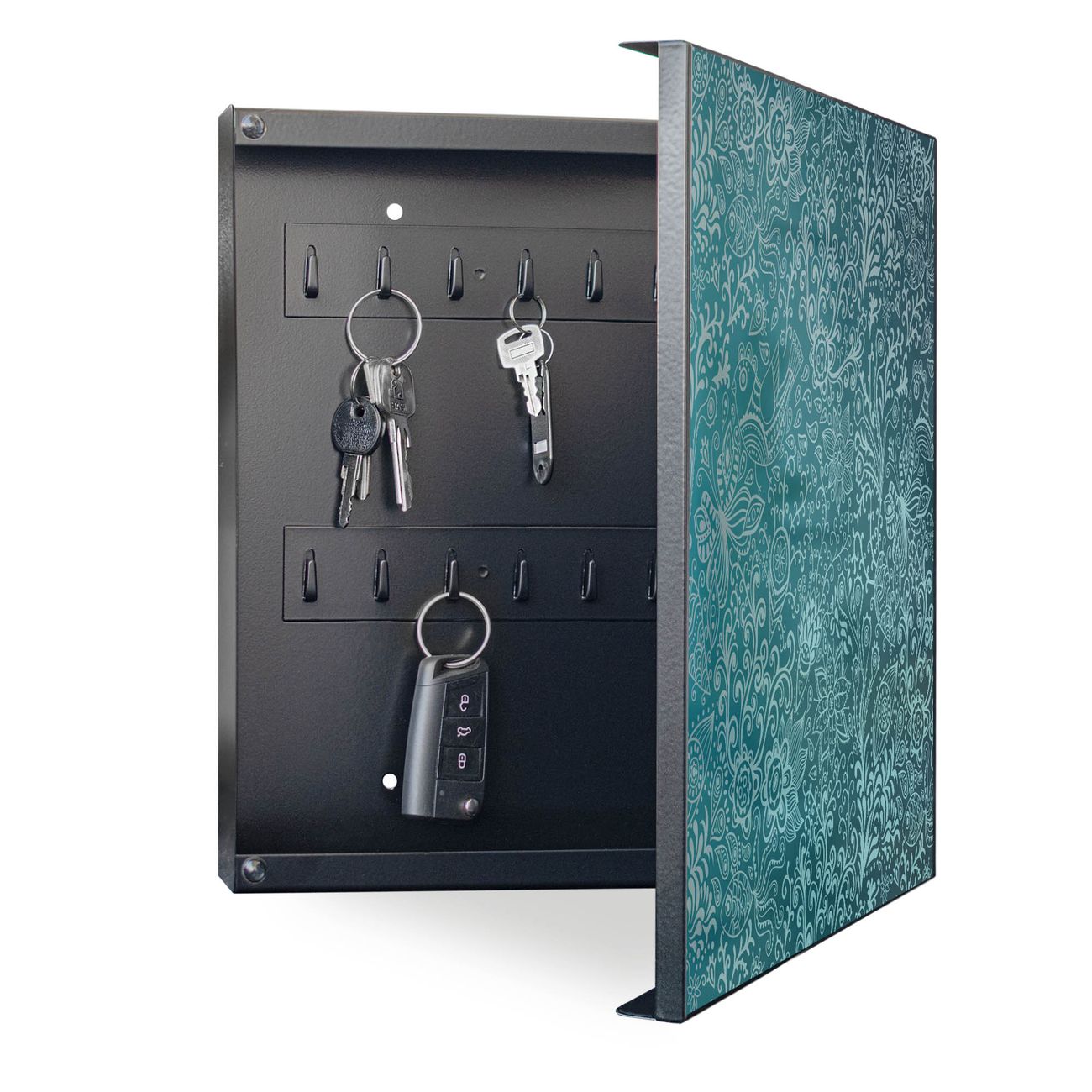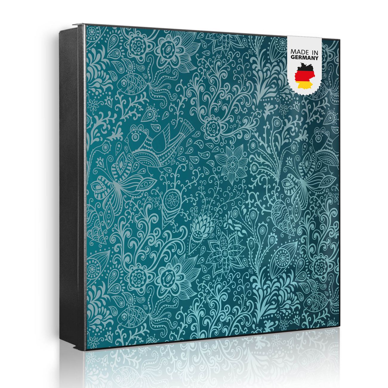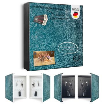 Bringe Ordnung und Eleganz in deinen Eingangsbereich mit dem banjado Schlüsselkasten Motiv Motiv Mandala Landschaft. Die moderne Schlüsselbox kombiniert funktionales Design mit hochwertiger Verarbeitung und wird so zu einem echten Hingucker in Flur, Büro oder Ferienwohnung. ✅ Stilvolle Schlüsselaufbewahrung mit Motiv Motiv Mandala Landschaft Der Design-Schlüsselkasten Motiv Motiv Mandala Landschaft bietet Platz für bis zu 32 Schlüssel, die auf 4 stabilen Reihen mit je 8 Haken übersichtlich verstaut werden. Mit seinen kompakten Maßen von 30 x 30 x 5 cm passt die Schlüsselbox perfekt auch in kleinere Räume. Der schwarz lackierte Stahlkorpus mit rechts angeschlagenem Türscharnier harmoniert mit gedruckten Folie auf der Front und fügt sich nahtlos in jedes Wohnambiente ein. Ob als Schlüsselorganizer für Zuhause oder als praktische Lösung für Büros, Praxen und Gewerbe, der banjado Schlüsselkasten sorgt für Ordnung und Übersicht. Dank der magnetischen, mit Kreidestiften beschreibbaren Folie auf der Front kannst du Notizen anheften oder Termine direkt auf der Oberfläche festhalten. Die Schlüsselbox Motiv Motiv Mandala Landschaft zur Wandmontage wird inklusive Befestigungsmaterial geliefert und ist schnell angebracht. So hast du deine Schlüssel jederzeit griffbereit und zugleich stilvoll verstaut. Mit diesem banjado Schlüsselkasten Motiv Motiv Mandala Landschaft kombinierst du praktische Aufbewahrung mit stilvollem Wohndesign. Ob privat oder geschäftlich, die Schlüsselbox sorgt für mehr Ordnung, Übersicht und ein wohnliches Ambiente.Vorteile im Überblick