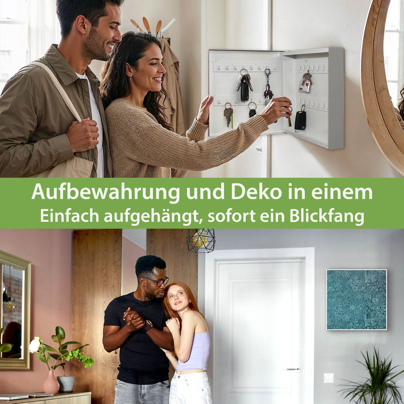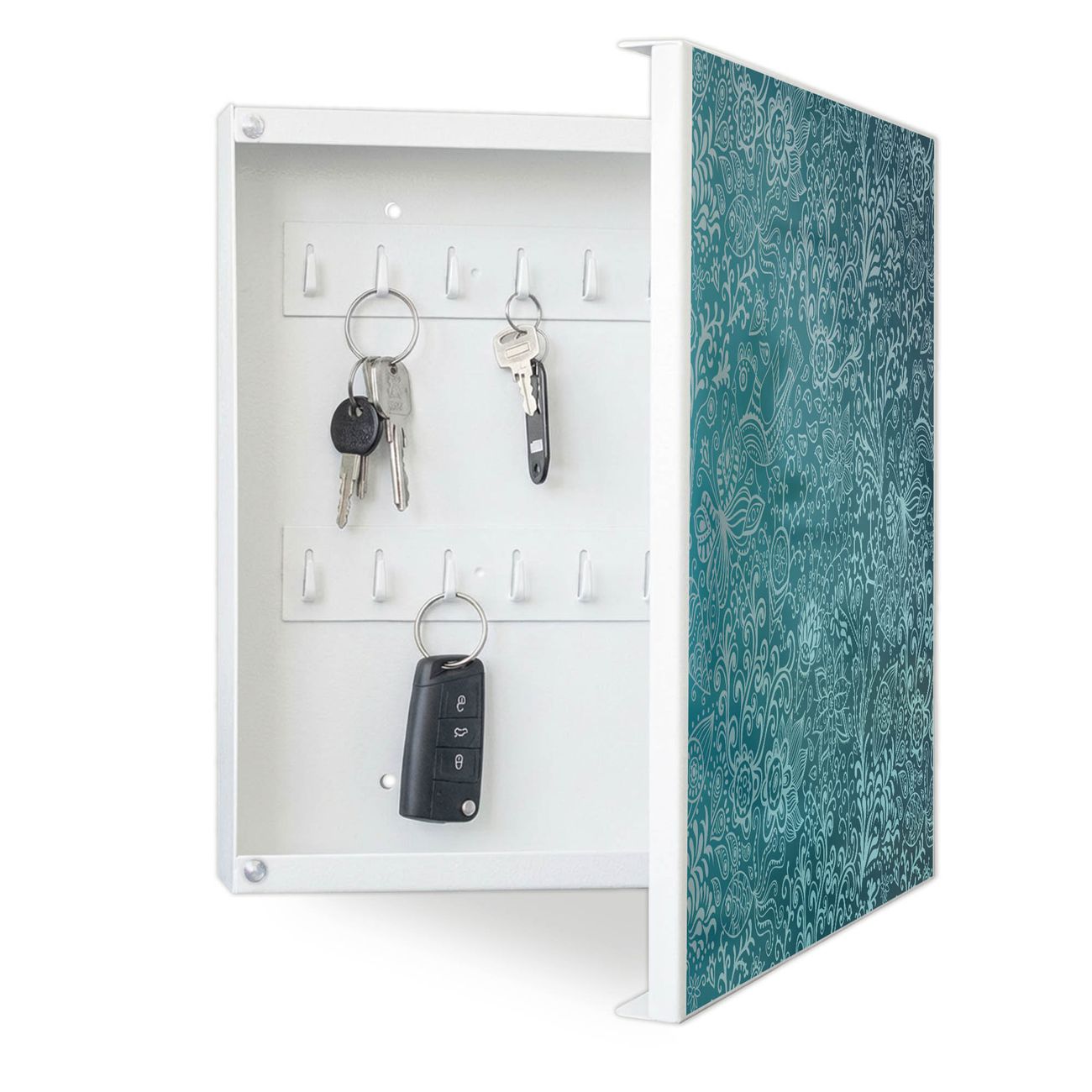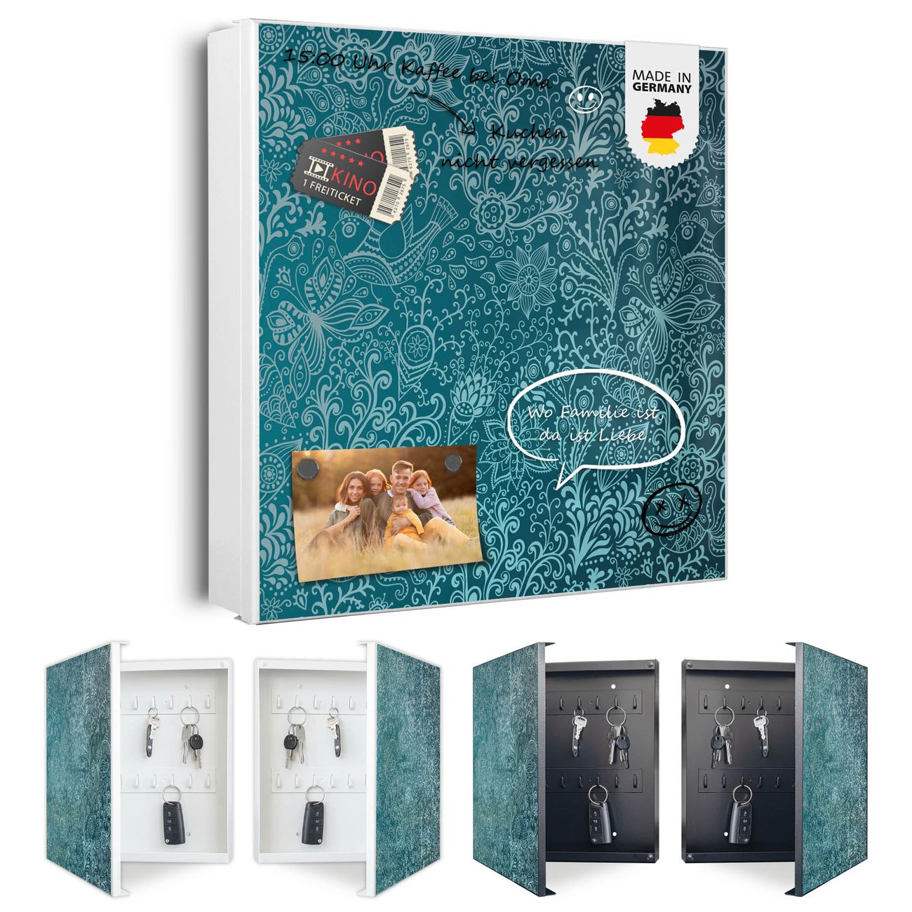 Bringe Ordnung und Eleganz in deinen Eingangsbereich mit dem banjado Schlüsselkasten Motiv Motiv Mandala Landschaft. Die moderne Schlüsselbox kombiniert funktionales Design mit hochwertiger Verarbeitung und wird so zu einem echten Hingucker in Flur, Büro oder Ferienwohnung. ✅ Stilvolle Schlüsselaufbewahrung mit Motiv Motiv Mandala Landschaft Der Design-Schlüsselkasten Motiv Motiv Mandala Landschaft bietet Platz für bis zu 32 Schlüssel, die auf 4 stabilen Reihen mit je 8 Haken übersichtlich verstaut werden. Mit seinen kompakten Maßen von 30 x 30 x 5 cm passt die Schlüsselbox perfekt auch in kleinere Räume. Der weiß lackierte Stahlkorpus mit rechts angeschlagenem Türscharnier harmoniert mit gedruckten Folie auf der Front und fügt sich nahtlos in jedes Wohnambiente ein. Ob als Schlüsselorganizer für Zuhause oder als praktische Lösung für Büros, Praxen und Gewerbe, der banjado Schlüsselkasten sorgt für Ordnung und Übersicht. Dank der magnetischen, mit Kreidestiften beschreibbaren Folie auf der Front kannst du Notizen anheften oder Termine direkt auf der Oberfläche festhalten. Die Schlüsselbox Motiv Motiv Mandala Landschaft zur Wandmontage wird inklusive Befestigungsmaterial geliefert und ist schnell angebracht. So hast du deine Schlüssel jederzeit griffbereit und zugleich stilvoll verstaut. Mit diesem banjado Schlüsselkasten Motiv Motiv Mandala Landschaft kombinierst du praktische Aufbewahrung mit stilvollem Wohndesign. Ob privat oder geschäftlich, die Schlüsselbox sorgt für mehr Ordnung, Übersicht und ein wohnliches Ambiente.Vorteile im Überblick