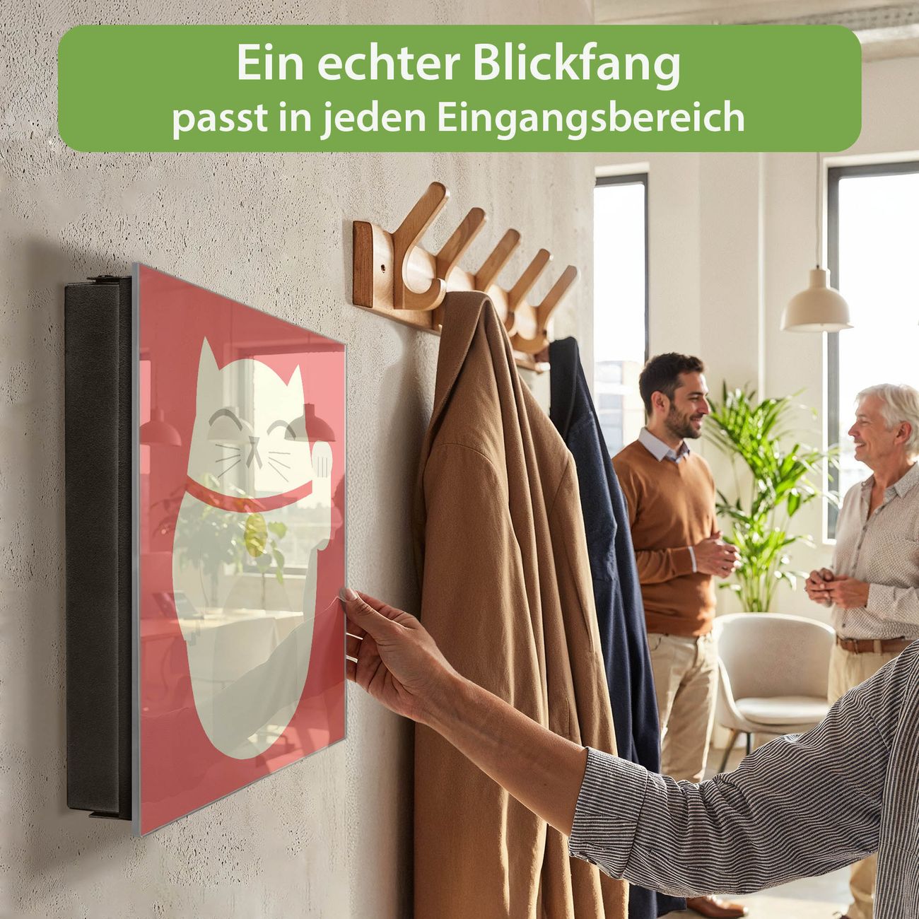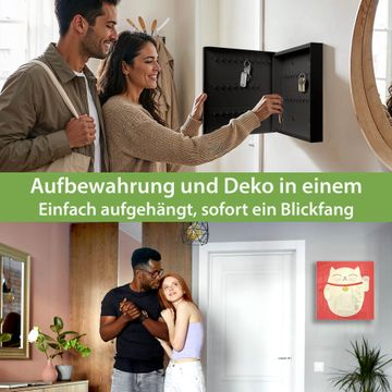 Bringe Ordnung und Eleganz in deinen Eingangsbereich mit dem banjado Schlüsselkasten Motiv Motiv Manekineko. Die moderne Schlüsselbox kombiniert funktionales Design mit hochwertiger Verarbeitung und wird so zu einem echten Hingucker in Flur, Büro oder Ferienwohnung. ✅ Stilvolle Schlüsselaufbewahrung mit Glasfront im Motiv Motiv Manekineko Der Design-Schlüsselkasten Motiv Motiv Manekineko bietet Platz für bis zu 50 Schlüssel, die auf 5 stabilen Reihen mit je 10 Haken übersichtlich verstaut werden. Mit seinen kompakten Maßen von 30 x 30 x 5 cm passt die Schlüsselbox perfekt auch in kleinere Räume. Der schwarz lackierte Stahlkorpus mit rechts angeschlagenem Türscharnier harmoniert mit der Glasfront und fügt sich nahtlos in jedes Wohnambiente ein. Ob als Schlüsselorganizer für Zuhause oder als praktische Lösung für Büros, Praxen und Gewerbe, der banjado Schlüsselkasten sorgt für Ordnung und Übersicht. Dank der magnetischen, mit Kreidestiften beschreibbaren Glasfront kannst du Notizen anheften oder Termine direkt auf der Oberfläche festhalten. Die Schlüsselbox Motiv Motiv Manekineko zur Wandmontage wird inklusive Befestigungsmaterial geliefert und ist schnell angebracht. So hast du deine Schlüssel jederzeit griffbereit und zugleich stilvoll verstaut. Mit diesem banjado Schlüsselkasten Motiv Motiv Manekineko kombinierst du praktische Aufbewahrung mit stilvollem Wohndesign. Ob privat oder geschäftlich, die Schlüsselbox sorgt für mehr Ordnung, Übersicht und ein wohnliches Ambiente.Vorteile im Überblick
