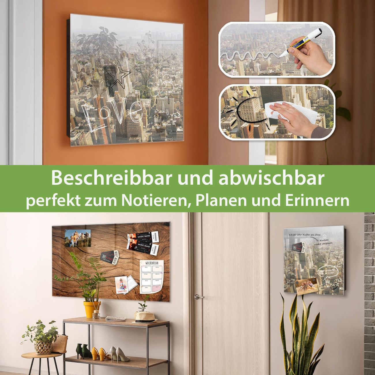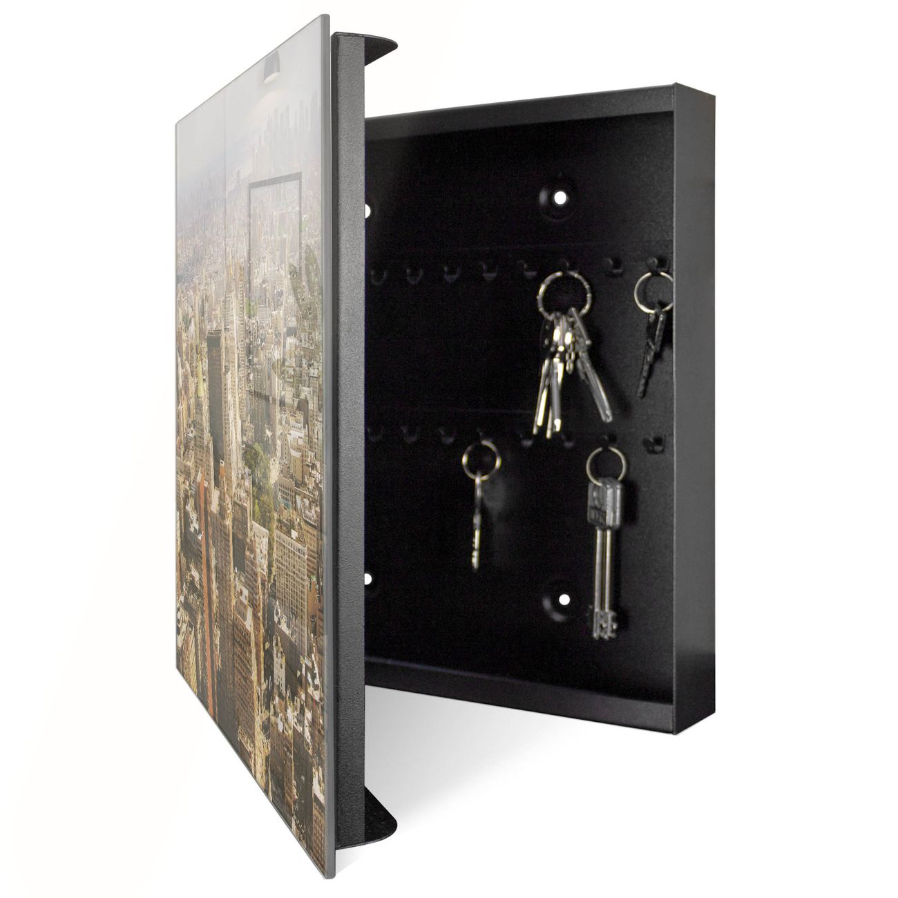 Bringe Ordnung und Eleganz in deinen Eingangsbereich mit dem banjado Schlüsselkasten Motiv Motiv Manhattan 1. Die moderne Schlüsselbox kombiniert funktionales Design mit hochwertiger Verarbeitung und wird so zu einem echten Hingucker in Flur, Büro oder Ferienwohnung. ✅ Stilvolle Schlüsselaufbewahrung mit Glasfront im Motiv Motiv Manhattan 1 Der Design-Schlüsselkasten Motiv Motiv Manhattan 1 bietet Platz für bis zu 50 Schlüssel, die auf 5 stabilen Reihen mit je 10 Haken übersichtlich verstaut werden. Mit seinen kompakten Maßen von 30 x 30 x 5 cm passt die Schlüsselbox perfekt auch in kleinere Räume. Der schwarz lackierte Stahlkorpus mit rechts angeschlagenem Türscharnier harmoniert mit der Glasfront und fügt sich nahtlos in jedes Wohnambiente ein. Ob als Schlüsselorganizer für Zuhause oder als praktische Lösung für Büros, Praxen und Gewerbe, der banjado Schlüsselkasten sorgt für Ordnung und Übersicht. Dank der magnetischen, mit Kreidestiften beschreibbaren Glasfront kannst du Notizen anheften oder Termine direkt auf der Oberfläche festhalten. Die Schlüsselbox Motiv Motiv Manhattan 1 zur Wandmontage wird inklusive Befestigungsmaterial geliefert und ist schnell angebracht. So hast du deine Schlüssel jederzeit griffbereit und zugleich stilvoll verstaut. Mit diesem banjado Schlüsselkasten Motiv Motiv Manhattan 1 kombinierst du praktische Aufbewahrung mit stilvollem Wohndesign. Ob privat oder geschäftlich, die Schlüsselbox sorgt für mehr Ordnung, Übersicht und ein wohnliches Ambiente.Vorteile im Überblick