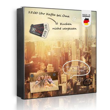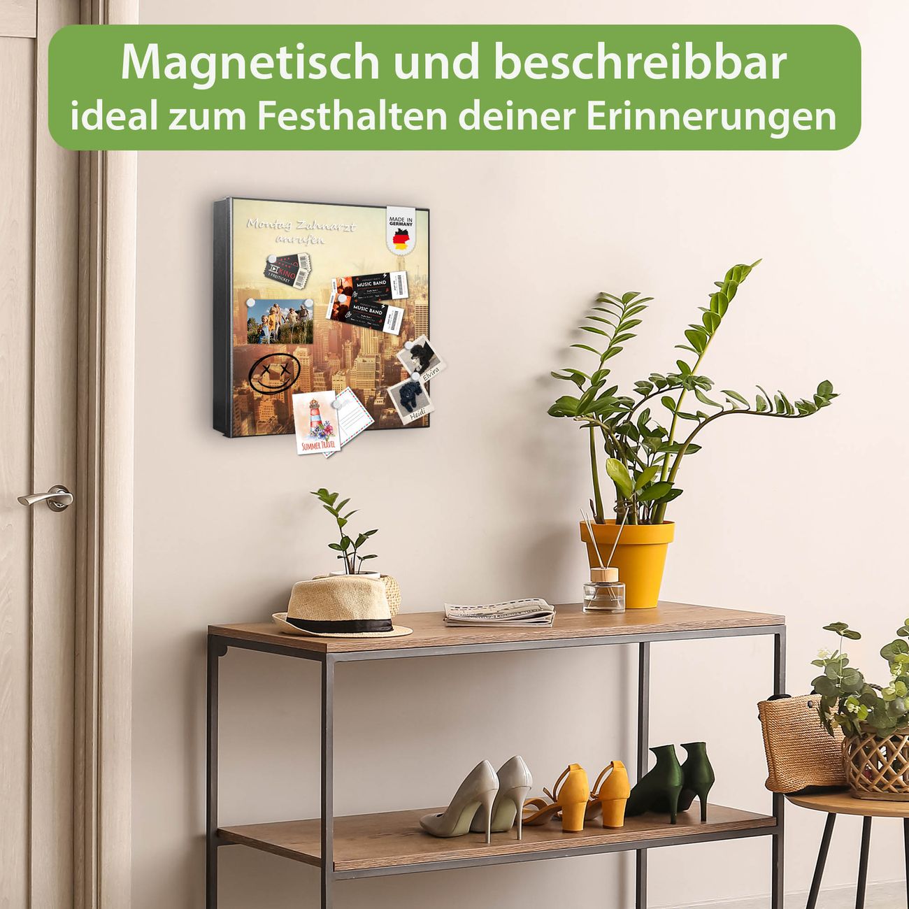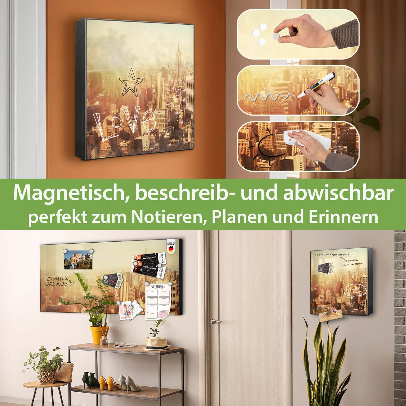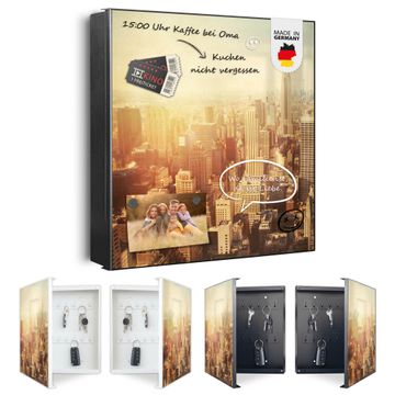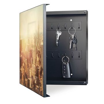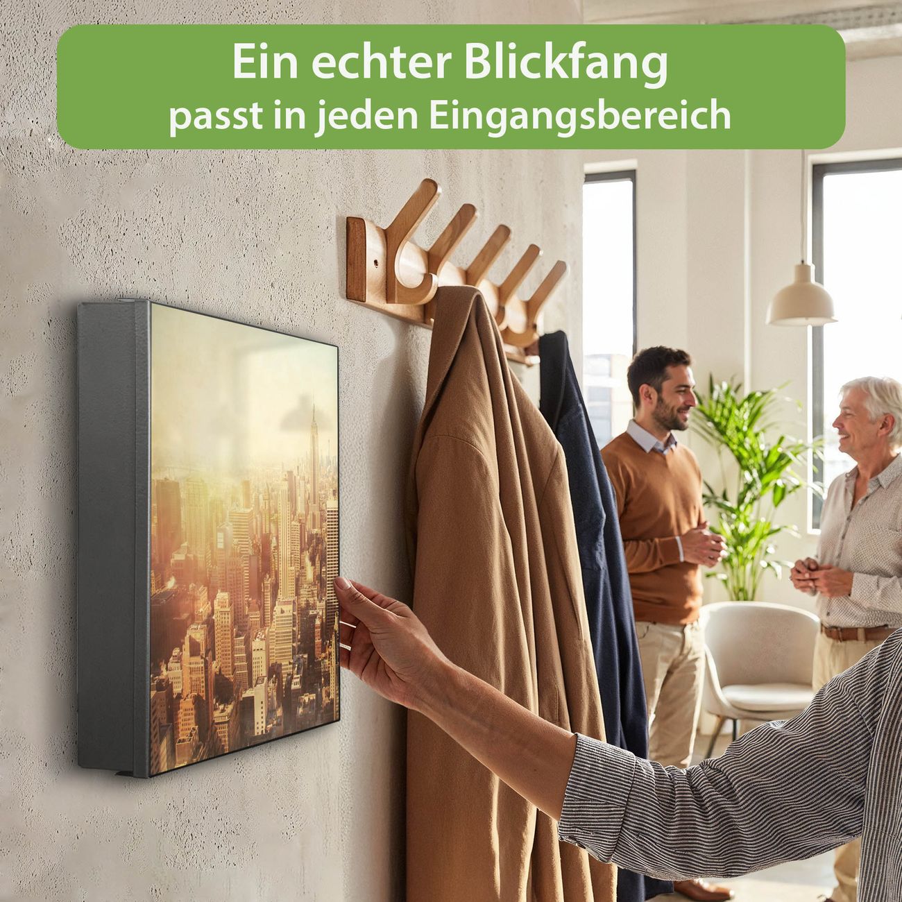 Bringe Ordnung und Eleganz in deinen Eingangsbereich mit dem banjado Schlüsselkasten Motiv Motiv Manhattan 2. Die moderne Schlüsselbox kombiniert funktionales Design mit hochwertiger Verarbeitung und wird so zu einem echten Hingucker in Flur, Büro oder Ferienwohnung. ✅ Stilvolle Schlüsselaufbewahrung mit Motiv Motiv Manhattan 2 Der Design-Schlüsselkasten Motiv Motiv Manhattan 2 bietet Platz für bis zu 32 Schlüssel, die auf 4 stabilen Reihen mit je 8 Haken übersichtlich verstaut werden. Mit seinen kompakten Maßen von 30 x 30 x 5 cm passt die Schlüsselbox perfekt auch in kleinere Räume. Der schwarz lackierte Stahlkorpus mit links angeschlagenem Türscharnier harmoniert mit gedruckten Folie auf der Front und fügt sich nahtlos in jedes Wohnambiente ein. Ob als Schlüsselorganizer für Zuhause oder als praktische Lösung für Büros, Praxen und Gewerbe, der banjado Schlüsselkasten sorgt für Ordnung und Übersicht. Dank der magnetischen, mit Kreidestiften beschreibbaren Folie auf der Front kannst du Notizen anheften oder Termine direkt auf der Oberfläche festhalten. Die Schlüsselbox Motiv Motiv Manhattan 2 zur Wandmontage wird inklusive Befestigungsmaterial geliefert und ist schnell angebracht. So hast du deine Schlüssel jederzeit griffbereit und zugleich stilvoll verstaut. Mit diesem banjado Schlüsselkasten Motiv Motiv Manhattan 2 kombinierst du praktische Aufbewahrung mit stilvollem Wohndesign. Ob privat oder geschäftlich, die Schlüsselbox sorgt für mehr Ordnung, Übersicht und ein wohnliches Ambiente.Vorteile im Überblick