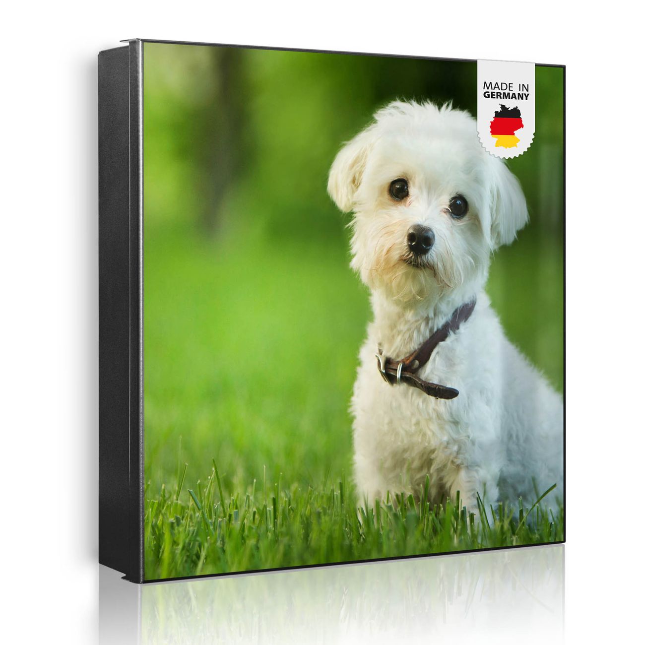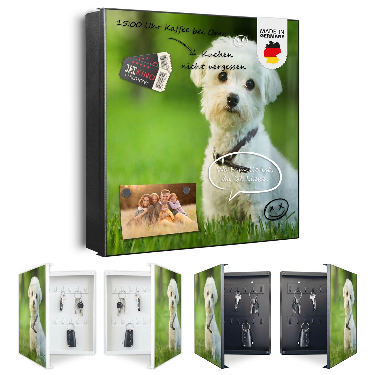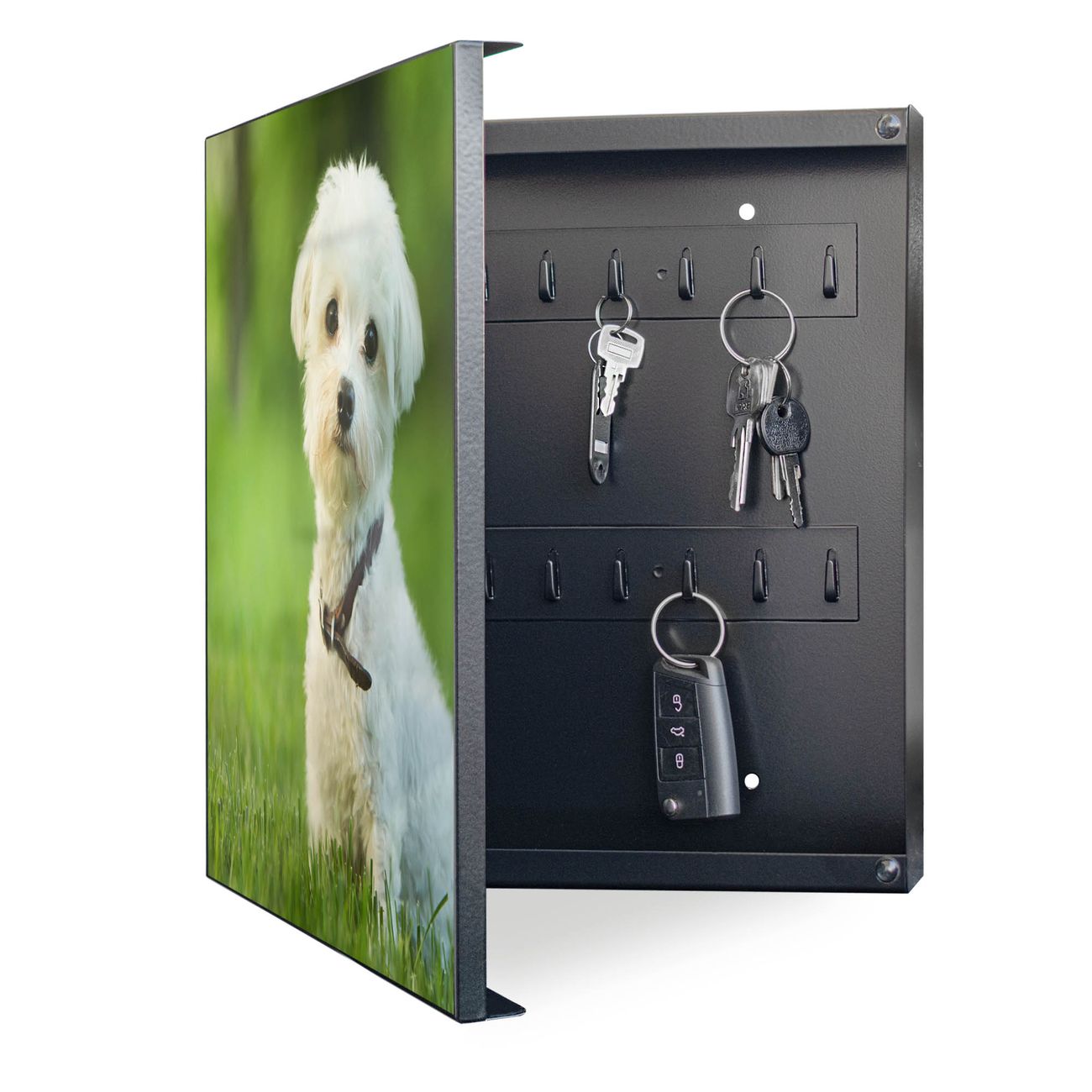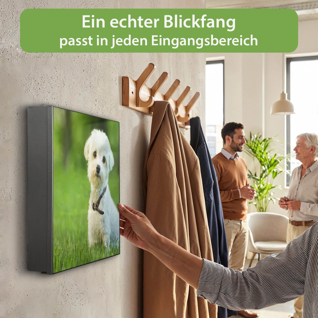 Bringe Ordnung und Eleganz in deinen Eingangsbereich mit dem banjado Schlüsselkasten Motiv Motiv Mareike. Die moderne Schlüsselbox kombiniert funktionales Design mit hochwertiger Verarbeitung und wird so zu einem echten Hingucker in Flur, Büro oder Ferienwohnung. ✅ Stilvolle Schlüsselaufbewahrung mit Motiv Motiv Mareike Der Design-Schlüsselkasten Motiv Motiv Mareike bietet Platz für bis zu 32 Schlüssel, die auf 4 stabilen Reihen mit je 8 Haken übersichtlich verstaut werden. Mit seinen kompakten Maßen von 30 x 30 x 5 cm passt die Schlüsselbox perfekt auch in kleinere Räume. Der schwarz lackierte Stahlkorpus mit links angeschlagenem Türscharnier harmoniert mit gedruckten Folie auf der Front und fügt sich nahtlos in jedes Wohnambiente ein. Ob als Schlüsselorganizer für Zuhause oder als praktische Lösung für Büros, Praxen und Gewerbe, der banjado Schlüsselkasten sorgt für Ordnung und Übersicht. Dank der magnetischen, mit Kreidestiften beschreibbaren Folie auf der Front kannst du Notizen anheften oder Termine direkt auf der Oberfläche festhalten. Die Schlüsselbox Motiv Motiv Mareike zur Wandmontage wird inklusive Befestigungsmaterial geliefert und ist schnell angebracht. So hast du deine Schlüssel jederzeit griffbereit und zugleich stilvoll verstaut. Mit diesem banjado Schlüsselkasten Motiv Motiv Mareike kombinierst du praktische Aufbewahrung mit stilvollem Wohndesign. Ob privat oder geschäftlich, die Schlüsselbox sorgt für mehr Ordnung, Übersicht und ein wohnliches Ambiente.Vorteile im Überblick
