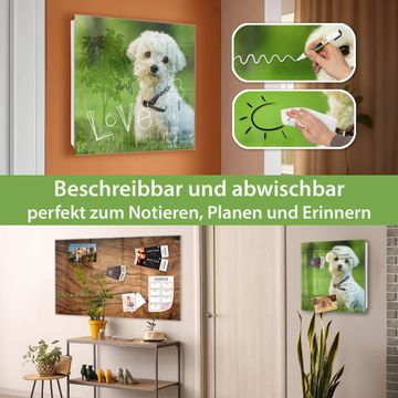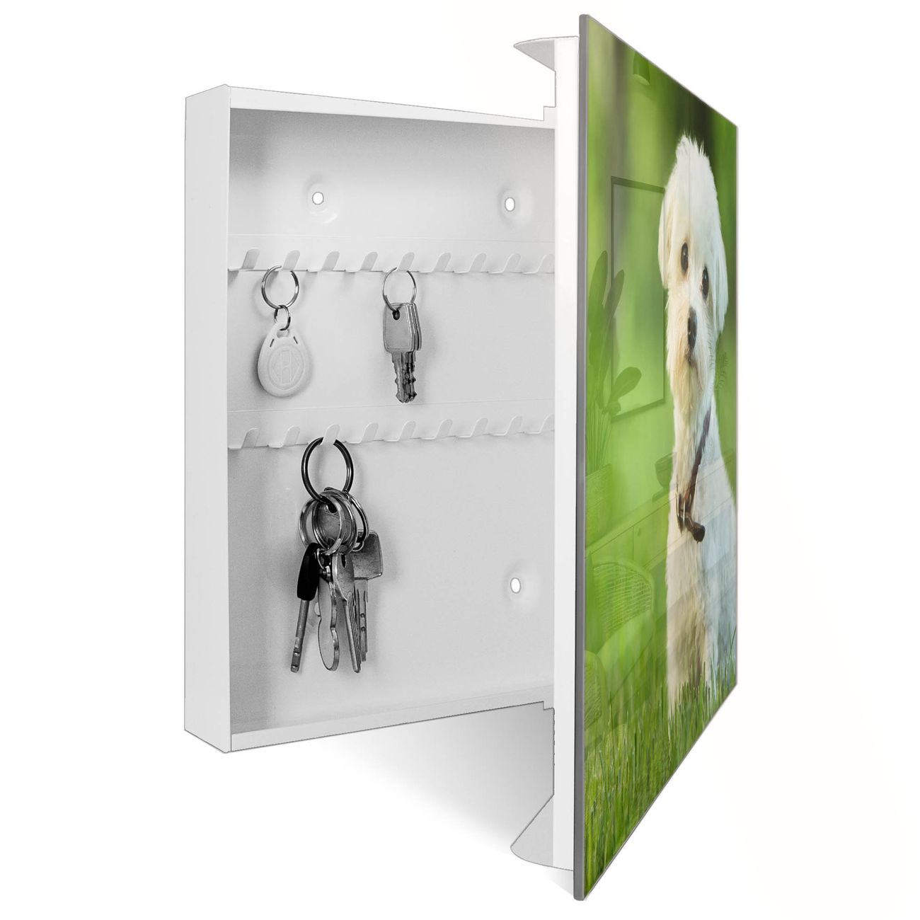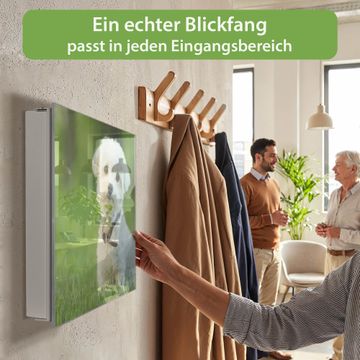Bringe Ordnung und Eleganz in deinen Eingangsbereich mit dem banjado Schlüsselkasten Motiv Motiv Mareike. Die moderne Schlüsselbox kombiniert funktionales Design mit hochwertiger Verarbeitung und wird so zu einem echten Hingucker in Flur, Büro oder Ferienwohnung. ✅ Stilvolle Schlüsselaufbewahrung mit Glasfront im Motiv Motiv Mareike Der Design-Schlüsselkasten Motiv Motiv Mareike bietet Platz für bis zu 50 Schlüssel, die auf 5 stabilen Reihen mit je 10 Haken übersichtlich verstaut werden. Mit seinen kompakten Maßen von 30 x 30 x 5 cm passt die Schlüsselbox perfekt auch in kleinere Räume. Der weiß lackierte Stahlkorpus mit rechts angeschlagenem Türscharnier harmoniert mit der Glasfront und fügt sich nahtlos in jedes Wohnambiente ein. Ob als Schlüsselorganizer für Zuhause oder als praktische Lösung für Büros, Praxen und Gewerbe, der banjado Schlüsselkasten sorgt für Ordnung und Übersicht. Dank der magnetischen, mit Kreidestiften beschreibbaren Glasfront kannst du Notizen anheften oder Termine direkt auf der Oberfläche festhalten. Die Schlüsselbox Motiv Motiv Mareike zur Wandmontage wird inklusive Befestigungsmaterial geliefert und ist schnell angebracht. So hast du deine Schlüssel jederzeit griffbereit und zugleich stilvoll verstaut. Mit diesem banjado Schlüsselkasten Motiv Motiv Mareike kombinierst du praktische Aufbewahrung mit stilvollem Wohndesign. Ob privat oder geschäftlich, die Schlüsselbox sorgt für mehr Ordnung, Übersicht und ein wohnliches Ambiente.Vorteile im Überblick