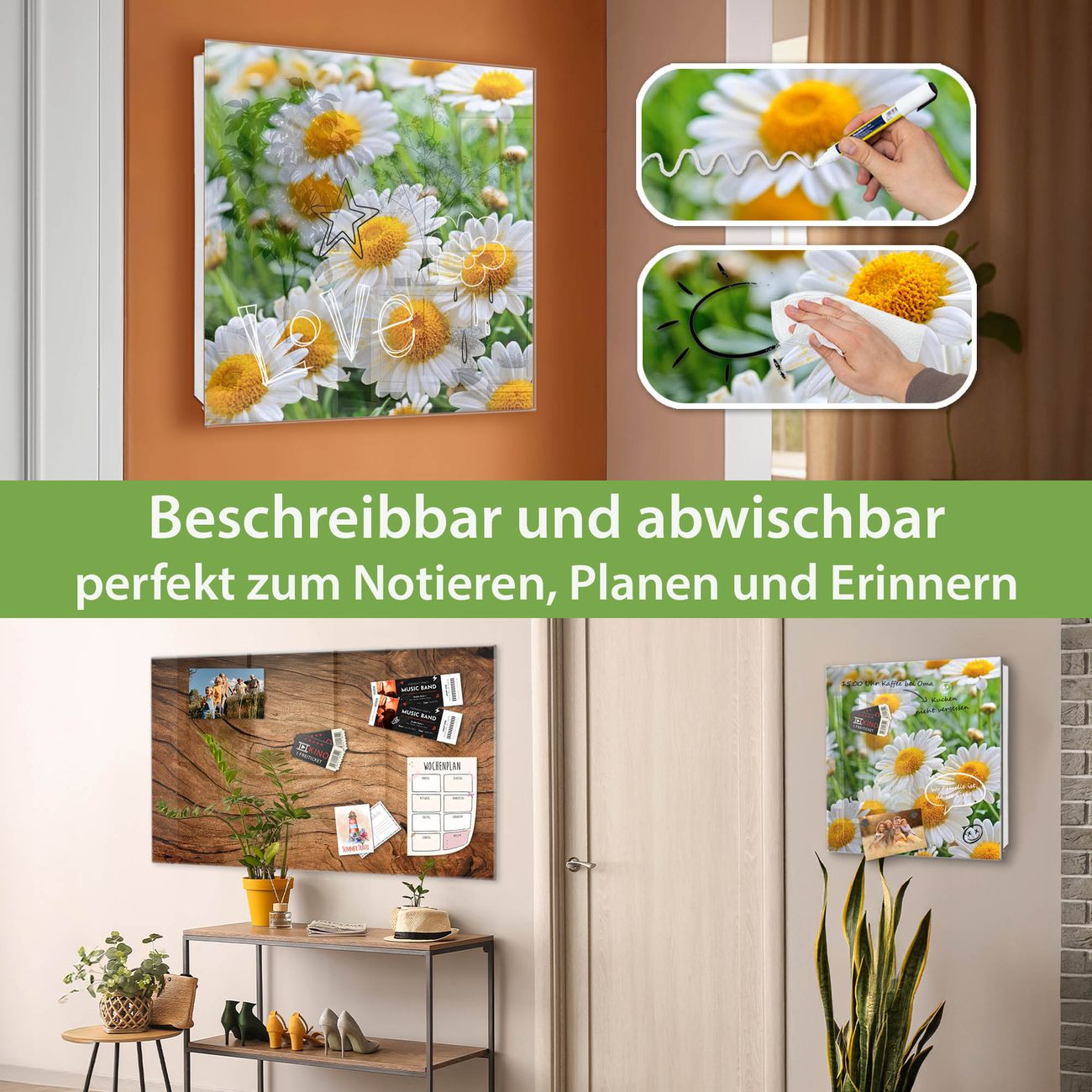 Bringe Ordnung und Eleganz in deinen Eingangsbereich mit dem banjado Schlüsselkasten Motiv Motiv Margeriten Illustration. Die moderne Schlüsselbox kombiniert funktionales Design mit hochwertiger Verarbeitung und wird so zu einem echten Hingucker in Flur, Büro oder Ferienwohnung. ✅ Stilvolle Schlüsselaufbewahrung mit Glasfront im Motiv Motiv Margeriten Illustration Der Design-Schlüsselkasten Motiv Motiv Margeriten Illustration bietet Platz für bis zu 50 Schlüssel, die auf 5 stabilen Reihen mit je 10 Haken übersichtlich verstaut werden. Mit seinen kompakten Maßen von 30 x 30 x 5 cm passt die Schlüsselbox perfekt auch in kleinere Räume. Der weiß lackierte Stahlkorpus mit rechts angeschlagenem Türscharnier harmoniert mit der Glasfront und fügt sich nahtlos in jedes Wohnambiente ein. Ob als Schlüsselorganizer für Zuhause oder als praktische Lösung für Büros, Praxen und Gewerbe, der banjado Schlüsselkasten sorgt für Ordnung und Übersicht. Dank der magnetischen, mit Kreidestiften beschreibbaren Glasfront kannst du Notizen anheften oder Termine direkt auf der Oberfläche festhalten. Die Schlüsselbox Motiv Motiv Margeriten Illustration zur Wandmontage wird inklusive Befestigungsmaterial geliefert und ist schnell angebracht. So hast du deine Schlüssel jederzeit griffbereit und zugleich stilvoll verstaut. Mit diesem banjado Schlüsselkasten Motiv Motiv Margeriten Illustration kombinierst du praktische Aufbewahrung mit stilvollem Wohndesign. Ob privat oder geschäftlich, die Schlüsselbox sorgt für mehr Ordnung, Übersicht und ein wohnliches Ambiente.Vorteile im Überblick