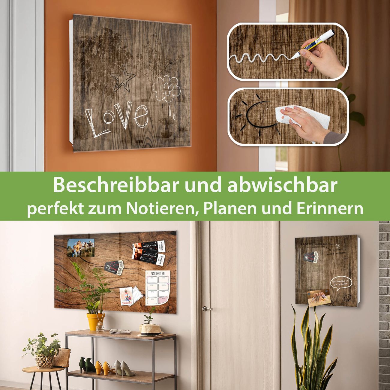 Bringe Ordnung und Eleganz in deinen Eingangsbereich mit dem banjado Schlüsselkasten Motiv Motiv Maserung Dunkel. Die moderne Schlüsselbox kombiniert funktionales Design mit hochwertiger Verarbeitung und wird so zu einem echten Hingucker in Flur, Büro oder Ferienwohnung. ✅ Stilvolle Schlüsselaufbewahrung mit Glasfront im Motiv Motiv Maserung Dunkel Der Design-Schlüsselkasten Motiv Motiv Maserung Dunkel bietet Platz für bis zu 50 Schlüssel, die auf 5 stabilen Reihen mit je 10 Haken übersichtlich verstaut werden. Mit seinen kompakten Maßen von 30 x 30 x 5 cm passt die Schlüsselbox perfekt auch in kleinere Räume. Der weiß lackierte Stahlkorpus mit rechts angeschlagenem Türscharnier harmoniert mit der Glasfront und fügt sich nahtlos in jedes Wohnambiente ein. Ob als Schlüsselorganizer für Zuhause oder als praktische Lösung für Büros, Praxen und Gewerbe, der banjado Schlüsselkasten sorgt für Ordnung und Übersicht. Dank der magnetischen, mit Kreidestiften beschreibbaren Glasfront kannst du Notizen anheften oder Termine direkt auf der Oberfläche festhalten. Die Schlüsselbox Motiv Motiv Maserung Dunkel zur Wandmontage wird inklusive Befestigungsmaterial geliefert und ist schnell angebracht. So hast du deine Schlüssel jederzeit griffbereit und zugleich stilvoll verstaut. Mit diesem banjado Schlüsselkasten Motiv Motiv Maserung Dunkel kombinierst du praktische Aufbewahrung mit stilvollem Wohndesign. Ob privat oder geschäftlich, die Schlüsselbox sorgt für mehr Ordnung, Übersicht und ein wohnliches Ambiente.Vorteile im Überblick