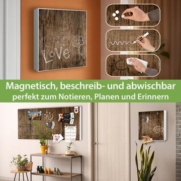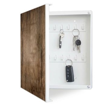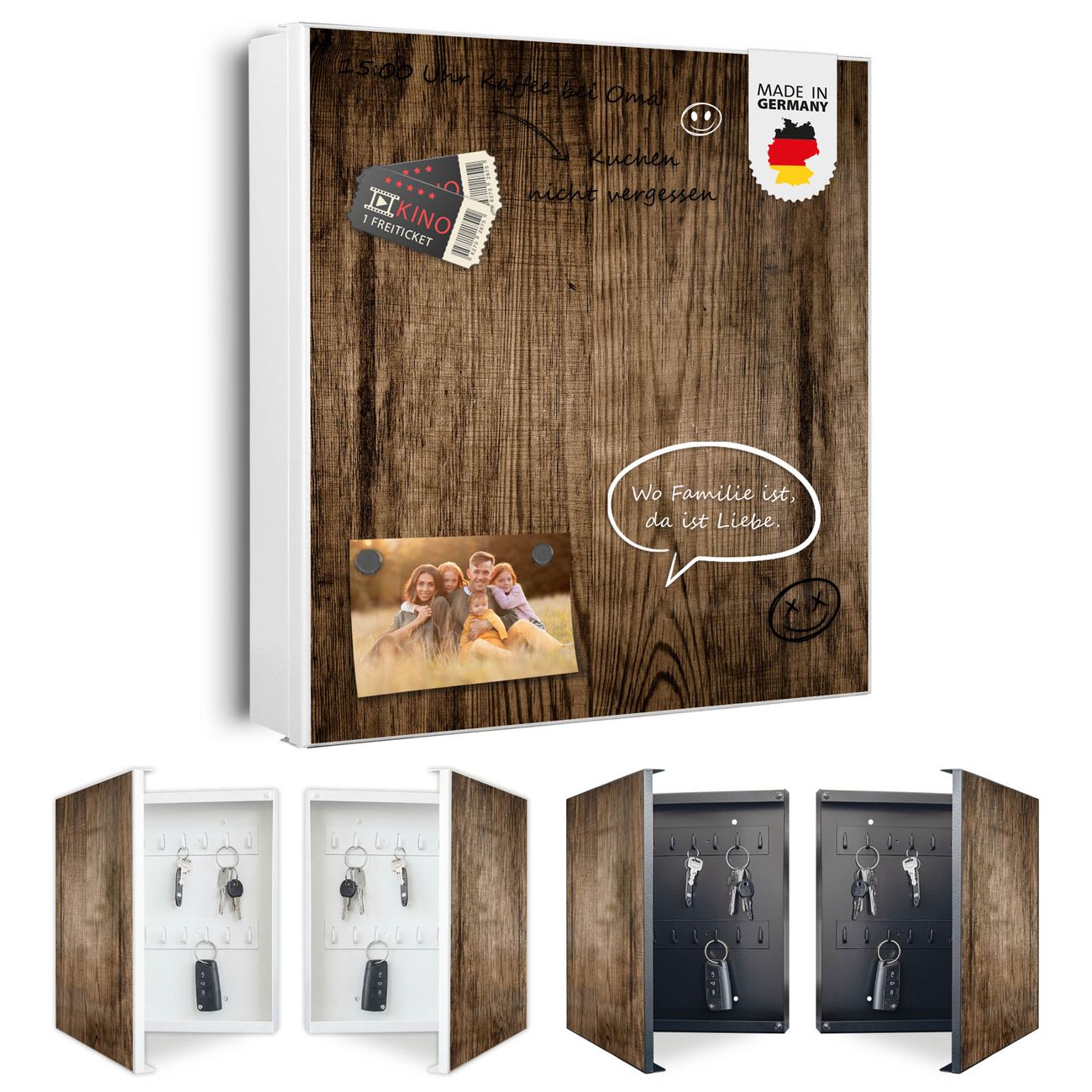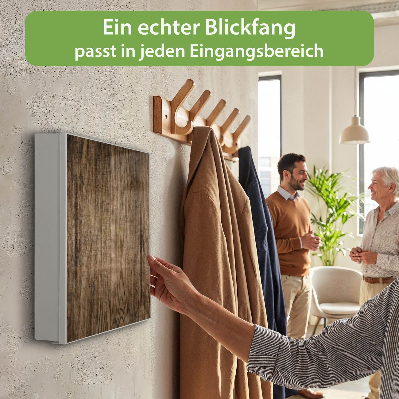 Bringe Ordnung und Eleganz in deinen Eingangsbereich mit dem banjado Schlüsselkasten Motiv Motiv Maserung Dunkel. Die moderne Schlüsselbox kombiniert funktionales Design mit hochwertiger Verarbeitung und wird so zu einem echten Hingucker in Flur, Büro oder Ferienwohnung. ✅ Stilvolle Schlüsselaufbewahrung mit Motiv Motiv Maserung Dunkel Der Design-Schlüsselkasten Motiv Motiv Maserung Dunkel bietet Platz für bis zu 32 Schlüssel, die auf 4 stabilen Reihen mit je 8 Haken übersichtlich verstaut werden. Mit seinen kompakten Maßen von 30 x 30 x 5 cm passt die Schlüsselbox perfekt auch in kleinere Räume. Der weiß lackierte Stahlkorpus mit links angeschlagenem Türscharnier harmoniert mit gedruckten Folie auf der Front und fügt sich nahtlos in jedes Wohnambiente ein. Ob als Schlüsselorganizer für Zuhause oder als praktische Lösung für Büros, Praxen und Gewerbe, der banjado Schlüsselkasten sorgt für Ordnung und Übersicht. Dank der magnetischen, mit Kreidestiften beschreibbaren Folie auf der Front kannst du Notizen anheften oder Termine direkt auf der Oberfläche festhalten. Die Schlüsselbox Motiv Motiv Maserung Dunkel zur Wandmontage wird inklusive Befestigungsmaterial geliefert und ist schnell angebracht. So hast du deine Schlüssel jederzeit griffbereit und zugleich stilvoll verstaut. Mit diesem banjado Schlüsselkasten Motiv Motiv Maserung Dunkel kombinierst du praktische Aufbewahrung mit stilvollem Wohndesign. Ob privat oder geschäftlich, die Schlüsselbox sorgt für mehr Ordnung, Übersicht und ein wohnliches Ambiente.Vorteile im Überblick