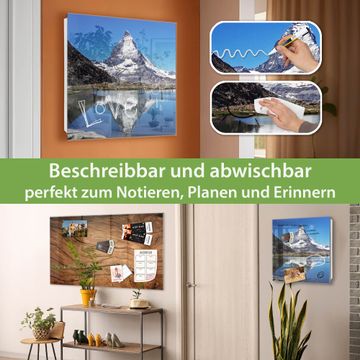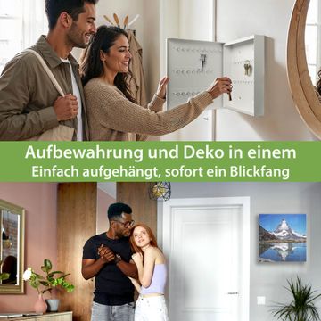 Bringe Ordnung und Eleganz in deinen Eingangsbereich mit dem banjado Schlüsselkasten Motiv Motiv Matterhorn. Die moderne Schlüsselbox kombiniert funktionales Design mit hochwertiger Verarbeitung und wird so zu einem echten Hingucker in Flur, Büro oder Ferienwohnung. ✅ Stilvolle Schlüsselaufbewahrung mit Glasfront im Motiv Motiv Matterhorn Der Design-Schlüsselkasten Motiv Motiv Matterhorn bietet Platz für bis zu 50 Schlüssel, die auf 5 stabilen Reihen mit je 10 Haken übersichtlich verstaut werden. Mit seinen kompakten Maßen von 30 x 30 x 5 cm passt die Schlüsselbox perfekt auch in kleinere Räume. Der weiß lackierte Stahlkorpus mit rechts angeschlagenem Türscharnier harmoniert mit der Glasfront und fügt sich nahtlos in jedes Wohnambiente ein. Ob als Schlüsselorganizer für Zuhause oder als praktische Lösung für Büros, Praxen und Gewerbe, der banjado Schlüsselkasten sorgt für Ordnung und Übersicht. Dank der magnetischen, mit Kreidestiften beschreibbaren Glasfront kannst du Notizen anheften oder Termine direkt auf der Oberfläche festhalten. Die Schlüsselbox Motiv Motiv Matterhorn zur Wandmontage wird inklusive Befestigungsmaterial geliefert und ist schnell angebracht. So hast du deine Schlüssel jederzeit griffbereit und zugleich stilvoll verstaut. Mit diesem banjado Schlüsselkasten Motiv Motiv Matterhorn kombinierst du praktische Aufbewahrung mit stilvollem Wohndesign. Ob privat oder geschäftlich, die Schlüsselbox sorgt für mehr Ordnung, Übersicht und ein wohnliches Ambiente.Vorteile im Überblick