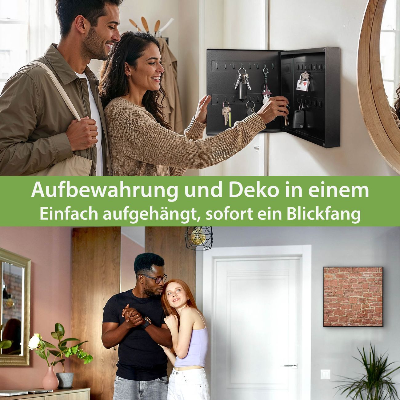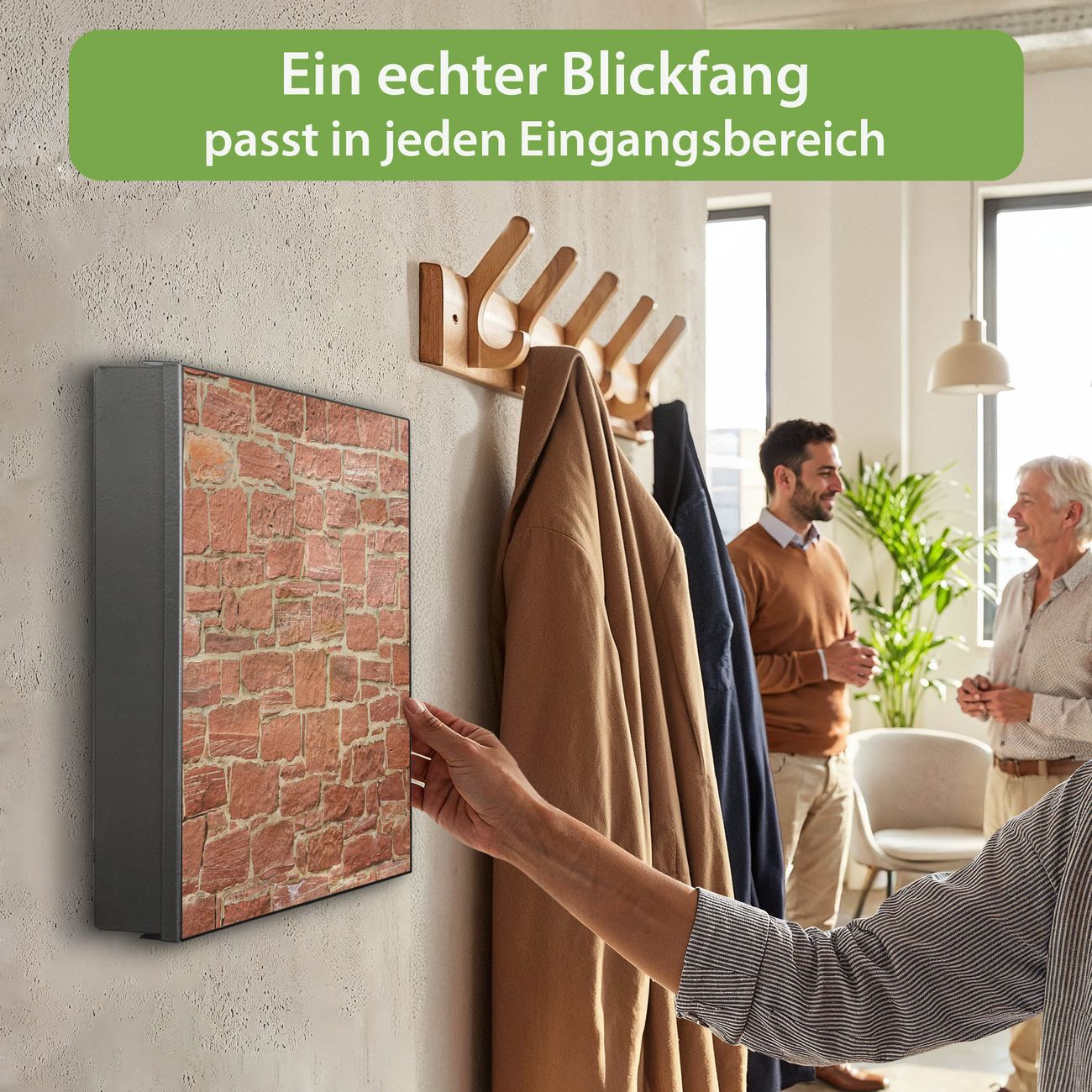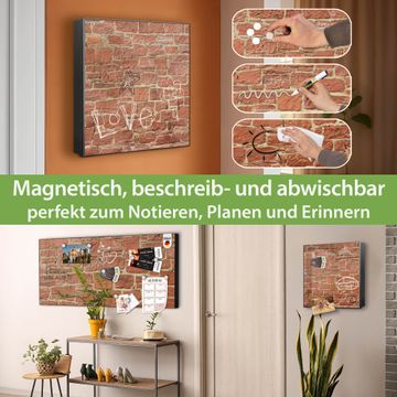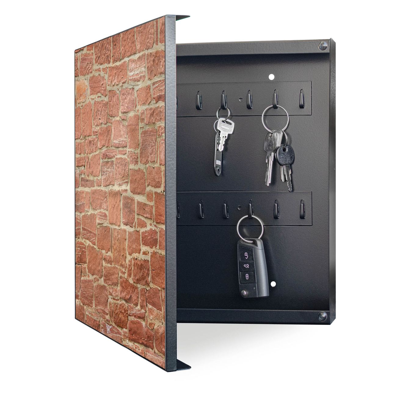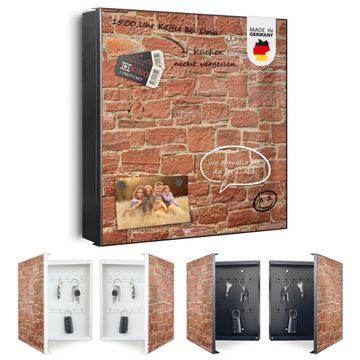 Bringe Ordnung und Eleganz in deinen Eingangsbereich mit dem banjado Schlüsselkasten Motiv Motiv Mauerwerk. Die moderne Schlüsselbox kombiniert funktionales Design mit hochwertiger Verarbeitung und wird so zu einem echten Hingucker in Flur, Büro oder Ferienwohnung. ✅ Stilvolle Schlüsselaufbewahrung mit Motiv Motiv Mauerwerk Der Design-Schlüsselkasten Motiv Motiv Mauerwerk bietet Platz für bis zu 32 Schlüssel, die auf 4 stabilen Reihen mit je 8 Haken übersichtlich verstaut werden. Mit seinen kompakten Maßen von 30 x 30 x 5 cm passt die Schlüsselbox perfekt auch in kleinere Räume. Der schwarz lackierte Stahlkorpus mit links angeschlagenem Türscharnier harmoniert mit gedruckten Folie auf der Front und fügt sich nahtlos in jedes Wohnambiente ein. Ob als Schlüsselorganizer für Zuhause oder als praktische Lösung für Büros, Praxen und Gewerbe, der banjado Schlüsselkasten sorgt für Ordnung und Übersicht. Dank der magnetischen, mit Kreidestiften beschreibbaren Folie auf der Front kannst du Notizen anheften oder Termine direkt auf der Oberfläche festhalten. Die Schlüsselbox Motiv Motiv Mauerwerk zur Wandmontage wird inklusive Befestigungsmaterial geliefert und ist schnell angebracht. So hast du deine Schlüssel jederzeit griffbereit und zugleich stilvoll verstaut. Mit diesem banjado Schlüsselkasten Motiv Motiv Mauerwerk kombinierst du praktische Aufbewahrung mit stilvollem Wohndesign. Ob privat oder geschäftlich, die Schlüsselbox sorgt für mehr Ordnung, Übersicht und ein wohnliches Ambiente.Vorteile im Überblick