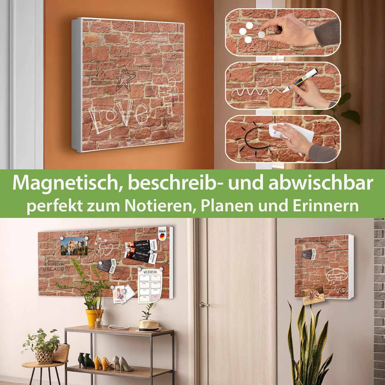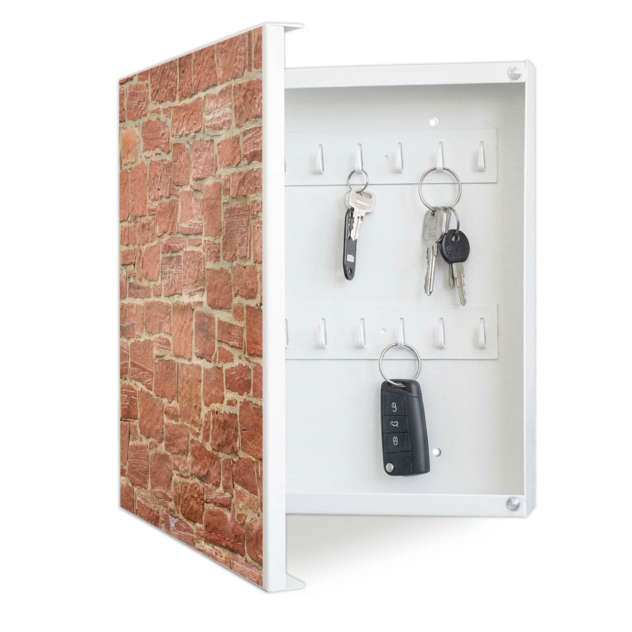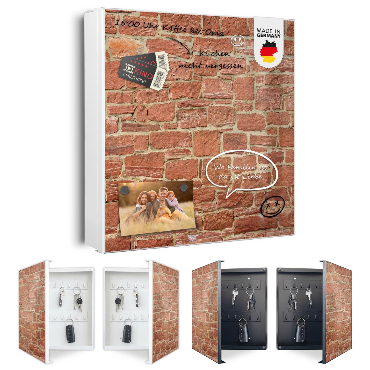 Bringe Ordnung und Eleganz in deinen Eingangsbereich mit dem banjado Schlüsselkasten Motiv Motiv Mauerwerk. Die moderne Schlüsselbox kombiniert funktionales Design mit hochwertiger Verarbeitung und wird so zu einem echten Hingucker in Flur, Büro oder Ferienwohnung. ✅ Stilvolle Schlüsselaufbewahrung mit Motiv Motiv Mauerwerk Der Design-Schlüsselkasten Motiv Motiv Mauerwerk bietet Platz für bis zu 32 Schlüssel, die auf 4 stabilen Reihen mit je 8 Haken übersichtlich verstaut werden. Mit seinen kompakten Maßen von 30 x 30 x 5 cm passt die Schlüsselbox perfekt auch in kleinere Räume. Der weiß lackierte Stahlkorpus mit links angeschlagenem Türscharnier harmoniert mit gedruckten Folie auf der Front und fügt sich nahtlos in jedes Wohnambiente ein. Ob als Schlüsselorganizer für Zuhause oder als praktische Lösung für Büros, Praxen und Gewerbe, der banjado Schlüsselkasten sorgt für Ordnung und Übersicht. Dank der magnetischen, mit Kreidestiften beschreibbaren Folie auf der Front kannst du Notizen anheften oder Termine direkt auf der Oberfläche festhalten. Die Schlüsselbox Motiv Motiv Mauerwerk zur Wandmontage wird inklusive Befestigungsmaterial geliefert und ist schnell angebracht. So hast du deine Schlüssel jederzeit griffbereit und zugleich stilvoll verstaut. Mit diesem banjado Schlüsselkasten Motiv Motiv Mauerwerk kombinierst du praktische Aufbewahrung mit stilvollem Wohndesign. Ob privat oder geschäftlich, die Schlüsselbox sorgt für mehr Ordnung, Übersicht und ein wohnliches Ambiente.Vorteile im Überblick