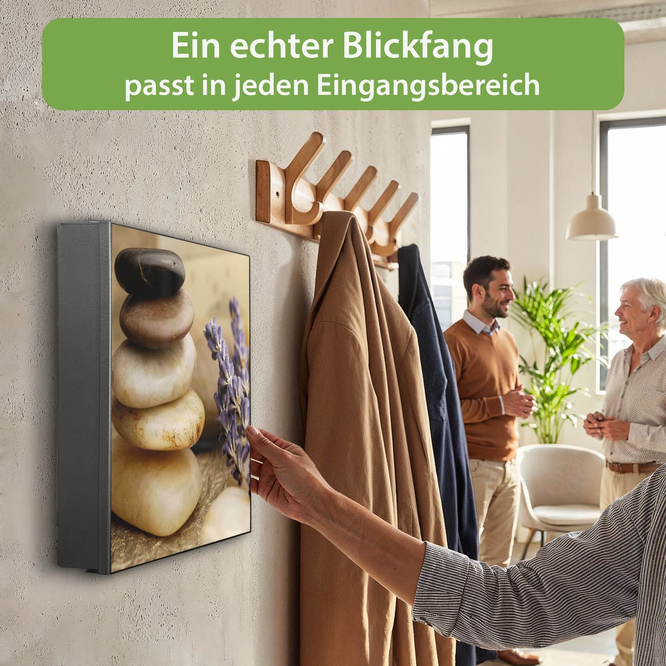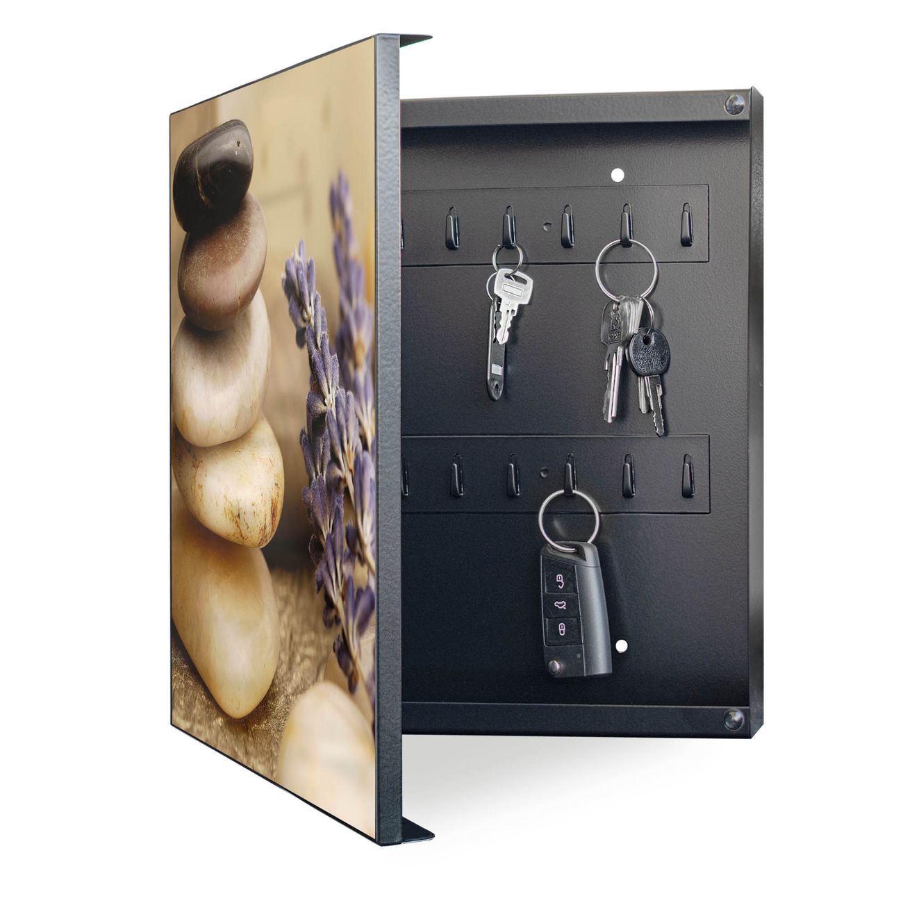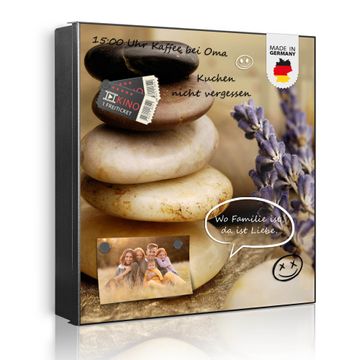 Bringe Ordnung und Eleganz in deinen Eingangsbereich mit dem banjado Schlüsselkasten Motiv Motiv Meditation. Die moderne Schlüsselbox kombiniert funktionales Design mit hochwertiger Verarbeitung und wird so zu einem echten Hingucker in Flur, Büro oder Ferienwohnung. ✅ Stilvolle Schlüsselaufbewahrung mit Motiv Motiv Meditation Der Design-Schlüsselkasten Motiv Motiv Meditation bietet Platz für bis zu 32 Schlüssel, die auf 4 stabilen Reihen mit je 8 Haken übersichtlich verstaut werden. Mit seinen kompakten Maßen von 30 x 30 x 5 cm passt die Schlüsselbox perfekt auch in kleinere Räume. Der schwarz lackierte Stahlkorpus mit links angeschlagenem Türscharnier harmoniert mit gedruckten Folie auf der Front und fügt sich nahtlos in jedes Wohnambiente ein. Ob als Schlüsselorganizer für Zuhause oder als praktische Lösung für Büros, Praxen und Gewerbe, der banjado Schlüsselkasten sorgt für Ordnung und Übersicht. Dank der magnetischen, mit Kreidestiften beschreibbaren Folie auf der Front kannst du Notizen anheften oder Termine direkt auf der Oberfläche festhalten. Die Schlüsselbox Motiv Motiv Meditation zur Wandmontage wird inklusive Befestigungsmaterial geliefert und ist schnell angebracht. So hast du deine Schlüssel jederzeit griffbereit und zugleich stilvoll verstaut. Mit diesem banjado Schlüsselkasten Motiv Motiv Meditation kombinierst du praktische Aufbewahrung mit stilvollem Wohndesign. Ob privat oder geschäftlich, die Schlüsselbox sorgt für mehr Ordnung, Übersicht und ein wohnliches Ambiente.Vorteile im Überblick