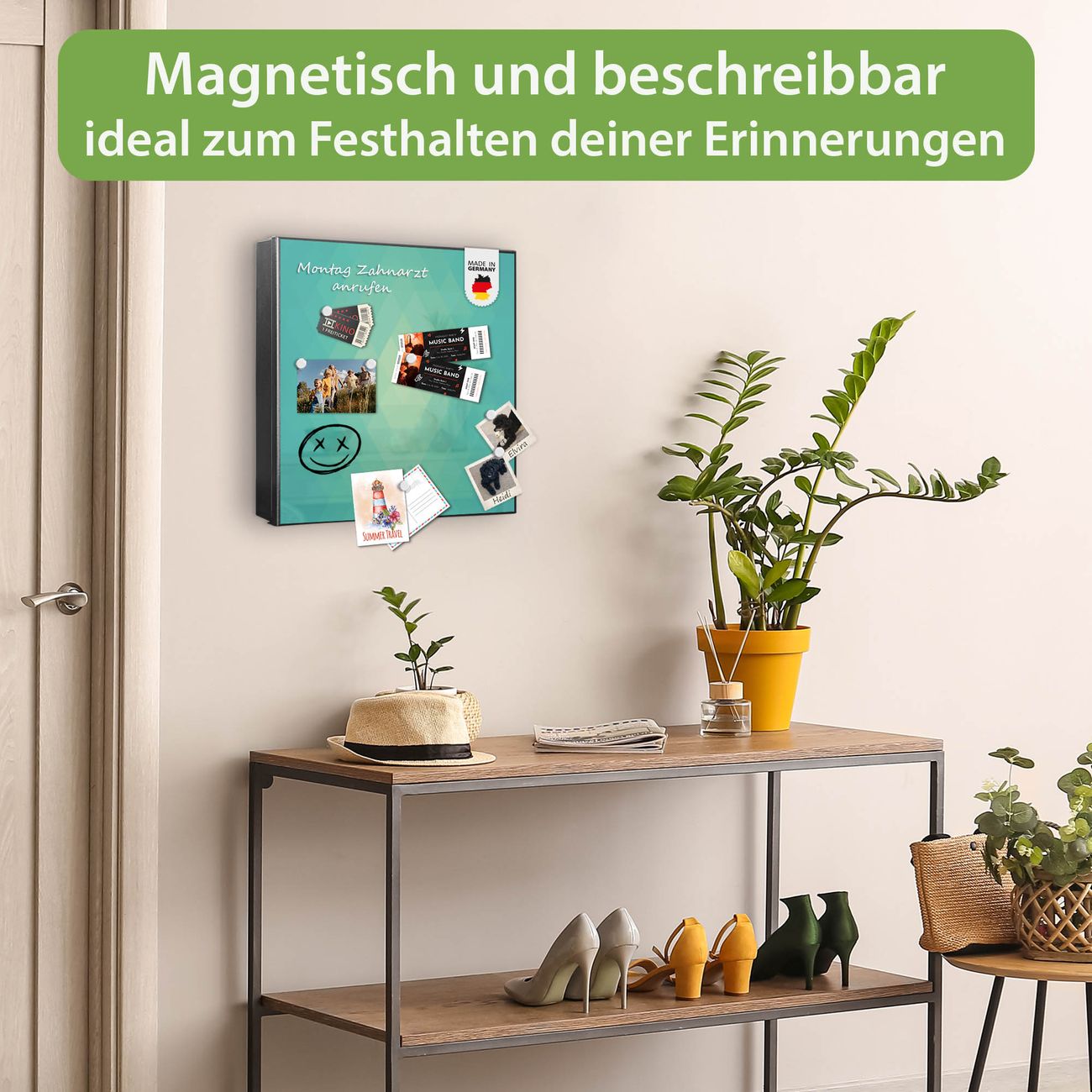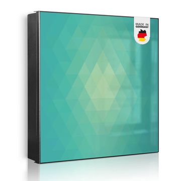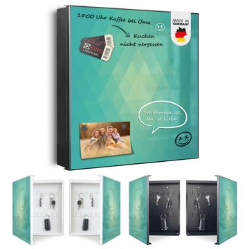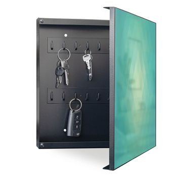 Bringe Ordnung und Eleganz in deinen Eingangsbereich mit dem banjado Schlüsselkasten Motiv Motiv Meeresblau. Die moderne Schlüsselbox kombiniert funktionales Design mit hochwertiger Verarbeitung und wird so zu einem echten Hingucker in Flur, Büro oder Ferienwohnung. ✅ Stilvolle Schlüsselaufbewahrung mit Motiv Motiv Meeresblau Der Design-Schlüsselkasten Motiv Motiv Meeresblau bietet Platz für bis zu 32 Schlüssel, die auf 4 stabilen Reihen mit je 8 Haken übersichtlich verstaut werden. Mit seinen kompakten Maßen von 30 x 30 x 5 cm passt die Schlüsselbox perfekt auch in kleinere Räume. Der schwarz lackierte Stahlkorpus mit rechts angeschlagenem Türscharnier harmoniert mit gedruckten Folie auf der Front und fügt sich nahtlos in jedes Wohnambiente ein. Ob als Schlüsselorganizer für Zuhause oder als praktische Lösung für Büros, Praxen und Gewerbe, der banjado Schlüsselkasten sorgt für Ordnung und Übersicht. Dank der magnetischen, mit Kreidestiften beschreibbaren Folie auf der Front kannst du Notizen anheften oder Termine direkt auf der Oberfläche festhalten. Die Schlüsselbox Motiv Motiv Meeresblau zur Wandmontage wird inklusive Befestigungsmaterial geliefert und ist schnell angebracht. So hast du deine Schlüssel jederzeit griffbereit und zugleich stilvoll verstaut. Mit diesem banjado Schlüsselkasten Motiv Motiv Meeresblau kombinierst du praktische Aufbewahrung mit stilvollem Wohndesign. Ob privat oder geschäftlich, die Schlüsselbox sorgt für mehr Ordnung, Übersicht und ein wohnliches Ambiente.Vorteile im Überblick