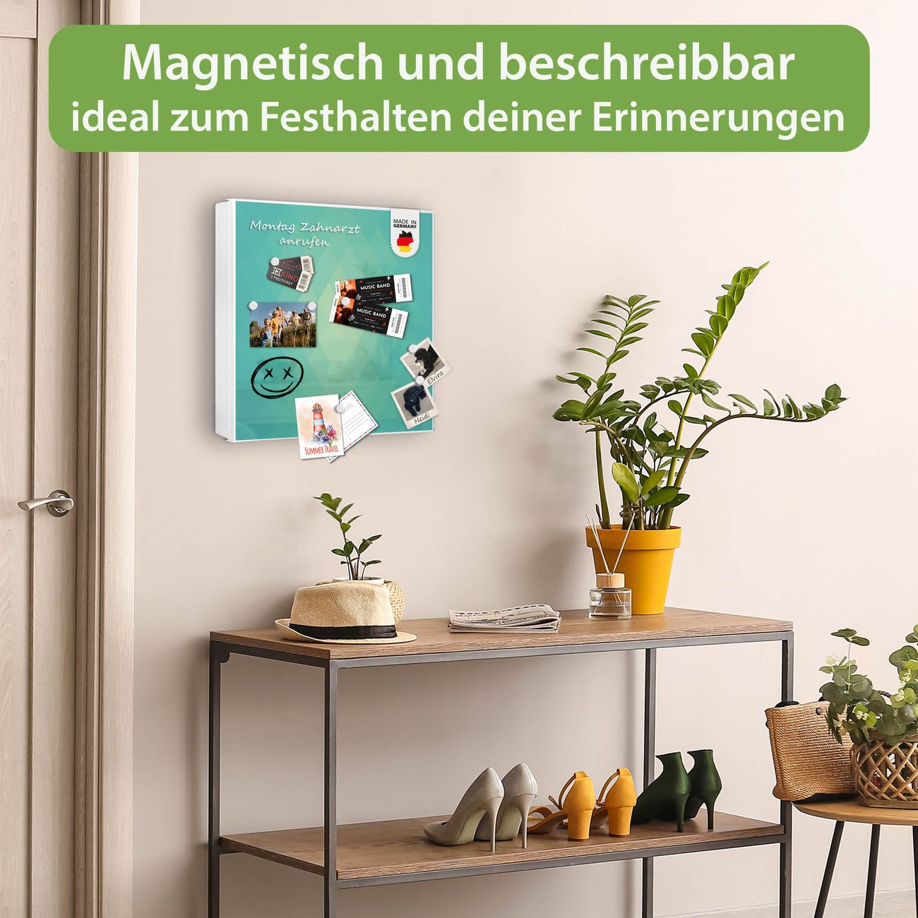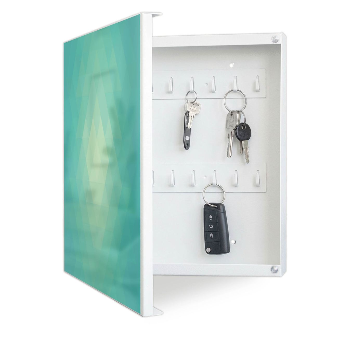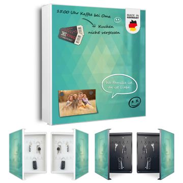 Bringe Ordnung und Eleganz in deinen Eingangsbereich mit dem banjado Schlüsselkasten Motiv Motiv Meeresblau. Die moderne Schlüsselbox kombiniert funktionales Design mit hochwertiger Verarbeitung und wird so zu einem echten Hingucker in Flur, Büro oder Ferienwohnung. ✅ Stilvolle Schlüsselaufbewahrung mit Motiv Motiv Meeresblau Der Design-Schlüsselkasten Motiv Motiv Meeresblau bietet Platz für bis zu 32 Schlüssel, die auf 4 stabilen Reihen mit je 8 Haken übersichtlich verstaut werden. Mit seinen kompakten Maßen von 30 x 30 x 5 cm passt die Schlüsselbox perfekt auch in kleinere Räume. Der weiß lackierte Stahlkorpus mit links angeschlagenem Türscharnier harmoniert mit gedruckten Folie auf der Front und fügt sich nahtlos in jedes Wohnambiente ein. Ob als Schlüsselorganizer für Zuhause oder als praktische Lösung für Büros, Praxen und Gewerbe, der banjado Schlüsselkasten sorgt für Ordnung und Übersicht. Dank der magnetischen, mit Kreidestiften beschreibbaren Folie auf der Front kannst du Notizen anheften oder Termine direkt auf der Oberfläche festhalten. Die Schlüsselbox Motiv Motiv Meeresblau zur Wandmontage wird inklusive Befestigungsmaterial geliefert und ist schnell angebracht. So hast du deine Schlüssel jederzeit griffbereit und zugleich stilvoll verstaut. Mit diesem banjado Schlüsselkasten Motiv Motiv Meeresblau kombinierst du praktische Aufbewahrung mit stilvollem Wohndesign. Ob privat oder geschäftlich, die Schlüsselbox sorgt für mehr Ordnung, Übersicht und ein wohnliches Ambiente.Vorteile im Überblick
