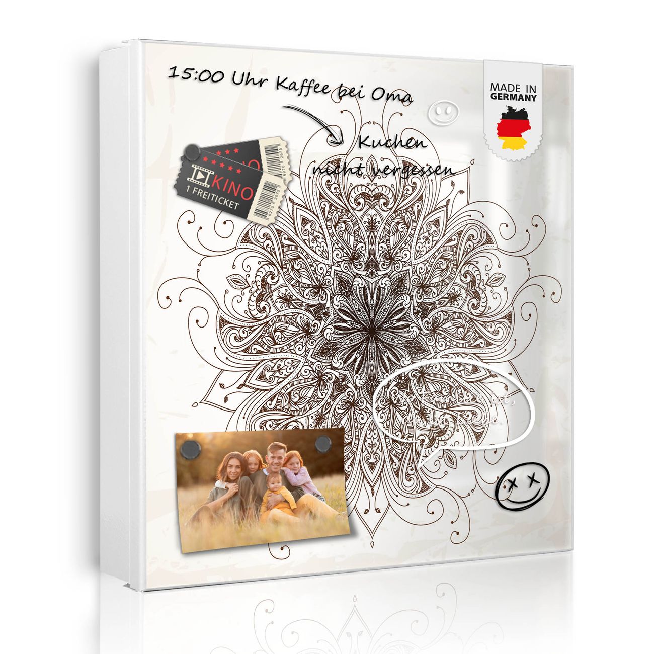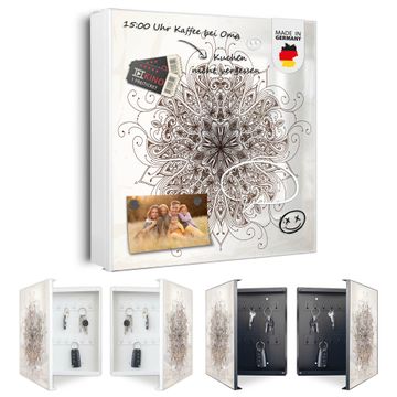 Bringe Ordnung und Eleganz in deinen Eingangsbereich mit dem banjado Schlüsselkasten Motiv Motiv Mehendi. Die moderne Schlüsselbox kombiniert funktionales Design mit hochwertiger Verarbeitung und wird so zu einem echten Hingucker in Flur, Büro oder Ferienwohnung. ✅ Stilvolle Schlüsselaufbewahrung mit Motiv Motiv Mehendi Der Design-Schlüsselkasten Motiv Motiv Mehendi bietet Platz für bis zu 32 Schlüssel, die auf 4 stabilen Reihen mit je 8 Haken übersichtlich verstaut werden. Mit seinen kompakten Maßen von 30 x 30 x 5 cm passt die Schlüsselbox perfekt auch in kleinere Räume. Der weiß lackierte Stahlkorpus mit rechts angeschlagenem Türscharnier harmoniert mit gedruckten Folie auf der Front und fügt sich nahtlos in jedes Wohnambiente ein. Ob als Schlüsselorganizer für Zuhause oder als praktische Lösung für Büros, Praxen und Gewerbe, der banjado Schlüsselkasten sorgt für Ordnung und Übersicht. Dank der magnetischen, mit Kreidestiften beschreibbaren Folie auf der Front kannst du Notizen anheften oder Termine direkt auf der Oberfläche festhalten. Die Schlüsselbox Motiv Motiv Mehendi zur Wandmontage wird inklusive Befestigungsmaterial geliefert und ist schnell angebracht. So hast du deine Schlüssel jederzeit griffbereit und zugleich stilvoll verstaut. Mit diesem banjado Schlüsselkasten Motiv Motiv Mehendi kombinierst du praktische Aufbewahrung mit stilvollem Wohndesign. Ob privat oder geschäftlich, die Schlüsselbox sorgt für mehr Ordnung, Übersicht und ein wohnliches Ambiente.Vorteile im Überblick