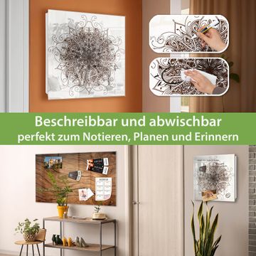 Bringe Ordnung und Eleganz in deinen Eingangsbereich mit dem banjado Schlüsselkasten Motiv Motiv Mehendi. Die moderne Schlüsselbox kombiniert funktionales Design mit hochwertiger Verarbeitung und wird so zu einem echten Hingucker in Flur, Büro oder Ferienwohnung. ✅ Stilvolle Schlüsselaufbewahrung mit Glasfront im Motiv Motiv Mehendi Der Design-Schlüsselkasten Motiv Motiv Mehendi bietet Platz für bis zu 50 Schlüssel, die auf 5 stabilen Reihen mit je 10 Haken übersichtlich verstaut werden. Mit seinen kompakten Maßen von 30 x 30 x 5 cm passt die Schlüsselbox perfekt auch in kleinere Räume. Der weiß lackierte Stahlkorpus mit rechts angeschlagenem Türscharnier harmoniert mit der Glasfront und fügt sich nahtlos in jedes Wohnambiente ein. Ob als Schlüsselorganizer für Zuhause oder als praktische Lösung für Büros, Praxen und Gewerbe, der banjado Schlüsselkasten sorgt für Ordnung und Übersicht. Dank der magnetischen, mit Kreidestiften beschreibbaren Glasfront kannst du Notizen anheften oder Termine direkt auf der Oberfläche festhalten. Die Schlüsselbox Motiv Motiv Mehendi zur Wandmontage wird inklusive Befestigungsmaterial geliefert und ist schnell angebracht. So hast du deine Schlüssel jederzeit griffbereit und zugleich stilvoll verstaut. Mit diesem banjado Schlüsselkasten Motiv Motiv Mehendi kombinierst du praktische Aufbewahrung mit stilvollem Wohndesign. Ob privat oder geschäftlich, die Schlüsselbox sorgt für mehr Ordnung, Übersicht und ein wohnliches Ambiente.Vorteile im Überblick