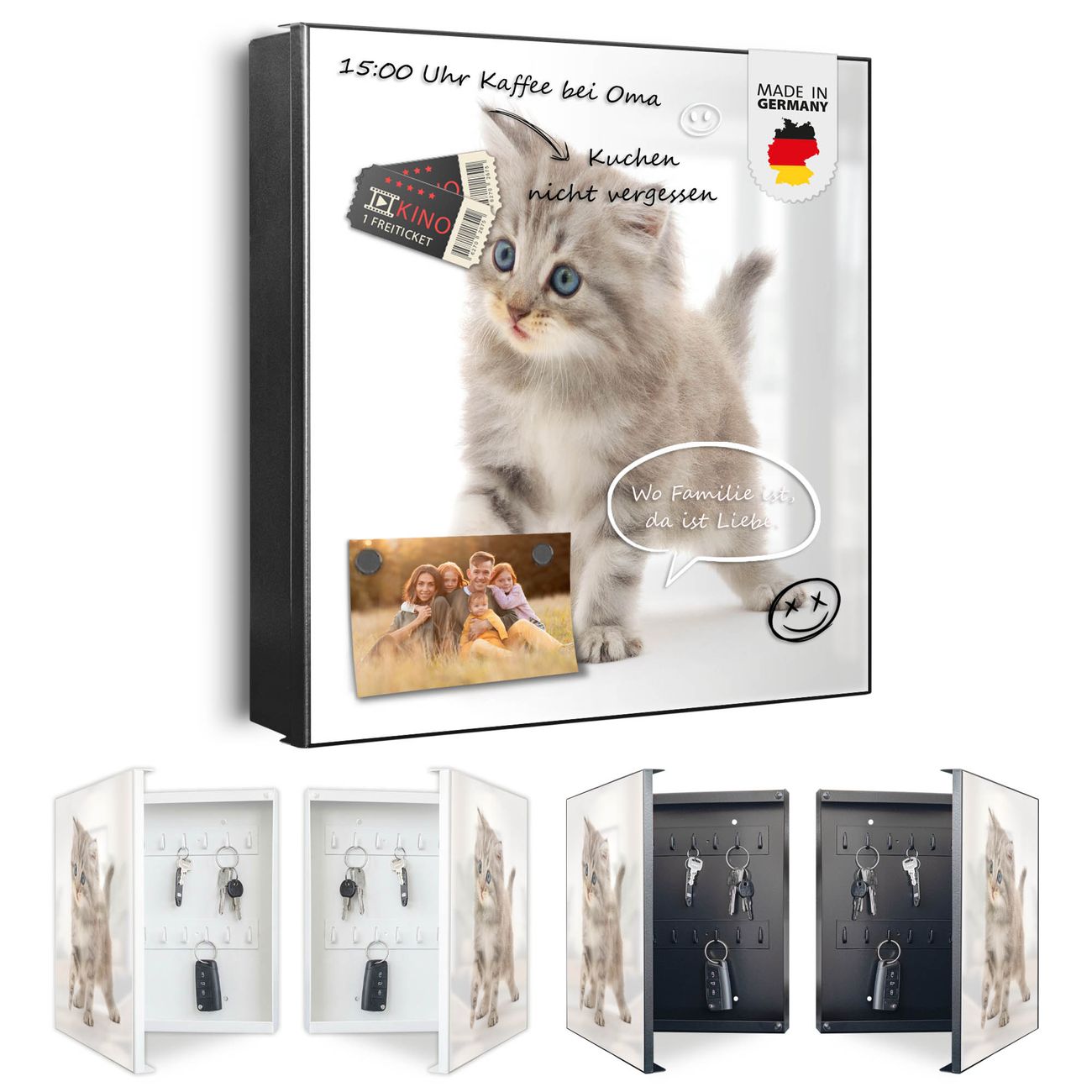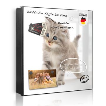 Bringe Ordnung und Eleganz in deinen Eingangsbereich mit dem banjado Schlüsselkasten Motiv Motiv Miau. Die moderne Schlüsselbox kombiniert funktionales Design mit hochwertiger Verarbeitung und wird so zu einem echten Hingucker in Flur, Büro oder Ferienwohnung. ✅ Stilvolle Schlüsselaufbewahrung mit Motiv Motiv Miau Der Design-Schlüsselkasten Motiv Motiv Miau bietet Platz für bis zu 32 Schlüssel, die auf 4 stabilen Reihen mit je 8 Haken übersichtlich verstaut werden. Mit seinen kompakten Maßen von 30 x 30 x 5 cm passt die Schlüsselbox perfekt auch in kleinere Räume. Der schwarz lackierte Stahlkorpus mit links angeschlagenem Türscharnier harmoniert mit gedruckten Folie auf der Front und fügt sich nahtlos in jedes Wohnambiente ein. Ob als Schlüsselorganizer für Zuhause oder als praktische Lösung für Büros, Praxen und Gewerbe, der banjado Schlüsselkasten sorgt für Ordnung und Übersicht. Dank der magnetischen, mit Kreidestiften beschreibbaren Folie auf der Front kannst du Notizen anheften oder Termine direkt auf der Oberfläche festhalten. Die Schlüsselbox Motiv Motiv Miau zur Wandmontage wird inklusive Befestigungsmaterial geliefert und ist schnell angebracht. So hast du deine Schlüssel jederzeit griffbereit und zugleich stilvoll verstaut. Mit diesem banjado Schlüsselkasten Motiv Motiv Miau kombinierst du praktische Aufbewahrung mit stilvollem Wohndesign. Ob privat oder geschäftlich, die Schlüsselbox sorgt für mehr Ordnung, Übersicht und ein wohnliches Ambiente.Vorteile im Überblick