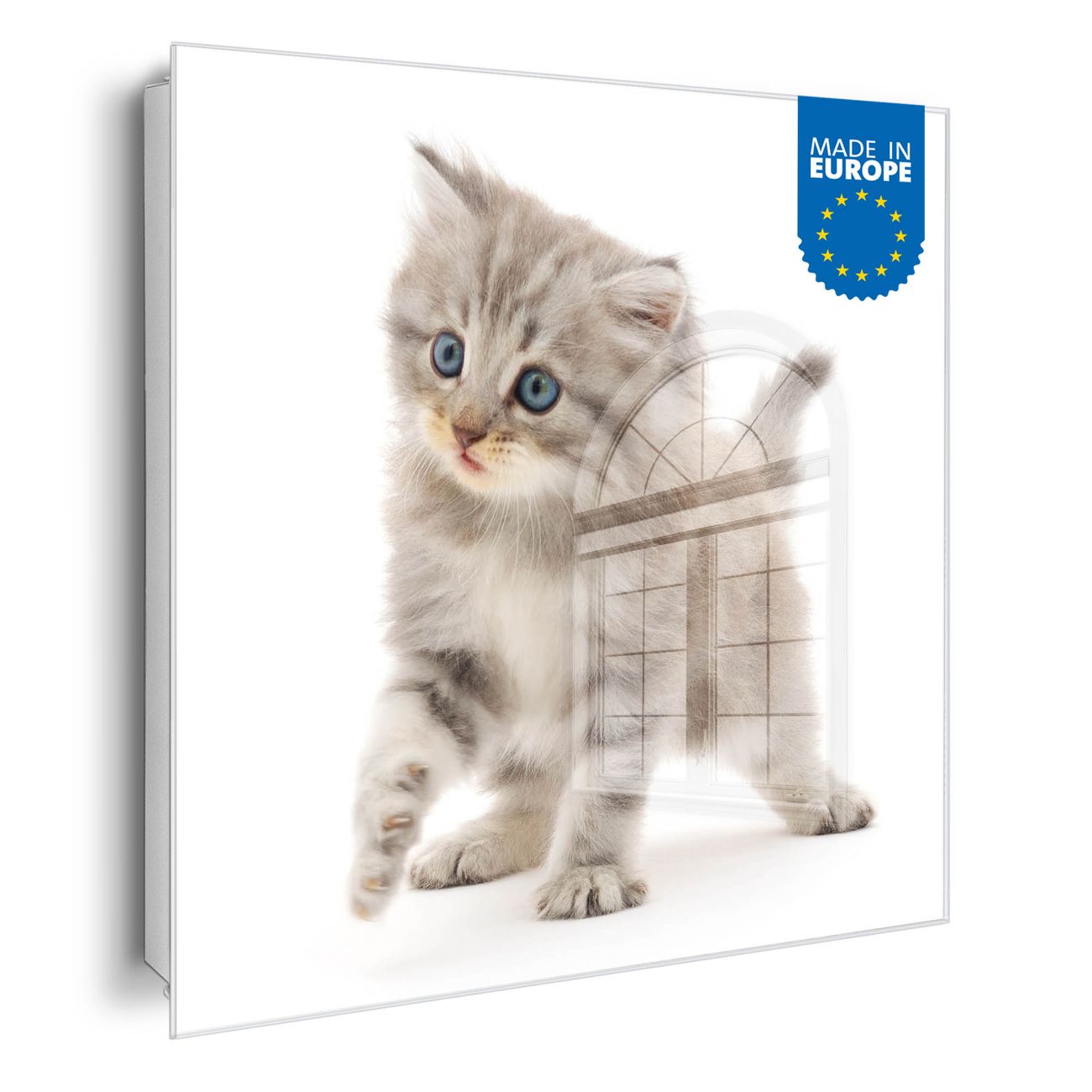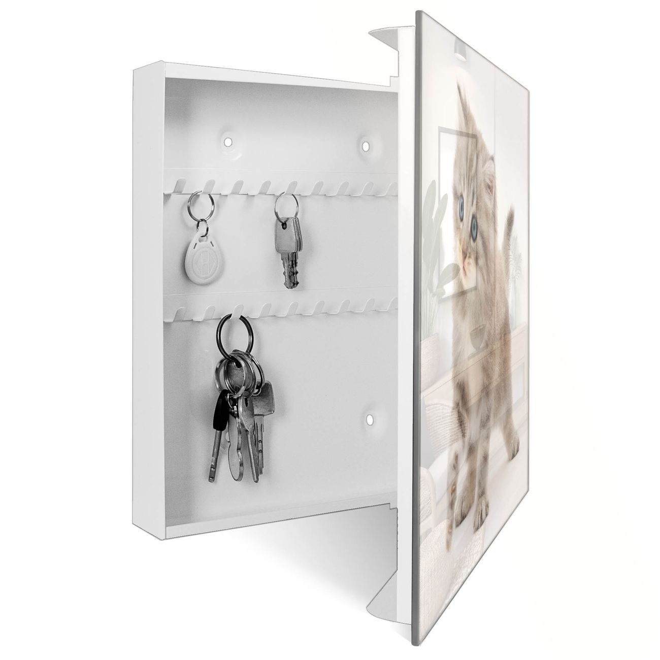 Bringe Ordnung und Eleganz in deinen Eingangsbereich mit dem banjado Schlüsselkasten Motiv Motiv Miau. Die moderne Schlüsselbox kombiniert funktionales Design mit hochwertiger Verarbeitung und wird so zu einem echten Hingucker in Flur, Büro oder Ferienwohnung. ✅ Stilvolle Schlüsselaufbewahrung mit Glasfront im Motiv Motiv Miau Der Design-Schlüsselkasten Motiv Motiv Miau bietet Platz für bis zu 50 Schlüssel, die auf 5 stabilen Reihen mit je 10 Haken übersichtlich verstaut werden. Mit seinen kompakten Maßen von 30 x 30 x 5 cm passt die Schlüsselbox perfekt auch in kleinere Räume. Der weiß lackierte Stahlkorpus mit rechts angeschlagenem Türscharnier harmoniert mit der Glasfront und fügt sich nahtlos in jedes Wohnambiente ein. Ob als Schlüsselorganizer für Zuhause oder als praktische Lösung für Büros, Praxen und Gewerbe, der banjado Schlüsselkasten sorgt für Ordnung und Übersicht. Dank der magnetischen, mit Kreidestiften beschreibbaren Glasfront kannst du Notizen anheften oder Termine direkt auf der Oberfläche festhalten. Die Schlüsselbox Motiv Motiv Miau zur Wandmontage wird inklusive Befestigungsmaterial geliefert und ist schnell angebracht. So hast du deine Schlüssel jederzeit griffbereit und zugleich stilvoll verstaut. Mit diesem banjado Schlüsselkasten Motiv Motiv Miau kombinierst du praktische Aufbewahrung mit stilvollem Wohndesign. Ob privat oder geschäftlich, die Schlüsselbox sorgt für mehr Ordnung, Übersicht und ein wohnliches Ambiente.Vorteile im Überblick