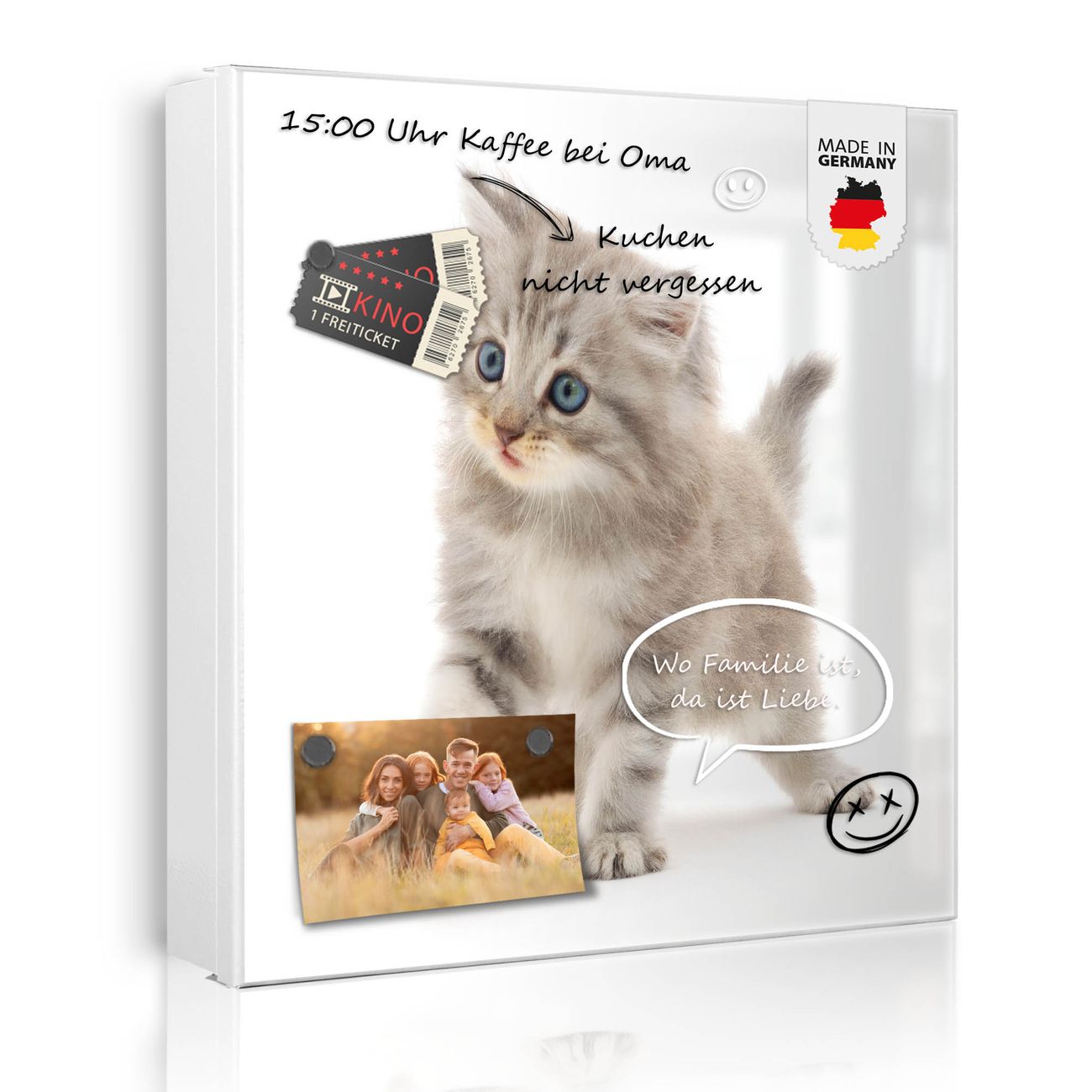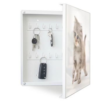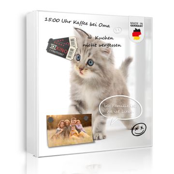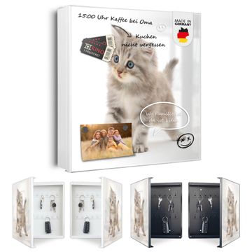 Bringe Ordnung und Eleganz in deinen Eingangsbereich mit dem banjado Schlüsselkasten Motiv Motiv Miau. Die moderne Schlüsselbox kombiniert funktionales Design mit hochwertiger Verarbeitung und wird so zu einem echten Hingucker in Flur, Büro oder Ferienwohnung. ✅ Stilvolle Schlüsselaufbewahrung mit Motiv Motiv Miau Der Design-Schlüsselkasten Motiv Motiv Miau bietet Platz für bis zu 32 Schlüssel, die auf 4 stabilen Reihen mit je 8 Haken übersichtlich verstaut werden. Mit seinen kompakten Maßen von 30 x 30 x 5 cm passt die Schlüsselbox perfekt auch in kleinere Räume. Der weiß lackierte Stahlkorpus mit rechts angeschlagenem Türscharnier harmoniert mit gedruckten Folie auf der Front und fügt sich nahtlos in jedes Wohnambiente ein. Ob als Schlüsselorganizer für Zuhause oder als praktische Lösung für Büros, Praxen und Gewerbe, der banjado Schlüsselkasten sorgt für Ordnung und Übersicht. Dank der magnetischen, mit Kreidestiften beschreibbaren Folie auf der Front kannst du Notizen anheften oder Termine direkt auf der Oberfläche festhalten. Die Schlüsselbox Motiv Motiv Miau zur Wandmontage wird inklusive Befestigungsmaterial geliefert und ist schnell angebracht. So hast du deine Schlüssel jederzeit griffbereit und zugleich stilvoll verstaut. Mit diesem banjado Schlüsselkasten Motiv Motiv Miau kombinierst du praktische Aufbewahrung mit stilvollem Wohndesign. Ob privat oder geschäftlich, die Schlüsselbox sorgt für mehr Ordnung, Übersicht und ein wohnliches Ambiente.Vorteile im Überblick