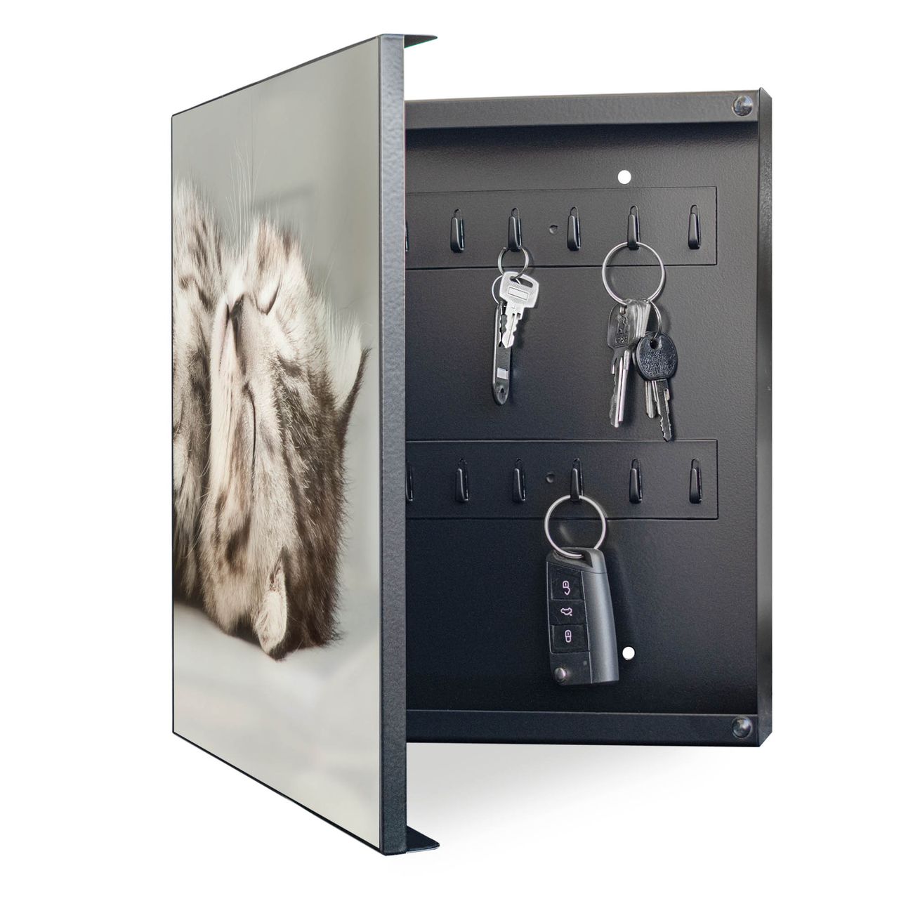 Bringe Ordnung und Eleganz in deinen Eingangsbereich mit dem banjado Schlüsselkasten Motiv Motiv Mini Und Jerry. Die moderne Schlüsselbox kombiniert funktionales Design mit hochwertiger Verarbeitung und wird so zu einem echten Hingucker in Flur, Büro oder Ferienwohnung. ✅ Stilvolle Schlüsselaufbewahrung mit Motiv Motiv Mini Und Jerry Der Design-Schlüsselkasten Motiv Motiv Mini Und Jerry bietet Platz für bis zu 32 Schlüssel, die auf 4 stabilen Reihen mit je 8 Haken übersichtlich verstaut werden. Mit seinen kompakten Maßen von 30 x 30 x 5 cm passt die Schlüsselbox perfekt auch in kleinere Räume. Der schwarz lackierte Stahlkorpus mit links angeschlagenem Türscharnier harmoniert mit gedruckten Folie auf der Front und fügt sich nahtlos in jedes Wohnambiente ein. Ob als Schlüsselorganizer für Zuhause oder als praktische Lösung für Büros, Praxen und Gewerbe, der banjado Schlüsselkasten sorgt für Ordnung und Übersicht. Dank der magnetischen, mit Kreidestiften beschreibbaren Folie auf der Front kannst du Notizen anheften oder Termine direkt auf der Oberfläche festhalten. Die Schlüsselbox Motiv Motiv Mini Und Jerry zur Wandmontage wird inklusive Befestigungsmaterial geliefert und ist schnell angebracht. So hast du deine Schlüssel jederzeit griffbereit und zugleich stilvoll verstaut. Mit diesem banjado Schlüsselkasten Motiv Motiv Mini Und Jerry kombinierst du praktische Aufbewahrung mit stilvollem Wohndesign. Ob privat oder geschäftlich, die Schlüsselbox sorgt für mehr Ordnung, Übersicht und ein wohnliches Ambiente.Vorteile im Überblick