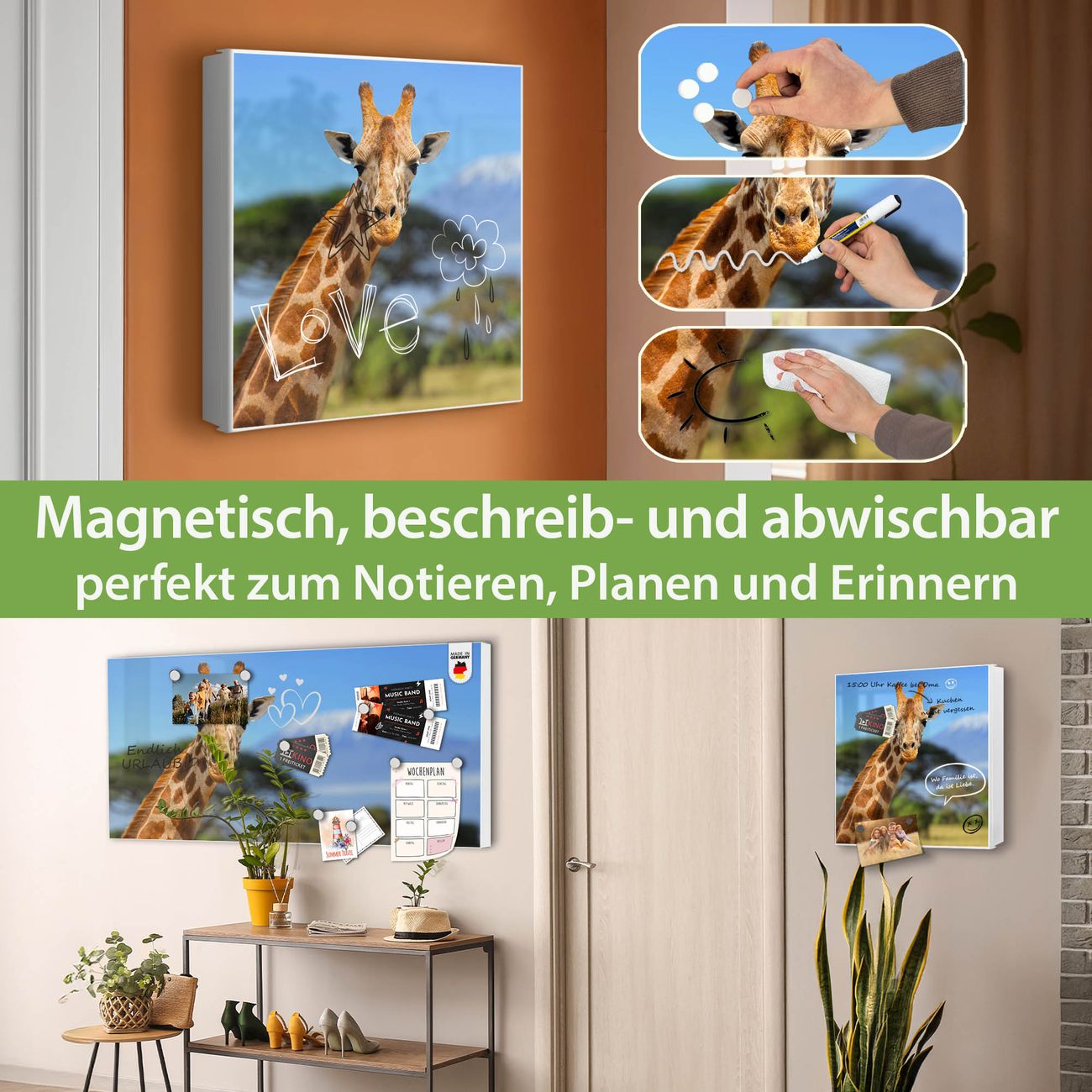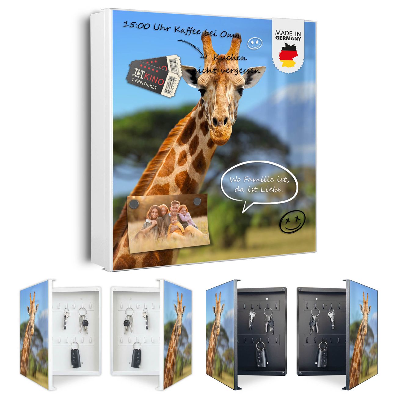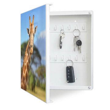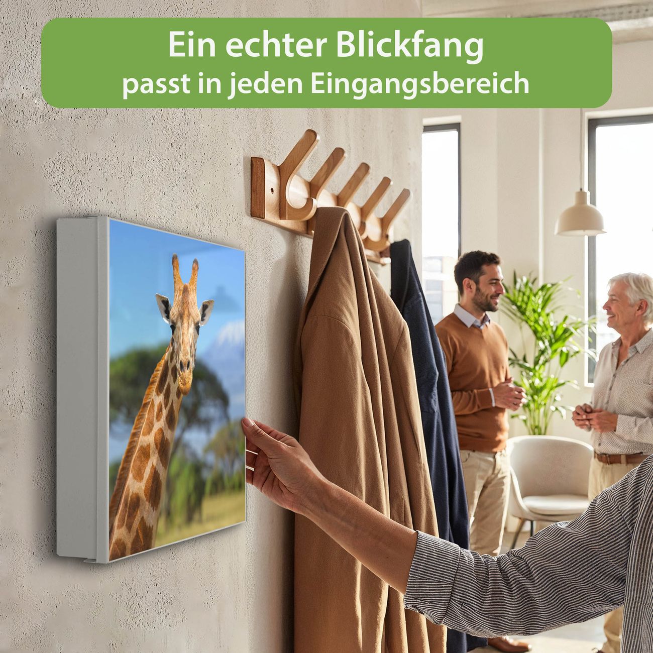 Bringe Ordnung und Eleganz in deinen Eingangsbereich mit dem banjado Schlüsselkasten Motiv Motiv Miss Kilimandscharo. Die moderne Schlüsselbox kombiniert funktionales Design mit hochwertiger Verarbeitung und wird so zu einem echten Hingucker in Flur, Büro oder Ferienwohnung. ✅ Stilvolle Schlüsselaufbewahrung mit Motiv Motiv Miss Kilimandscharo Der Design-Schlüsselkasten Motiv Motiv Miss Kilimandscharo bietet Platz für bis zu 32 Schlüssel, die auf 4 stabilen Reihen mit je 8 Haken übersichtlich verstaut werden. Mit seinen kompakten Maßen von 30 x 30 x 5 cm passt die Schlüsselbox perfekt auch in kleinere Räume. Der weiß lackierte Stahlkorpus mit links angeschlagenem Türscharnier harmoniert mit gedruckten Folie auf der Front und fügt sich nahtlos in jedes Wohnambiente ein. Ob als Schlüsselorganizer für Zuhause oder als praktische Lösung für Büros, Praxen und Gewerbe, der banjado Schlüsselkasten sorgt für Ordnung und Übersicht. Dank der magnetischen, mit Kreidestiften beschreibbaren Folie auf der Front kannst du Notizen anheften oder Termine direkt auf der Oberfläche festhalten. Die Schlüsselbox Motiv Motiv Miss Kilimandscharo zur Wandmontage wird inklusive Befestigungsmaterial geliefert und ist schnell angebracht. So hast du deine Schlüssel jederzeit griffbereit und zugleich stilvoll verstaut. Mit diesem banjado Schlüsselkasten Motiv Motiv Miss Kilimandscharo kombinierst du praktische Aufbewahrung mit stilvollem Wohndesign. Ob privat oder geschäftlich, die Schlüsselbox sorgt für mehr Ordnung, Übersicht und ein wohnliches Ambiente.Vorteile im Überblick