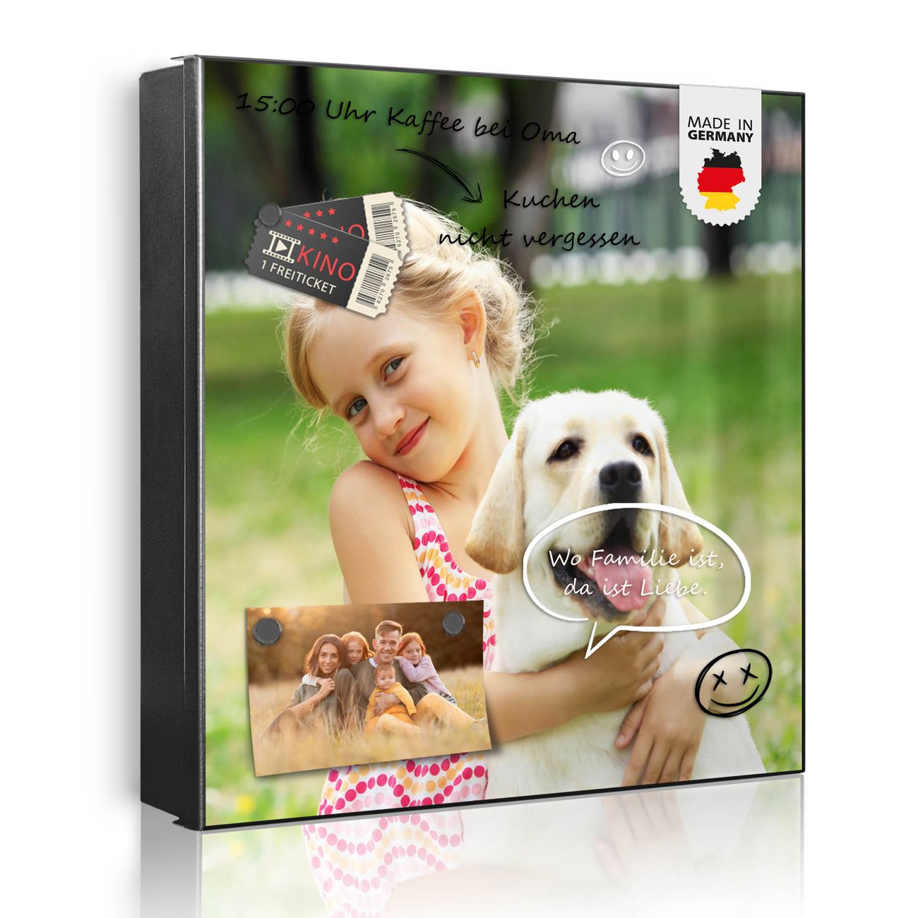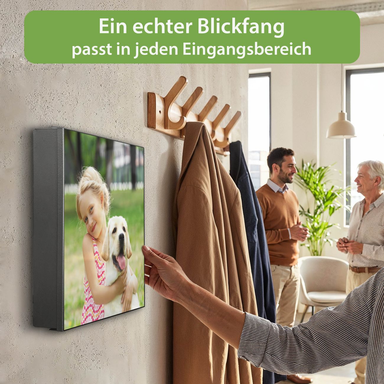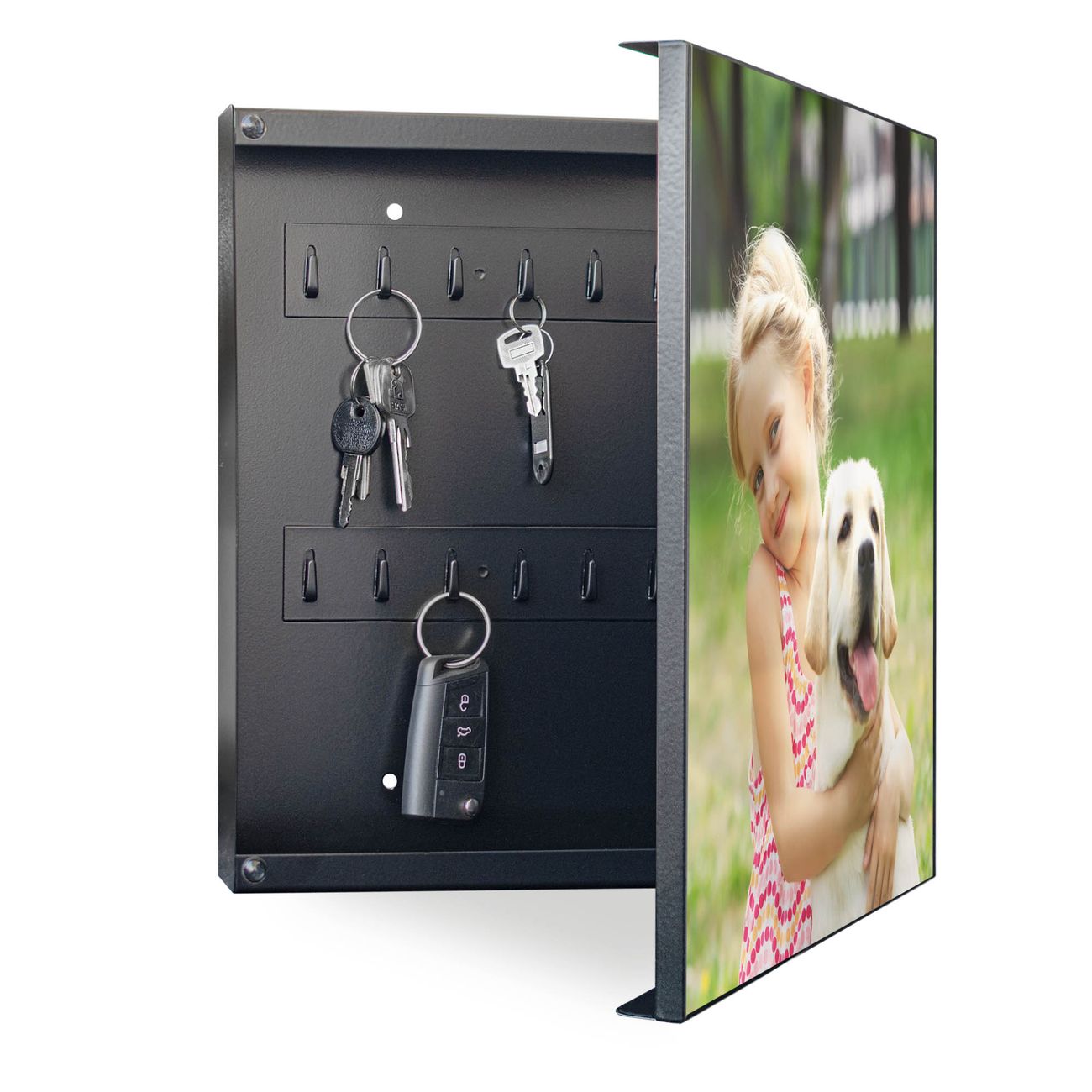 Bringe Ordnung und Eleganz in deinen Eingangsbereich mit dem banjado Schlüsselkasten Motiv Motiv Wunschmotiv. Die moderne Schlüsselbox kombiniert funktionales Design mit hochwertiger Verarbeitung und wird so zu einem echten Hingucker in Flur, Büro oder Ferienwohnung. ✅ Stilvolle Schlüsselaufbewahrung mit Motiv Motiv Wunschmotiv Der Design-Schlüsselkasten Motiv Motiv Wunschmotiv bietet Platz für bis zu 32 Schlüssel, die auf 4 stabilen Reihen mit je 8 Haken übersichtlich verstaut werden. Mit seinen kompakten Maßen von 30 x 30 x 5 cm passt die Schlüsselbox perfekt auch in kleinere Räume. Der schwarz lackierte Stahlkorpus mit rechts angeschlagenem Türscharnier harmoniert mit gedruckten Folie auf der Front und fügt sich nahtlos in jedes Wohnambiente ein. Ob als Schlüsselorganizer für Zuhause oder als praktische Lösung für Büros, Praxen und Gewerbe, der banjado Schlüsselkasten sorgt für Ordnung und Übersicht. Dank der magnetischen, mit Kreidestiften beschreibbaren Folie auf der Front kannst du Notizen anheften oder Termine direkt auf der Oberfläche festhalten. Die Schlüsselbox Motiv Motiv Wunschmotiv zur Wandmontage wird inklusive Befestigungsmaterial geliefert und ist schnell angebracht. So hast du deine Schlüssel jederzeit griffbereit und zugleich stilvoll verstaut. Mit diesem banjado Schlüsselkasten Motiv Motiv Wunschmotiv kombinierst du praktische Aufbewahrung mit stilvollem Wohndesign. Ob privat oder geschäftlich, die Schlüsselbox sorgt für mehr Ordnung, Übersicht und ein wohnliches Ambiente.Vorteile im Überblick