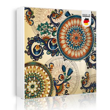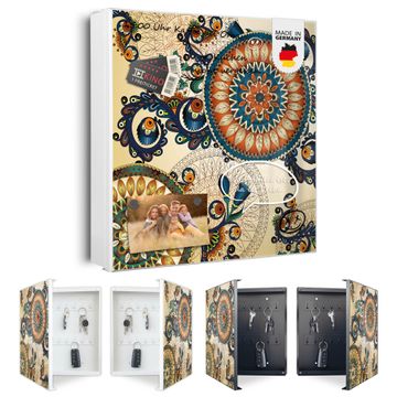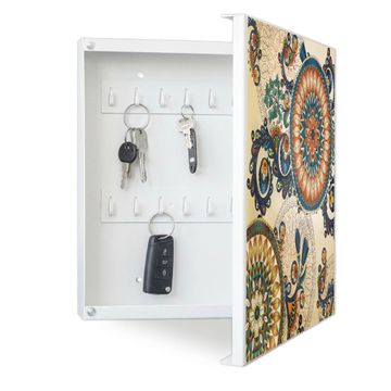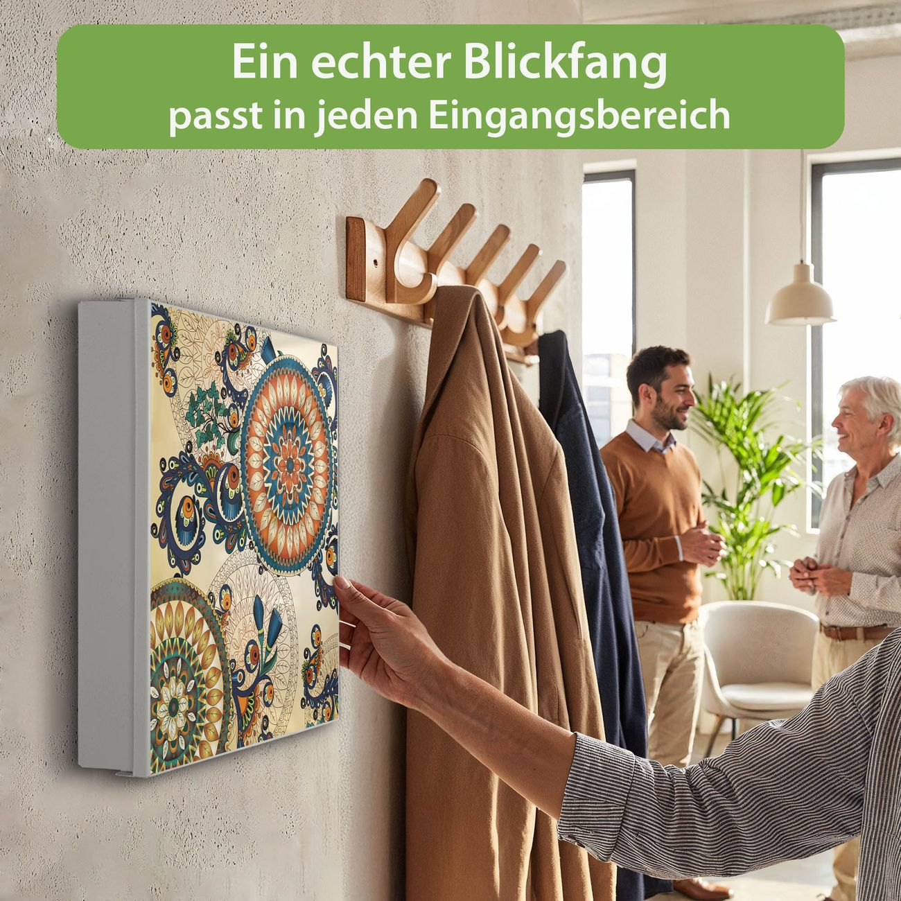 Bringe Ordnung und Eleganz in deinen Eingangsbereich mit dem banjado Schlüsselkasten Motiv Motiv Modernes Mandala. Die moderne Schlüsselbox kombiniert funktionales Design mit hochwertiger Verarbeitung und wird so zu einem echten Hingucker in Flur, Büro oder Ferienwohnung. ✅ Stilvolle Schlüsselaufbewahrung mit Motiv Motiv Modernes Mandala Der Design-Schlüsselkasten Motiv Motiv Modernes Mandala bietet Platz für bis zu 32 Schlüssel, die auf 4 stabilen Reihen mit je 8 Haken übersichtlich verstaut werden. Mit seinen kompakten Maßen von 30 x 30 x 5 cm passt die Schlüsselbox perfekt auch in kleinere Räume. Der weiß lackierte Stahlkorpus mit rechts angeschlagenem Türscharnier harmoniert mit gedruckten Folie auf der Front und fügt sich nahtlos in jedes Wohnambiente ein. Ob als Schlüsselorganizer für Zuhause oder als praktische Lösung für Büros, Praxen und Gewerbe, der banjado Schlüsselkasten sorgt für Ordnung und Übersicht. Dank der magnetischen, mit Kreidestiften beschreibbaren Folie auf der Front kannst du Notizen anheften oder Termine direkt auf der Oberfläche festhalten. Die Schlüsselbox Motiv Motiv Modernes Mandala zur Wandmontage wird inklusive Befestigungsmaterial geliefert und ist schnell angebracht. So hast du deine Schlüssel jederzeit griffbereit und zugleich stilvoll verstaut. Mit diesem banjado Schlüsselkasten Motiv Motiv Modernes Mandala kombinierst du praktische Aufbewahrung mit stilvollem Wohndesign. Ob privat oder geschäftlich, die Schlüsselbox sorgt für mehr Ordnung, Übersicht und ein wohnliches Ambiente.Vorteile im Überblick