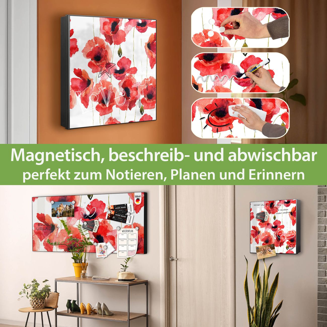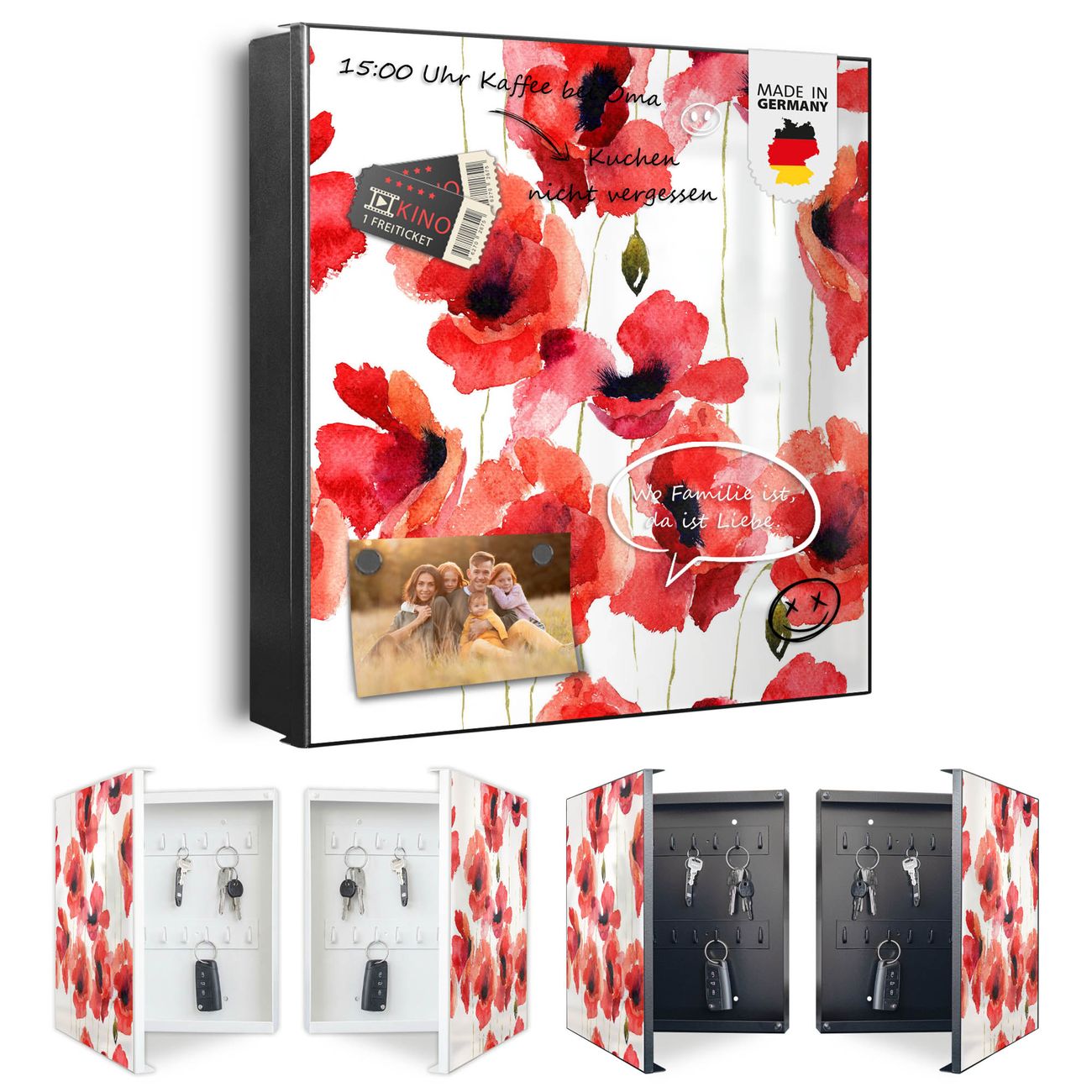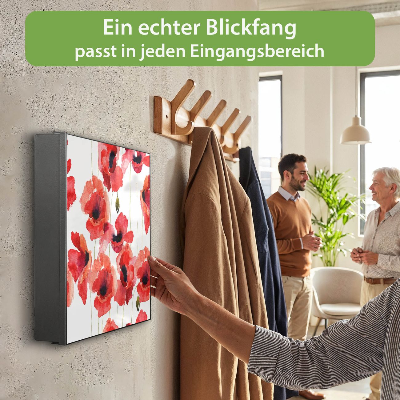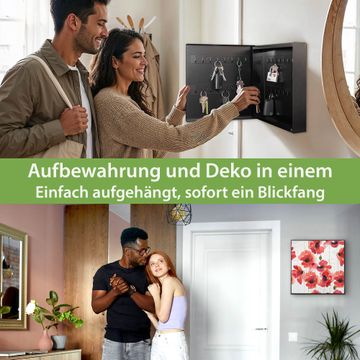 Bringe Ordnung und Eleganz in deinen Eingangsbereich mit dem banjado Schlüsselkasten Motiv Motiv Mohn Aquarell. Die moderne Schlüsselbox kombiniert funktionales Design mit hochwertiger Verarbeitung und wird so zu einem echten Hingucker in Flur, Büro oder Ferienwohnung. ✅ Stilvolle Schlüsselaufbewahrung mit Motiv Motiv Mohn Aquarell Der Design-Schlüsselkasten Motiv Motiv Mohn Aquarell bietet Platz für bis zu 32 Schlüssel, die auf 4 stabilen Reihen mit je 8 Haken übersichtlich verstaut werden. Mit seinen kompakten Maßen von 30 x 30 x 5 cm passt die Schlüsselbox perfekt auch in kleinere Räume. Der schwarz lackierte Stahlkorpus mit rechts angeschlagenem Türscharnier harmoniert mit gedruckten Folie auf der Front und fügt sich nahtlos in jedes Wohnambiente ein. Ob als Schlüsselorganizer für Zuhause oder als praktische Lösung für Büros, Praxen und Gewerbe, der banjado Schlüsselkasten sorgt für Ordnung und Übersicht. Dank der magnetischen, mit Kreidestiften beschreibbaren Folie auf der Front kannst du Notizen anheften oder Termine direkt auf der Oberfläche festhalten. Die Schlüsselbox Motiv Motiv Mohn Aquarell zur Wandmontage wird inklusive Befestigungsmaterial geliefert und ist schnell angebracht. So hast du deine Schlüssel jederzeit griffbereit und zugleich stilvoll verstaut. Mit diesem banjado Schlüsselkasten Motiv Motiv Mohn Aquarell kombinierst du praktische Aufbewahrung mit stilvollem Wohndesign. Ob privat oder geschäftlich, die Schlüsselbox sorgt für mehr Ordnung, Übersicht und ein wohnliches Ambiente.Vorteile im Überblick