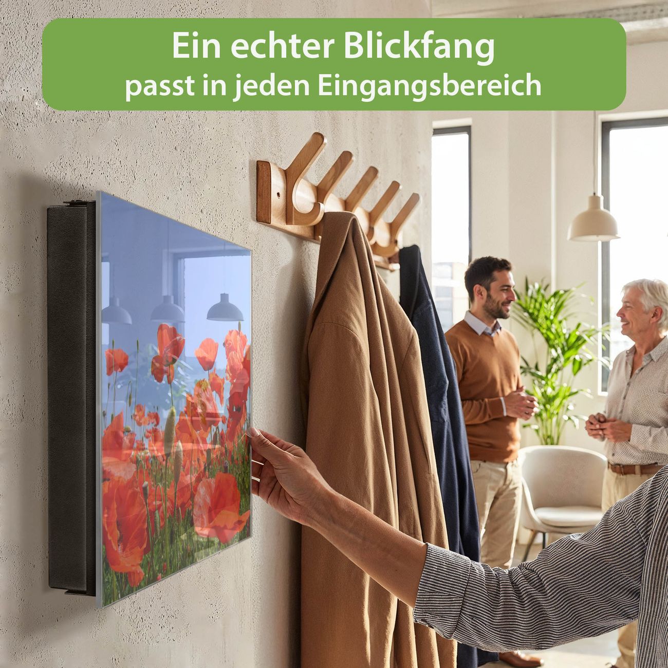 Bringe Ordnung und Eleganz in deinen Eingangsbereich mit dem banjado Schlüsselkasten Motiv Motiv Mohnblumen. Die moderne Schlüsselbox kombiniert funktionales Design mit hochwertiger Verarbeitung und wird so zu einem echten Hingucker in Flur, Büro oder Ferienwohnung. ✅ Stilvolle Schlüsselaufbewahrung mit Glasfront im Motiv Motiv Mohnblumen Der Design-Schlüsselkasten Motiv Motiv Mohnblumen bietet Platz für bis zu 50 Schlüssel, die auf 5 stabilen Reihen mit je 10 Haken übersichtlich verstaut werden. Mit seinen kompakten Maßen von 30 x 30 x 5 cm passt die Schlüsselbox perfekt auch in kleinere Räume. Der schwarz lackierte Stahlkorpus mit rechts angeschlagenem Türscharnier harmoniert mit der Glasfront und fügt sich nahtlos in jedes Wohnambiente ein. Ob als Schlüsselorganizer für Zuhause oder als praktische Lösung für Büros, Praxen und Gewerbe, der banjado Schlüsselkasten sorgt für Ordnung und Übersicht. Dank der magnetischen, mit Kreidestiften beschreibbaren Glasfront kannst du Notizen anheften oder Termine direkt auf der Oberfläche festhalten. Die Schlüsselbox Motiv Motiv Mohnblumen zur Wandmontage wird inklusive Befestigungsmaterial geliefert und ist schnell angebracht. So hast du deine Schlüssel jederzeit griffbereit und zugleich stilvoll verstaut. Mit diesem banjado Schlüsselkasten Motiv Motiv Mohnblumen kombinierst du praktische Aufbewahrung mit stilvollem Wohndesign. Ob privat oder geschäftlich, die Schlüsselbox sorgt für mehr Ordnung, Übersicht und ein wohnliches Ambiente.Vorteile im Überblick