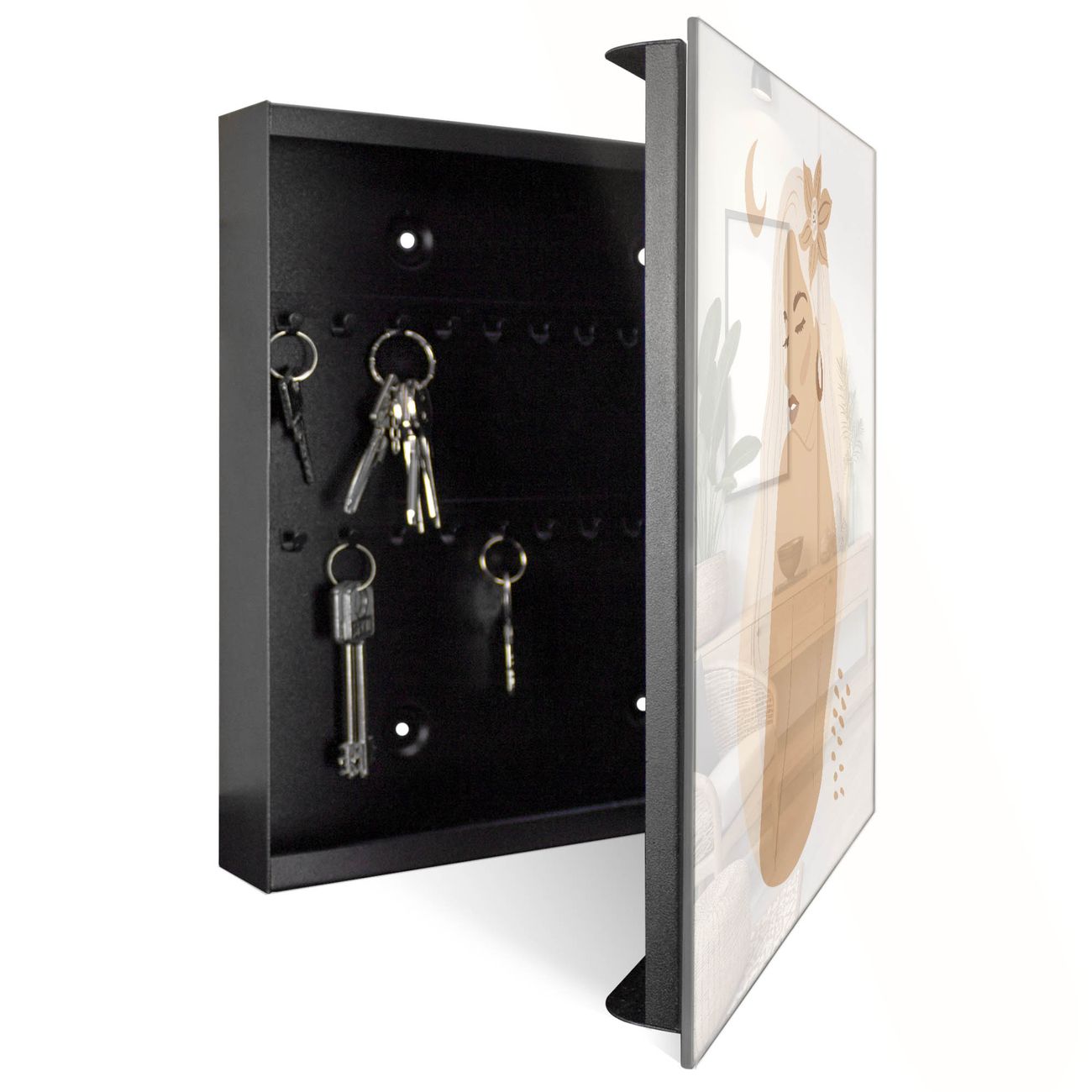 Bringe Ordnung und Eleganz in deinen Eingangsbereich mit dem banjado Schlüsselkasten Motiv Motiv Mondblumenfrau. Die moderne Schlüsselbox kombiniert funktionales Design mit hochwertiger Verarbeitung und wird so zu einem echten Hingucker in Flur, Büro oder Ferienwohnung. ✅ Stilvolle Schlüsselaufbewahrung mit Glasfront im Motiv Motiv Mondblumenfrau Der Design-Schlüsselkasten Motiv Motiv Mondblumenfrau bietet Platz für bis zu 50 Schlüssel, die auf 5 stabilen Reihen mit je 10 Haken übersichtlich verstaut werden. Mit seinen kompakten Maßen von 30 x 30 x 5 cm passt die Schlüsselbox perfekt auch in kleinere Räume. Der schwarz lackierte Stahlkorpus mit rechts angeschlagenem Türscharnier harmoniert mit der Glasfront und fügt sich nahtlos in jedes Wohnambiente ein. Ob als Schlüsselorganizer für Zuhause oder als praktische Lösung für Büros, Praxen und Gewerbe, der banjado Schlüsselkasten sorgt für Ordnung und Übersicht. Dank der magnetischen, mit Kreidestiften beschreibbaren Glasfront kannst du Notizen anheften oder Termine direkt auf der Oberfläche festhalten. Die Schlüsselbox Motiv Motiv Mondblumenfrau zur Wandmontage wird inklusive Befestigungsmaterial geliefert und ist schnell angebracht. So hast du deine Schlüssel jederzeit griffbereit und zugleich stilvoll verstaut. Mit diesem banjado Schlüsselkasten Motiv Motiv Mondblumenfrau kombinierst du praktische Aufbewahrung mit stilvollem Wohndesign. Ob privat oder geschäftlich, die Schlüsselbox sorgt für mehr Ordnung, Übersicht und ein wohnliches Ambiente.Vorteile im Überblick
