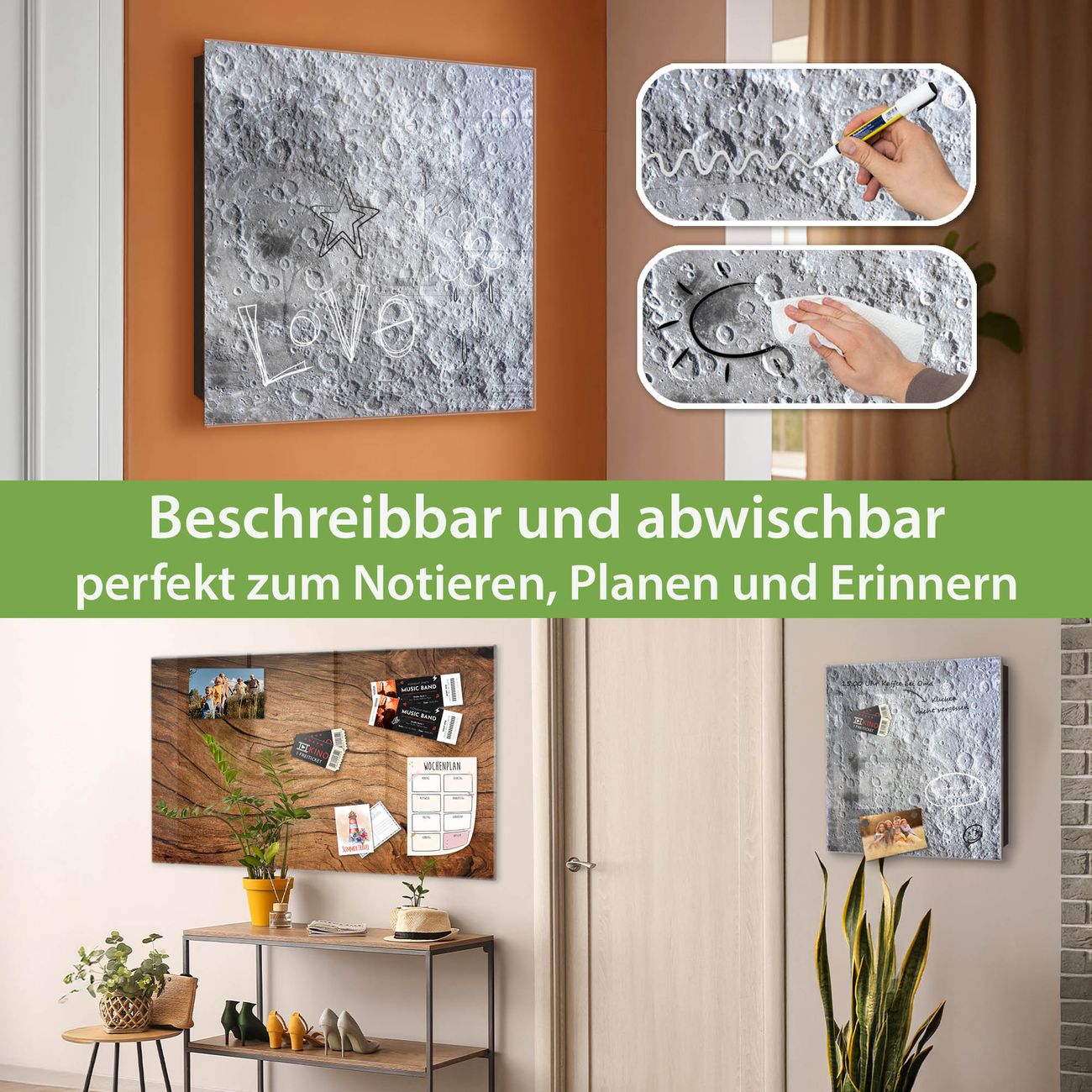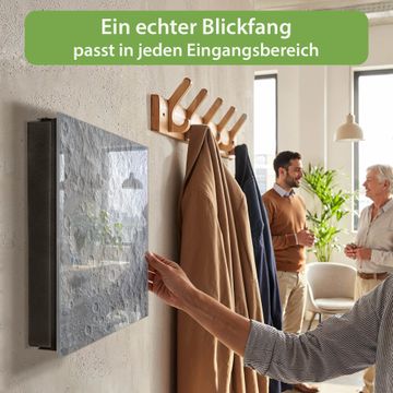 Bringe Ordnung und Eleganz in deinen Eingangsbereich mit dem banjado Schlüsselkasten Motiv Motiv Mondoberfläche. Die moderne Schlüsselbox kombiniert funktionales Design mit hochwertiger Verarbeitung und wird so zu einem echten Hingucker in Flur, Büro oder Ferienwohnung. ✅ Stilvolle Schlüsselaufbewahrung mit Glasfront im Motiv Motiv Mondoberfläche Der Design-Schlüsselkasten Motiv Motiv Mondoberfläche bietet Platz für bis zu 50 Schlüssel, die auf 5 stabilen Reihen mit je 10 Haken übersichtlich verstaut werden. Mit seinen kompakten Maßen von 30 x 30 x 5 cm passt die Schlüsselbox perfekt auch in kleinere Räume. Der schwarz lackierte Stahlkorpus mit rechts angeschlagenem Türscharnier harmoniert mit der Glasfront und fügt sich nahtlos in jedes Wohnambiente ein. Ob als Schlüsselorganizer für Zuhause oder als praktische Lösung für Büros, Praxen und Gewerbe, der banjado Schlüsselkasten sorgt für Ordnung und Übersicht. Dank der magnetischen, mit Kreidestiften beschreibbaren Glasfront kannst du Notizen anheften oder Termine direkt auf der Oberfläche festhalten. Die Schlüsselbox Motiv Motiv Mondoberfläche zur Wandmontage wird inklusive Befestigungsmaterial geliefert und ist schnell angebracht. So hast du deine Schlüssel jederzeit griffbereit und zugleich stilvoll verstaut. Mit diesem banjado Schlüsselkasten Motiv Motiv Mondoberfläche kombinierst du praktische Aufbewahrung mit stilvollem Wohndesign. Ob privat oder geschäftlich, die Schlüsselbox sorgt für mehr Ordnung, Übersicht und ein wohnliches Ambiente.Vorteile im Überblick