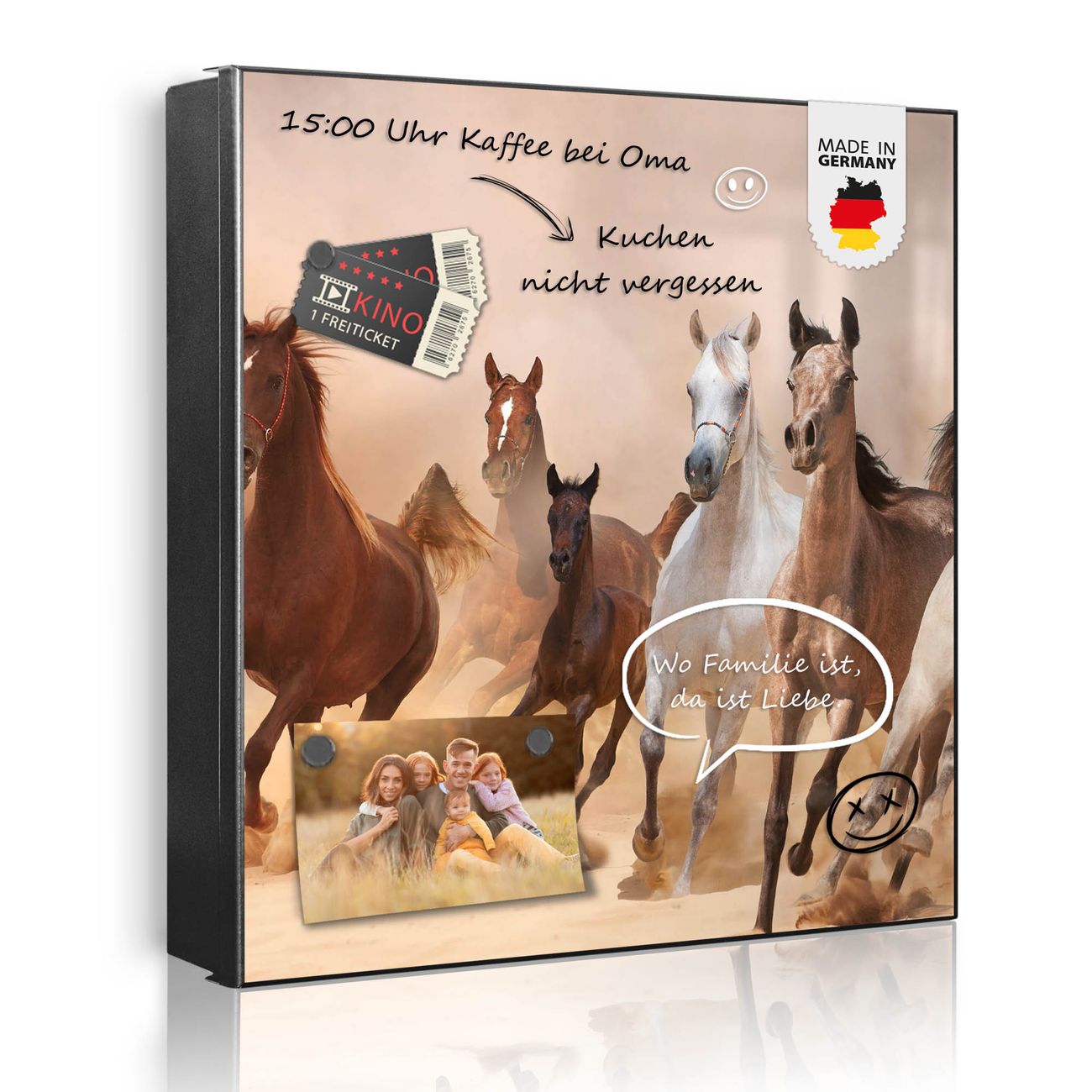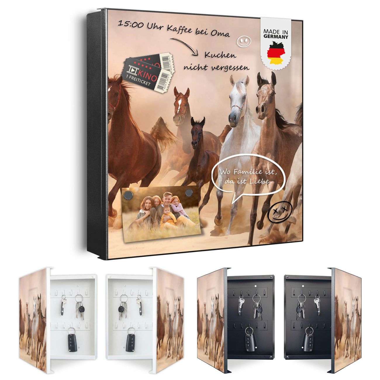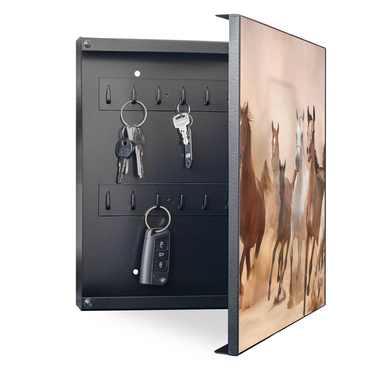 Bringe Ordnung und Eleganz in deinen Eingangsbereich mit dem banjado Schlüsselkasten Motiv Motiv Mongolische Stimmung. Die moderne Schlüsselbox kombiniert funktionales Design mit hochwertiger Verarbeitung und wird so zu einem echten Hingucker in Flur, Büro oder Ferienwohnung. ✅ Stilvolle Schlüsselaufbewahrung mit Motiv Motiv Mongolische Stimmung Der Design-Schlüsselkasten Motiv Motiv Mongolische Stimmung bietet Platz für bis zu 32 Schlüssel, die auf 4 stabilen Reihen mit je 8 Haken übersichtlich verstaut werden. Mit seinen kompakten Maßen von 30 x 30 x 5 cm passt die Schlüsselbox perfekt auch in kleinere Räume. Der schwarz lackierte Stahlkorpus mit rechts angeschlagenem Türscharnier harmoniert mit gedruckten Folie auf der Front und fügt sich nahtlos in jedes Wohnambiente ein. Ob als Schlüsselorganizer für Zuhause oder als praktische Lösung für Büros, Praxen und Gewerbe, der banjado Schlüsselkasten sorgt für Ordnung und Übersicht. Dank der magnetischen, mit Kreidestiften beschreibbaren Folie auf der Front kannst du Notizen anheften oder Termine direkt auf der Oberfläche festhalten. Die Schlüsselbox Motiv Motiv Mongolische Stimmung zur Wandmontage wird inklusive Befestigungsmaterial geliefert und ist schnell angebracht. So hast du deine Schlüssel jederzeit griffbereit und zugleich stilvoll verstaut. Mit diesem banjado Schlüsselkasten Motiv Motiv Mongolische Stimmung kombinierst du praktische Aufbewahrung mit stilvollem Wohndesign. Ob privat oder geschäftlich, die Schlüsselbox sorgt für mehr Ordnung, Übersicht und ein wohnliches Ambiente.Vorteile im Überblick