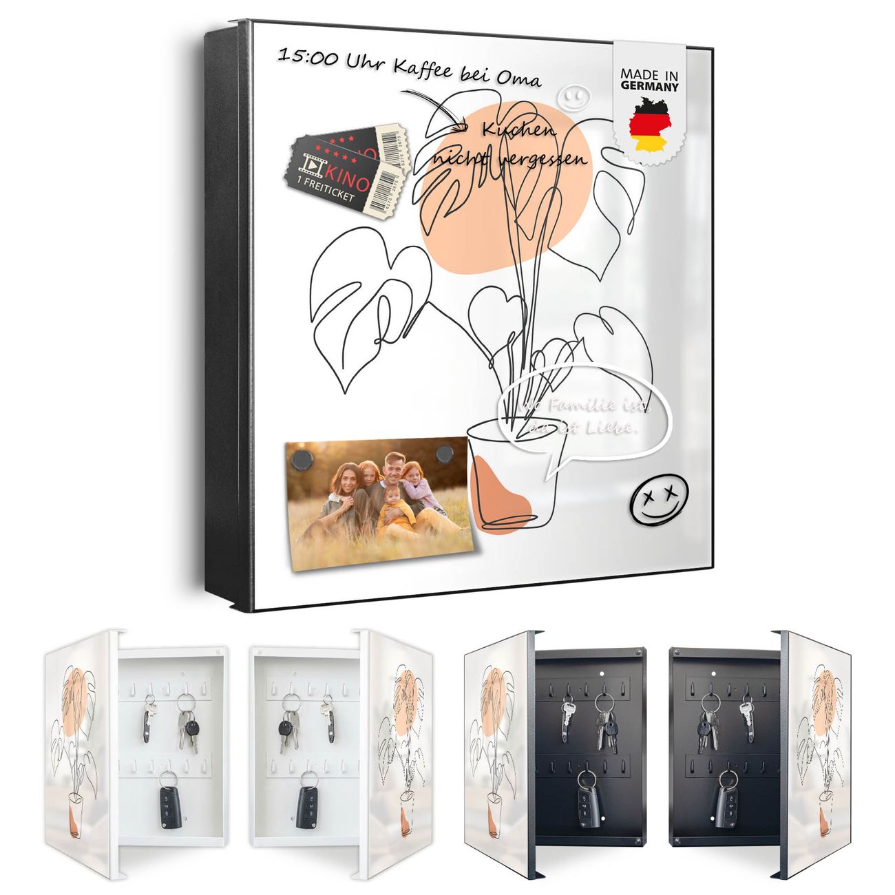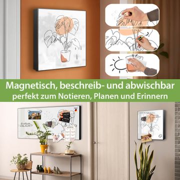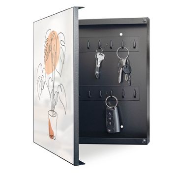 Bringe Ordnung und Eleganz in deinen Eingangsbereich mit dem banjado Schlüsselkasten Motiv Motiv Monstera Lineart. Die moderne Schlüsselbox kombiniert funktionales Design mit hochwertiger Verarbeitung und wird so zu einem echten Hingucker in Flur, Büro oder Ferienwohnung. ✅ Stilvolle Schlüsselaufbewahrung mit Motiv Motiv Monstera Lineart Der Design-Schlüsselkasten Motiv Motiv Monstera Lineart bietet Platz für bis zu 32 Schlüssel, die auf 4 stabilen Reihen mit je 8 Haken übersichtlich verstaut werden. Mit seinen kompakten Maßen von 30 x 30 x 5 cm passt die Schlüsselbox perfekt auch in kleinere Räume. Der schwarz lackierte Stahlkorpus mit links angeschlagenem Türscharnier harmoniert mit gedruckten Folie auf der Front und fügt sich nahtlos in jedes Wohnambiente ein. Ob als Schlüsselorganizer für Zuhause oder als praktische Lösung für Büros, Praxen und Gewerbe, der banjado Schlüsselkasten sorgt für Ordnung und Übersicht. Dank der magnetischen, mit Kreidestiften beschreibbaren Folie auf der Front kannst du Notizen anheften oder Termine direkt auf der Oberfläche festhalten. Die Schlüsselbox Motiv Motiv Monstera Lineart zur Wandmontage wird inklusive Befestigungsmaterial geliefert und ist schnell angebracht. So hast du deine Schlüssel jederzeit griffbereit und zugleich stilvoll verstaut. Mit diesem banjado Schlüsselkasten Motiv Motiv Monstera Lineart kombinierst du praktische Aufbewahrung mit stilvollem Wohndesign. Ob privat oder geschäftlich, die Schlüsselbox sorgt für mehr Ordnung, Übersicht und ein wohnliches Ambiente.Vorteile im Überblick