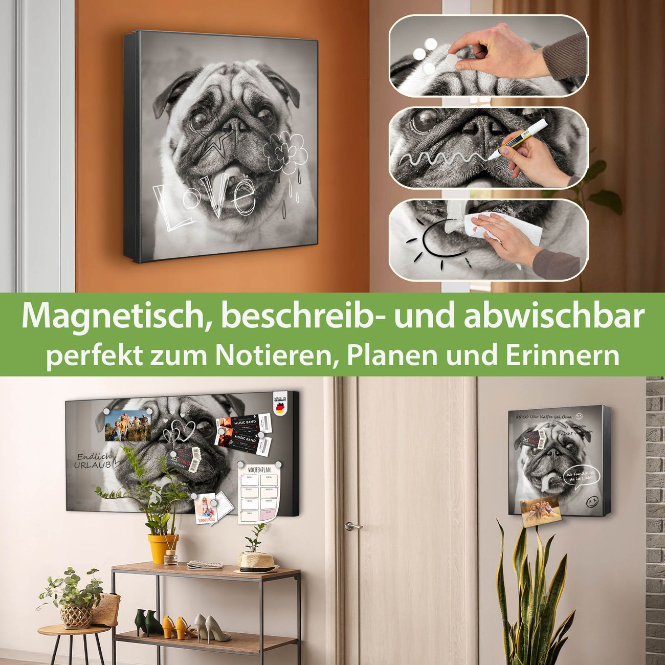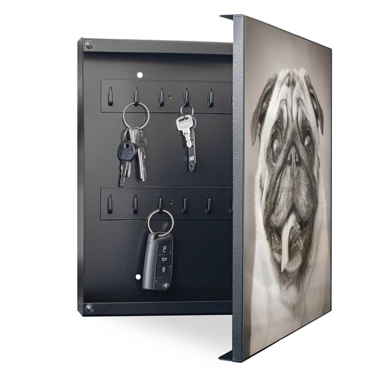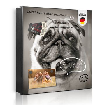 Bringe Ordnung und Eleganz in deinen Eingangsbereich mit dem banjado Schlüsselkasten Motiv Motiv Mops Porträt. Die moderne Schlüsselbox kombiniert funktionales Design mit hochwertiger Verarbeitung und wird so zu einem echten Hingucker in Flur, Büro oder Ferienwohnung. ✅ Stilvolle Schlüsselaufbewahrung mit Motiv Motiv Mops Porträt Der Design-Schlüsselkasten Motiv Motiv Mops Porträt bietet Platz für bis zu 32 Schlüssel, die auf 4 stabilen Reihen mit je 8 Haken übersichtlich verstaut werden. Mit seinen kompakten Maßen von 30 x 30 x 5 cm passt die Schlüsselbox perfekt auch in kleinere Räume. Der schwarz lackierte Stahlkorpus mit rechts angeschlagenem Türscharnier harmoniert mit gedruckten Folie auf der Front und fügt sich nahtlos in jedes Wohnambiente ein. Ob als Schlüsselorganizer für Zuhause oder als praktische Lösung für Büros, Praxen und Gewerbe, der banjado Schlüsselkasten sorgt für Ordnung und Übersicht. Dank der magnetischen, mit Kreidestiften beschreibbaren Folie auf der Front kannst du Notizen anheften oder Termine direkt auf der Oberfläche festhalten. Die Schlüsselbox Motiv Motiv Mops Porträt zur Wandmontage wird inklusive Befestigungsmaterial geliefert und ist schnell angebracht. So hast du deine Schlüssel jederzeit griffbereit und zugleich stilvoll verstaut. Mit diesem banjado Schlüsselkasten Motiv Motiv Mops Porträt kombinierst du praktische Aufbewahrung mit stilvollem Wohndesign. Ob privat oder geschäftlich, die Schlüsselbox sorgt für mehr Ordnung, Übersicht und ein wohnliches Ambiente.Vorteile im Überblick
