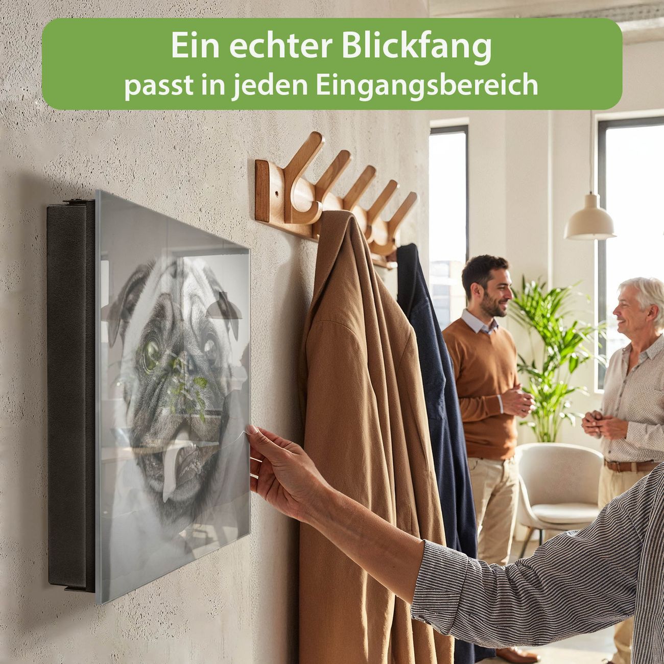 Bringe Ordnung und Eleganz in deinen Eingangsbereich mit dem banjado Schlüsselkasten Motiv Motiv Mops Porträt. Die moderne Schlüsselbox kombiniert funktionales Design mit hochwertiger Verarbeitung und wird so zu einem echten Hingucker in Flur, Büro oder Ferienwohnung. ✅ Stilvolle Schlüsselaufbewahrung mit Glasfront im Motiv Motiv Mops Porträt Der Design-Schlüsselkasten Motiv Motiv Mops Porträt bietet Platz für bis zu 50 Schlüssel, die auf 5 stabilen Reihen mit je 10 Haken übersichtlich verstaut werden. Mit seinen kompakten Maßen von 30 x 30 x 5 cm passt die Schlüsselbox perfekt auch in kleinere Räume. Der schwarz lackierte Stahlkorpus mit rechts angeschlagenem Türscharnier harmoniert mit der Glasfront und fügt sich nahtlos in jedes Wohnambiente ein. Ob als Schlüsselorganizer für Zuhause oder als praktische Lösung für Büros, Praxen und Gewerbe, der banjado Schlüsselkasten sorgt für Ordnung und Übersicht. Dank der magnetischen, mit Kreidestiften beschreibbaren Glasfront kannst du Notizen anheften oder Termine direkt auf der Oberfläche festhalten. Die Schlüsselbox Motiv Motiv Mops Porträt zur Wandmontage wird inklusive Befestigungsmaterial geliefert und ist schnell angebracht. So hast du deine Schlüssel jederzeit griffbereit und zugleich stilvoll verstaut. Mit diesem banjado Schlüsselkasten Motiv Motiv Mops Porträt kombinierst du praktische Aufbewahrung mit stilvollem Wohndesign. Ob privat oder geschäftlich, die Schlüsselbox sorgt für mehr Ordnung, Übersicht und ein wohnliches Ambiente.Vorteile im Überblick