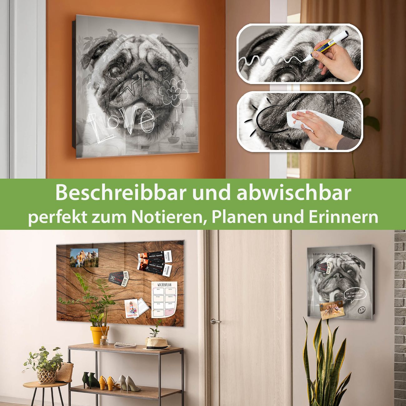 ✅ Magnetisch und mit Kreidestift beschreibbar, gehärtetes Glas, links angeschlagene TürOrdnung und Design in einem