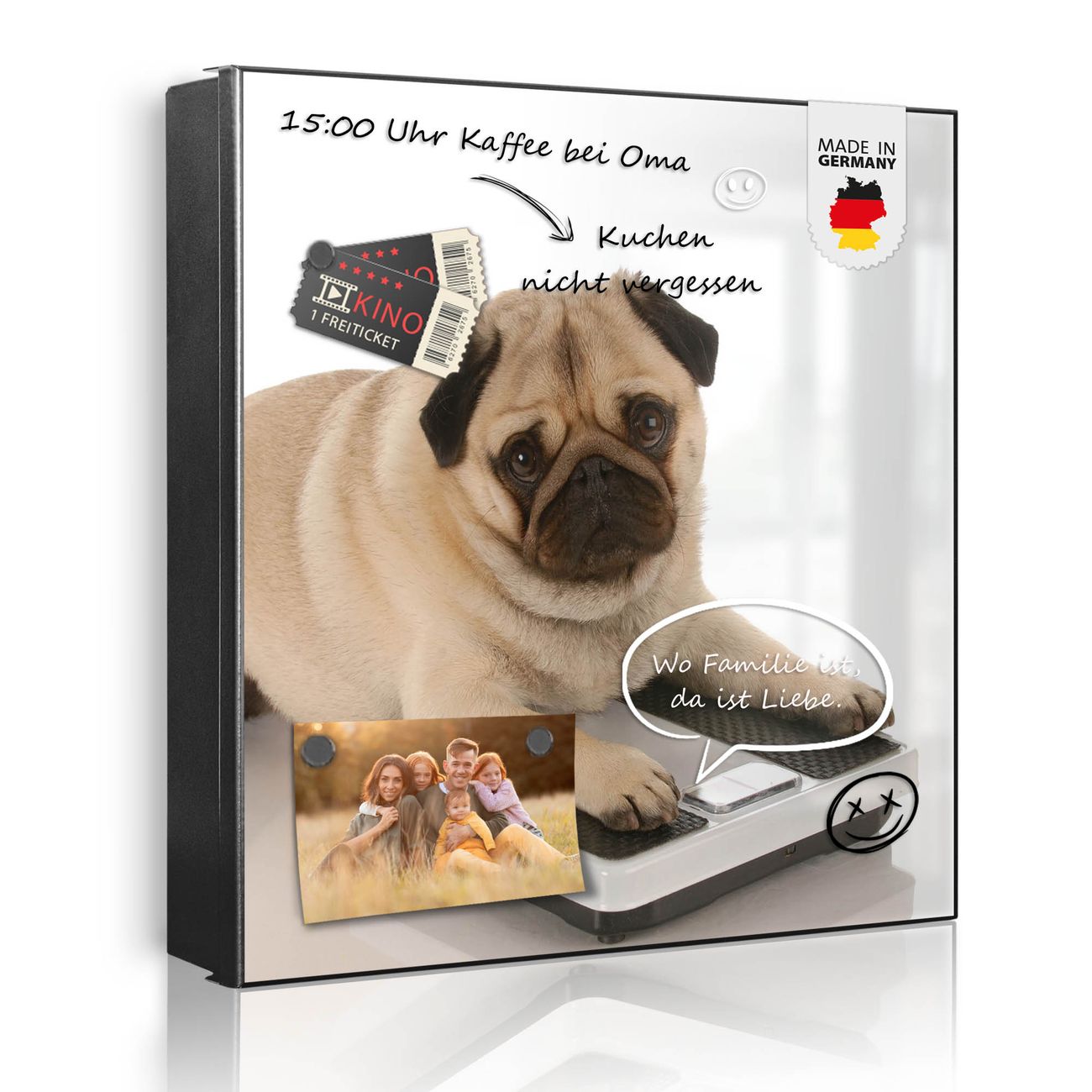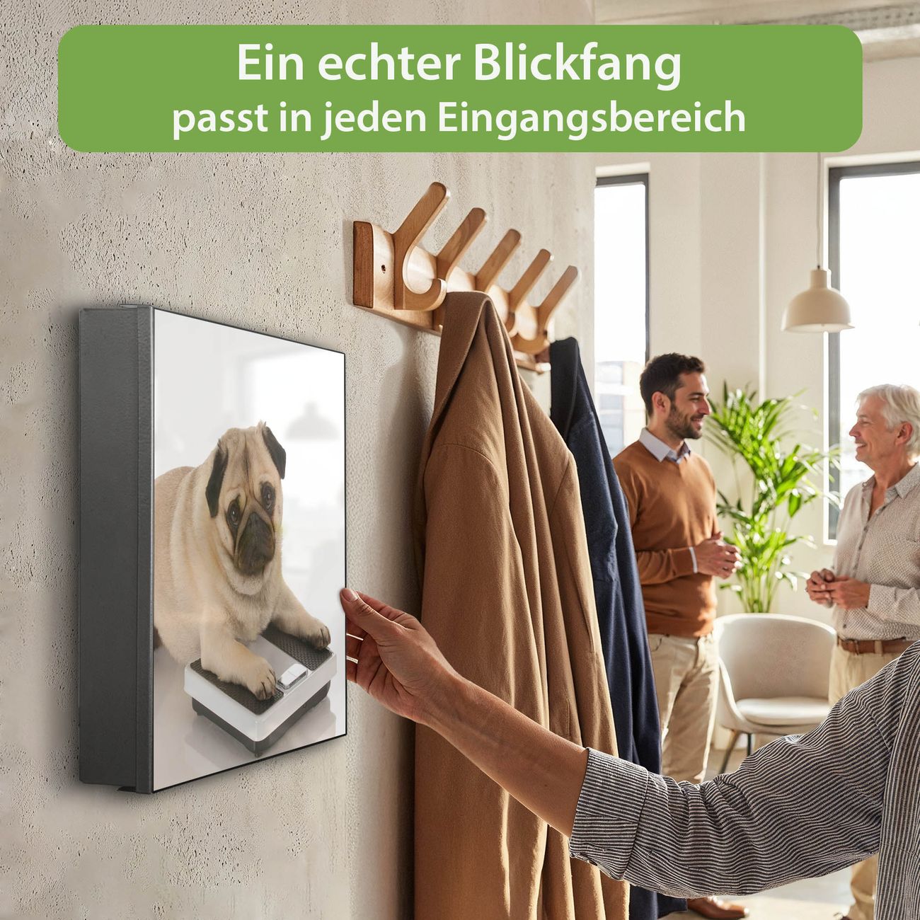 Bringe Ordnung und Eleganz in deinen Eingangsbereich mit dem banjado Schlüsselkasten Motiv Motiv Mops. Die moderne Schlüsselbox kombiniert funktionales Design mit hochwertiger Verarbeitung und wird so zu einem echten Hingucker in Flur, Büro oder Ferienwohnung. ✅ Stilvolle Schlüsselaufbewahrung mit Motiv Motiv Mops Der Design-Schlüsselkasten Motiv Motiv Mops bietet Platz für bis zu 32 Schlüssel, die auf 4 stabilen Reihen mit je 8 Haken übersichtlich verstaut werden. Mit seinen kompakten Maßen von 30 x 30 x 5 cm passt die Schlüsselbox perfekt auch in kleinere Räume. Der schwarz lackierte Stahlkorpus mit links angeschlagenem Türscharnier harmoniert mit gedruckten Folie auf der Front und fügt sich nahtlos in jedes Wohnambiente ein. Ob als Schlüsselorganizer für Zuhause oder als praktische Lösung für Büros, Praxen und Gewerbe, der banjado Schlüsselkasten sorgt für Ordnung und Übersicht. Dank der magnetischen, mit Kreidestiften beschreibbaren Folie auf der Front kannst du Notizen anheften oder Termine direkt auf der Oberfläche festhalten. Die Schlüsselbox Motiv Motiv Mops zur Wandmontage wird inklusive Befestigungsmaterial geliefert und ist schnell angebracht. So hast du deine Schlüssel jederzeit griffbereit und zugleich stilvoll verstaut. Mit diesem banjado Schlüsselkasten Motiv Motiv Mops kombinierst du praktische Aufbewahrung mit stilvollem Wohndesign. Ob privat oder geschäftlich, die Schlüsselbox sorgt für mehr Ordnung, Übersicht und ein wohnliches Ambiente.Vorteile im Überblick