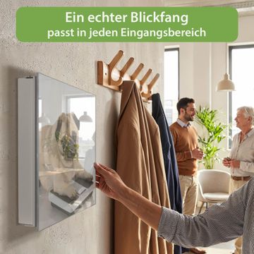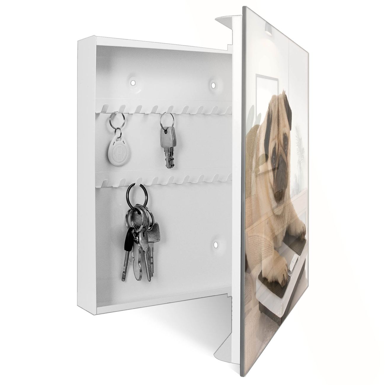 Bringe Ordnung und Eleganz in deinen Eingangsbereich mit dem banjado Schlüsselkasten Motiv Motiv Mops. Die moderne Schlüsselbox kombiniert funktionales Design mit hochwertiger Verarbeitung und wird so zu einem echten Hingucker in Flur, Büro oder Ferienwohnung. ✅ Stilvolle Schlüsselaufbewahrung mit Glasfront im Motiv Motiv Mops Der Design-Schlüsselkasten Motiv Motiv Mops bietet Platz für bis zu 50 Schlüssel, die auf 5 stabilen Reihen mit je 10 Haken übersichtlich verstaut werden. Mit seinen kompakten Maßen von 30 x 30 x 5 cm passt die Schlüsselbox perfekt auch in kleinere Räume. Der weiß lackierte Stahlkorpus mit rechts angeschlagenem Türscharnier harmoniert mit der Glasfront und fügt sich nahtlos in jedes Wohnambiente ein. Ob als Schlüsselorganizer für Zuhause oder als praktische Lösung für Büros, Praxen und Gewerbe, der banjado Schlüsselkasten sorgt für Ordnung und Übersicht. Dank der magnetischen, mit Kreidestiften beschreibbaren Glasfront kannst du Notizen anheften oder Termine direkt auf der Oberfläche festhalten. Die Schlüsselbox Motiv Motiv Mops zur Wandmontage wird inklusive Befestigungsmaterial geliefert und ist schnell angebracht. So hast du deine Schlüssel jederzeit griffbereit und zugleich stilvoll verstaut. Mit diesem banjado Schlüsselkasten Motiv Motiv Mops kombinierst du praktische Aufbewahrung mit stilvollem Wohndesign. Ob privat oder geschäftlich, die Schlüsselbox sorgt für mehr Ordnung, Übersicht und ein wohnliches Ambiente.Vorteile im Überblick
